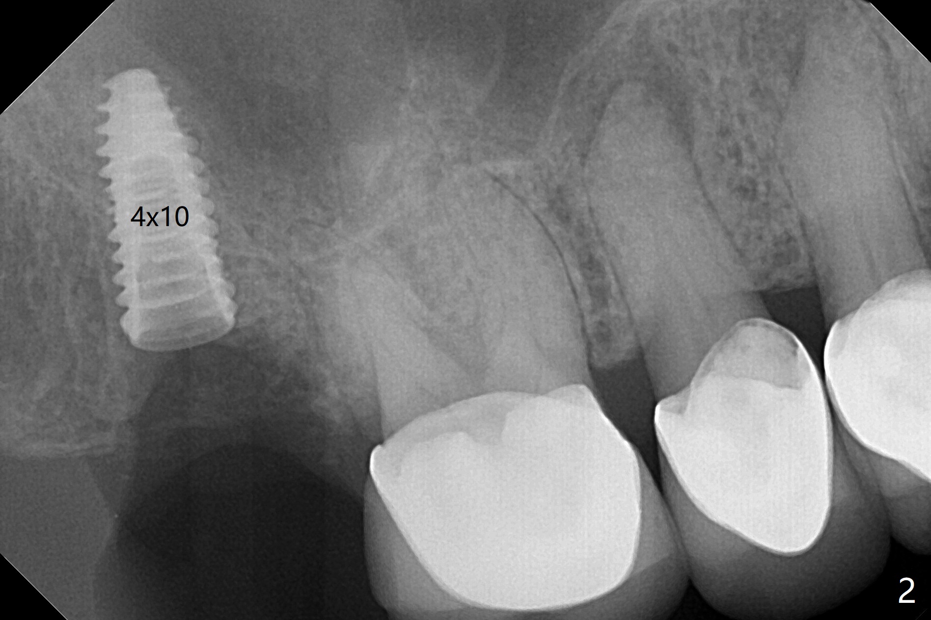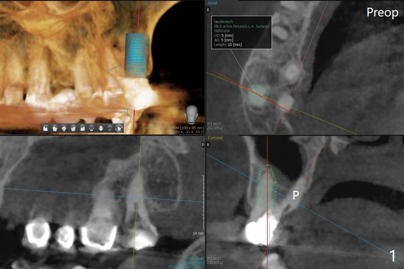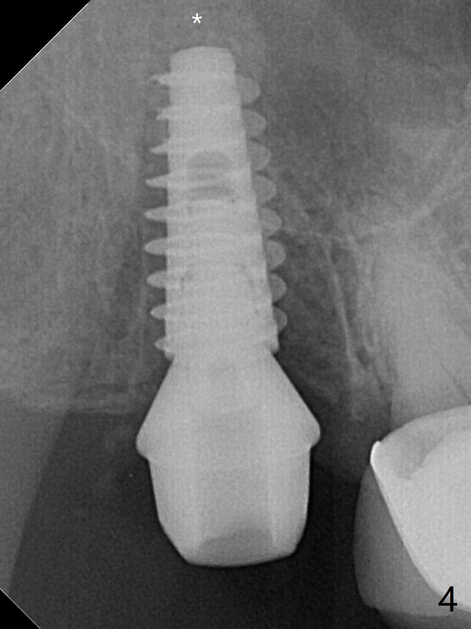 When the tooth #2 is extracted, there is sinus perforation in the palatal apex, consistent with preop CT (Fig.1: P). There is no bone shaving associated with drill sequence in the buccal socket (until 3.5x8.5 mm). With sticky bone and 4.5x10 mm IS dummy implant, sinus lift does not happen. Sinus floor perforation is felt when a 2.2x10 mm drill is used slowly. But air leaks from the palatal socket. With bone graft, a 4x10 mm dummy implant lifts the sinus (Fig.2). After further graft and 4.5x10 mm dummy implant, a 5x11 mm final implant is placed with 15 Ncm with sinus lift (Fig.3,4 *). Following abutment insertion, sticky bone is packed around the implant and abutment (Fig.5,6 S). Prior to final implant placement, a small piece of PRF and collagen and Osteogen Plugs are placed in the palatal socket for repair. Before discharge, there is mild nasal hemorrhage.