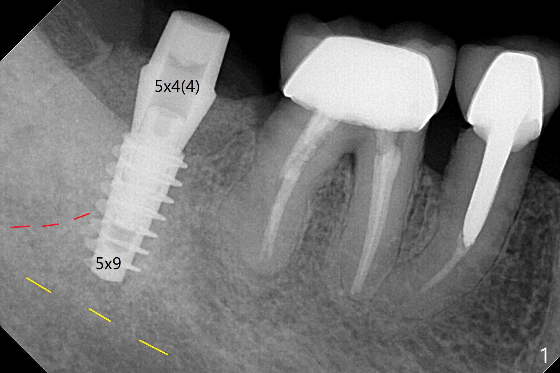 31号牙拔牙后根尖肉芽组织多,病人怕痛,局麻药用的多,而且需要阻滞。不过在导板帮助下,植体还是种在牙槽窝近中斜坡上(图一:红虚线(黄虚线(下齿槽管)))。