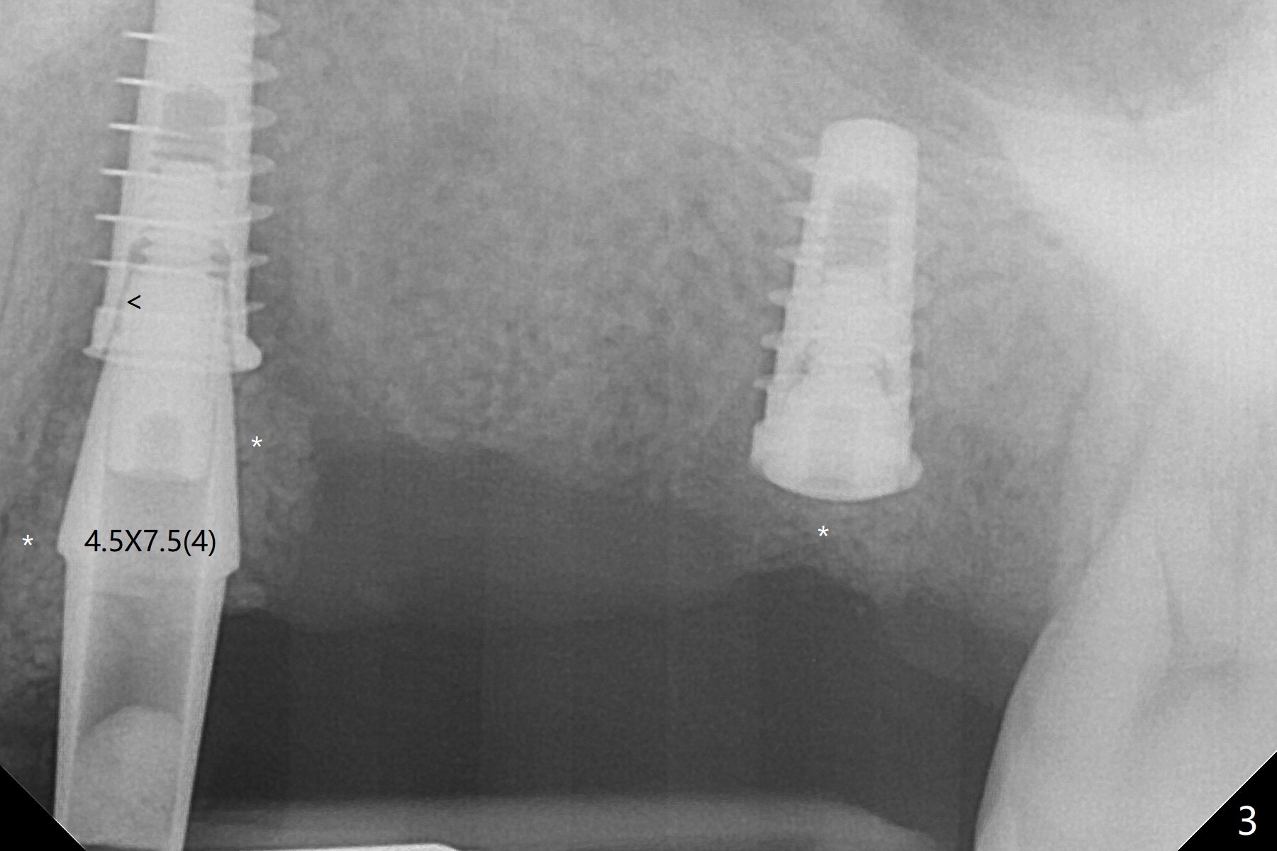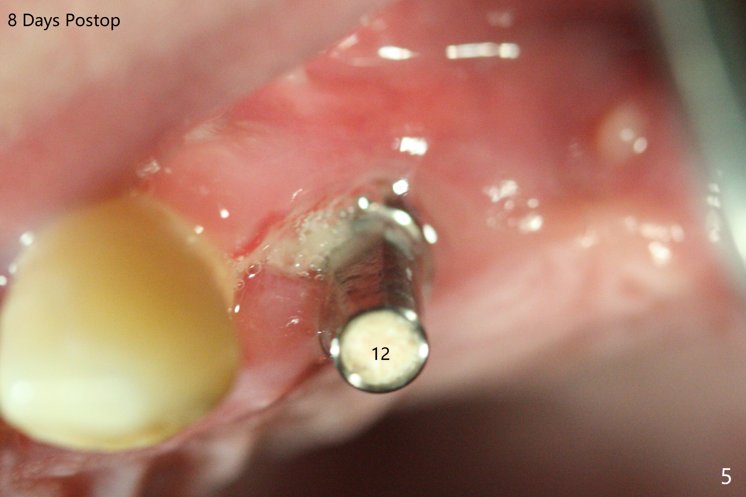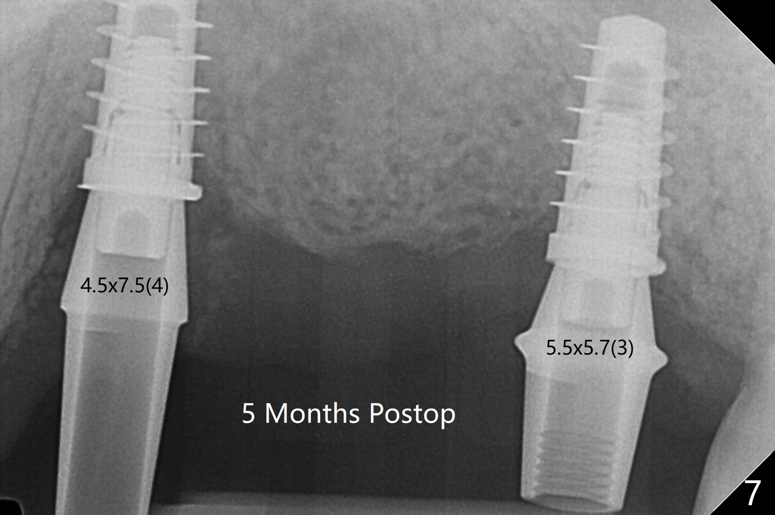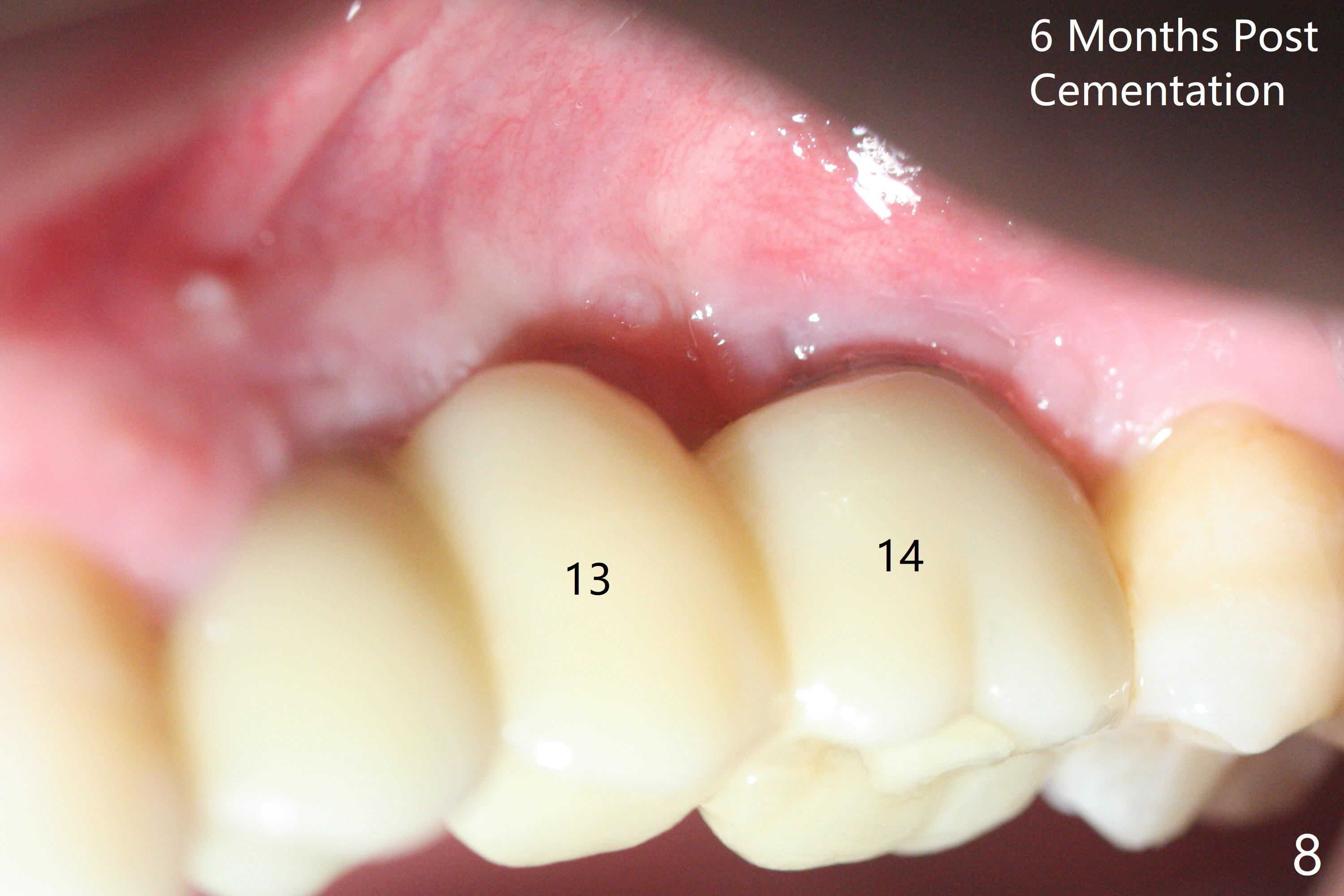 Immediate placement at #12 is smooth with 20 Ncm, whereas delayed one at #14 involves sinus membrane perforation; after insertion of PRF and mixture of autogenous bone and allograft, a shorter dummy implant tries in with stability (Fig.1). The final implant at #14 has ~60 Ncm, but the coronal palatal bone may be insuficient (Fig.2). Sticky bone is placed to bury the implant at #14 (Fig.3 *). After placement (incomplete, Fig.3 <) of a 4.5x7.5(4) mm pair abutment, setting acrylic is applied around the abutment, over the bone graft at #14 (to prevent loss) and pressed into the undercuts of the proximal surfaces of the neighboring teeth for retention (Fig.4). The sockets at #12 heals 8 days postop when a 2nd acrylic dressing dislodges (Fig.5). It appears that the retention of 3-unit acrylic dressing is poor. The wound at #14 also heals, but it would be better to make an incision to save the soft tissue (Fig.6). The bone/implant gap reduces at #13 five months postop (Fig.7 (complete abutment seating)). There is no implant thread exposure at #13 (immediate), while minor exposure mesial to #15 (delayed). The patient complains of food impaction between #13 and 14 buccally 6 months post cementation (Fig.8). Return to Upper Molar Immediate Implant, No Deviation 19 Next Case Xin Wei, DDS, PhD, MS 1st edition 01/21/2020, last revision 02/03/2021