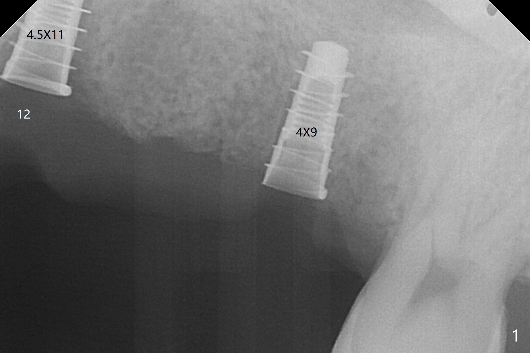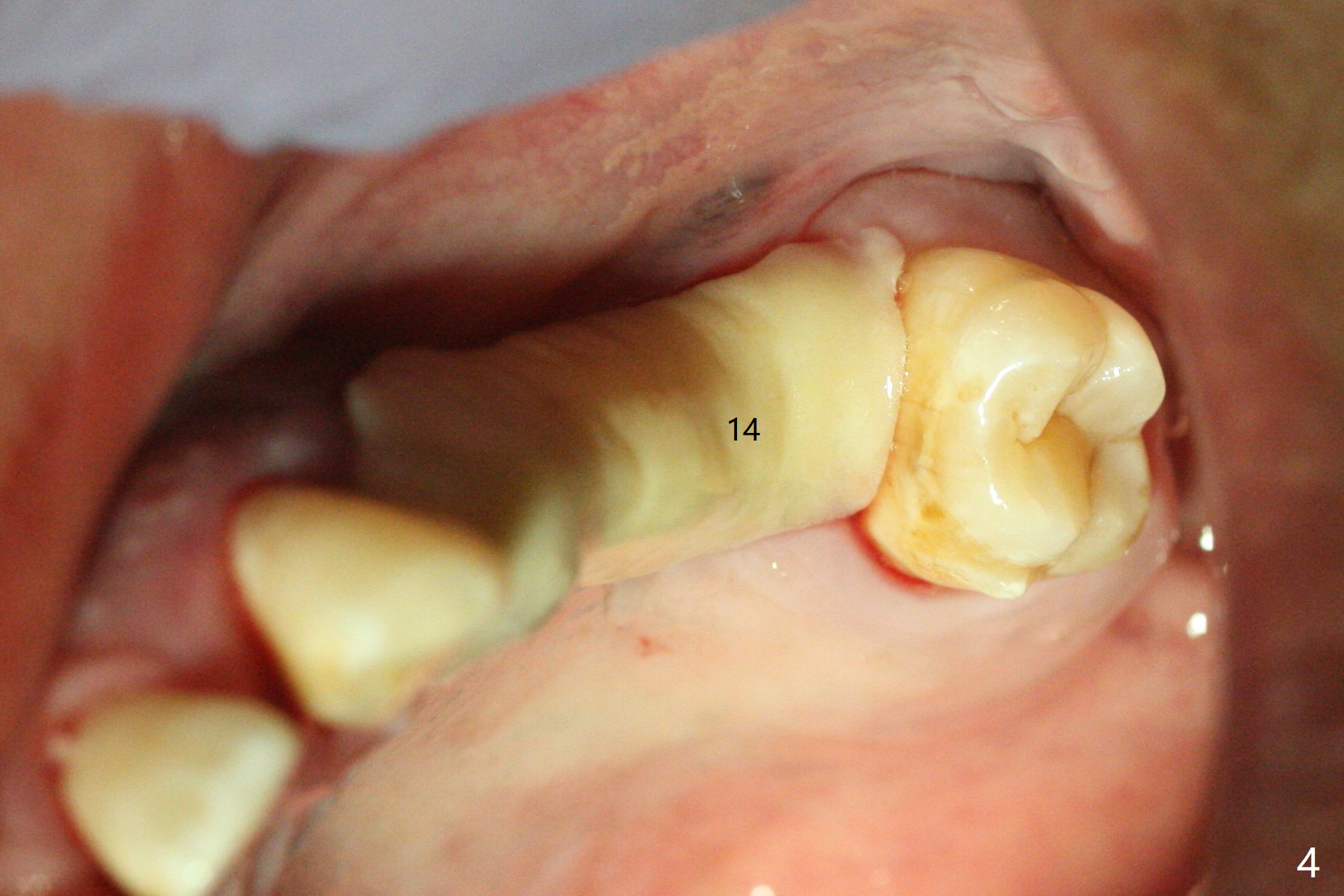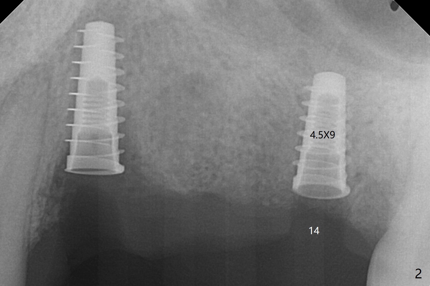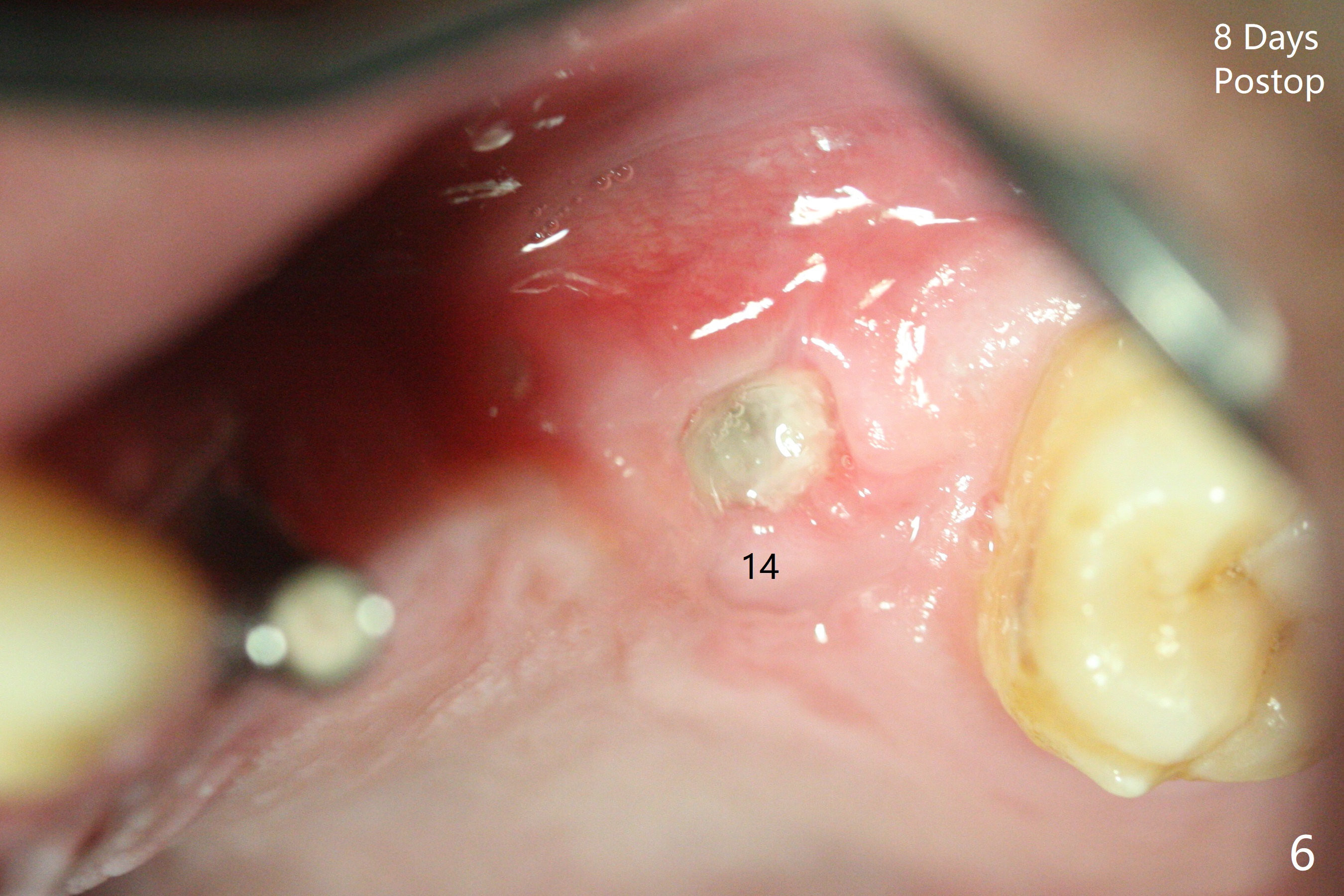 Immediate placement at #12 is smooth with 20 Ncm, whereas delayed one at #14 involves sinus membrane perforation; after insertion of PRF and mixture of autogenous bone and allograft, a shorter dummy implant tries in with stability (Fig.1). The final implant at #14 has ~60 Ncm, but the coronal palatal bone may be insuficient (Fig.2). Sticky bone is placed to bury the implant at #14 (Fig.3 *). After placement (incomplete, Fig.3 <) of a 4.5x7.5(4) mm pair abutment, setting acrylic is applied around the abutment, over the bone graft at #14 (to prevent loss) and pressed into the undercuts of the proximal surfaces of the neighboring teeth for retention (Fig.4). The sockets at #12 heals 8 days postop when a 2nd acrylic dressing dislodges (Fig.5). It appears that the retention of 3-unit acrylic dressing is poor. The wound at #14 also heals, but it would be better to make an incision to save the soft tissue (Fig.6). The bone/implant gap reduces at #13 five months postop (Fig.7 (complete abutment seating)). There is no implant thread exposure at #13 (immediate), while minor exposure mesial to #15 (delayed). The patient complains of food impaction between #13 and 14 buccally 6 months post cementation (Fig.8). Return to Upper Molar Immediate Implant, No Deviation 19 Next Case Xin Wei, DDS, PhD, MS 1st edition 01/21/2020, last revision 02/03/2021