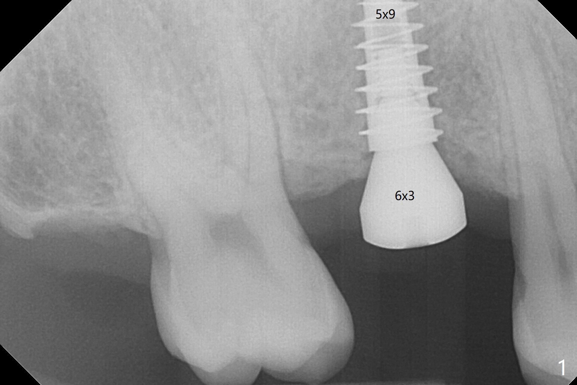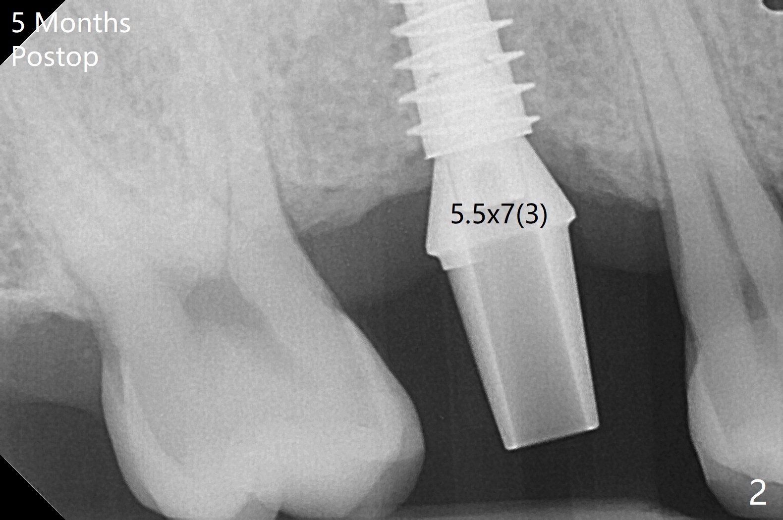 由于冠状病毒流行,右上六种植推迟七个月。老导板用起来好像挺顺手,植体位置仿佛正常(图一)。使用6毫米profile钻头后,放置6x3毫米愈合基台。术后5.5个月放置修复基台(图二),基台直径再小一号,放置就可能容易些,容易就位。