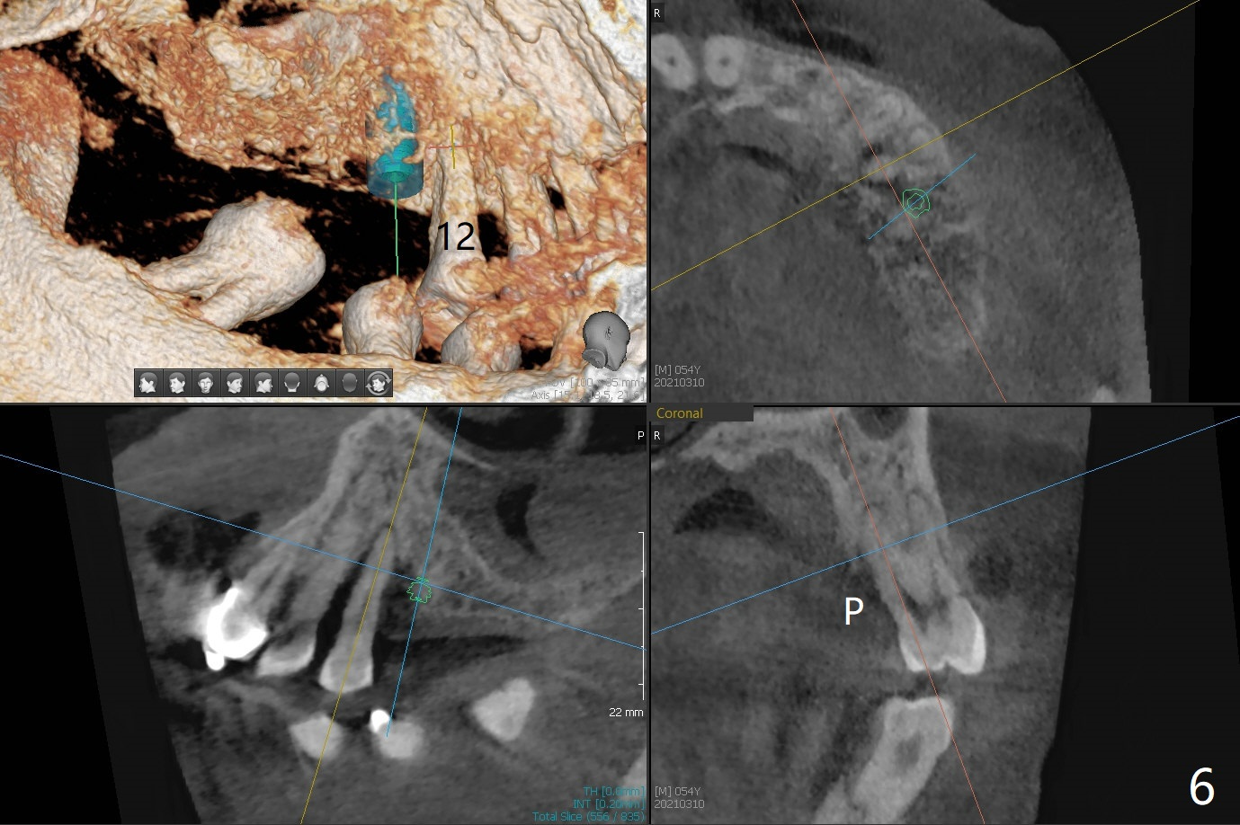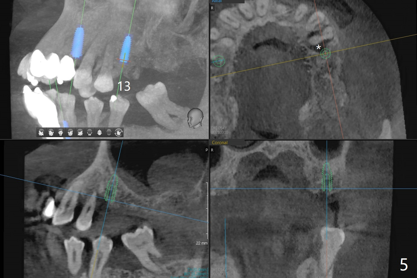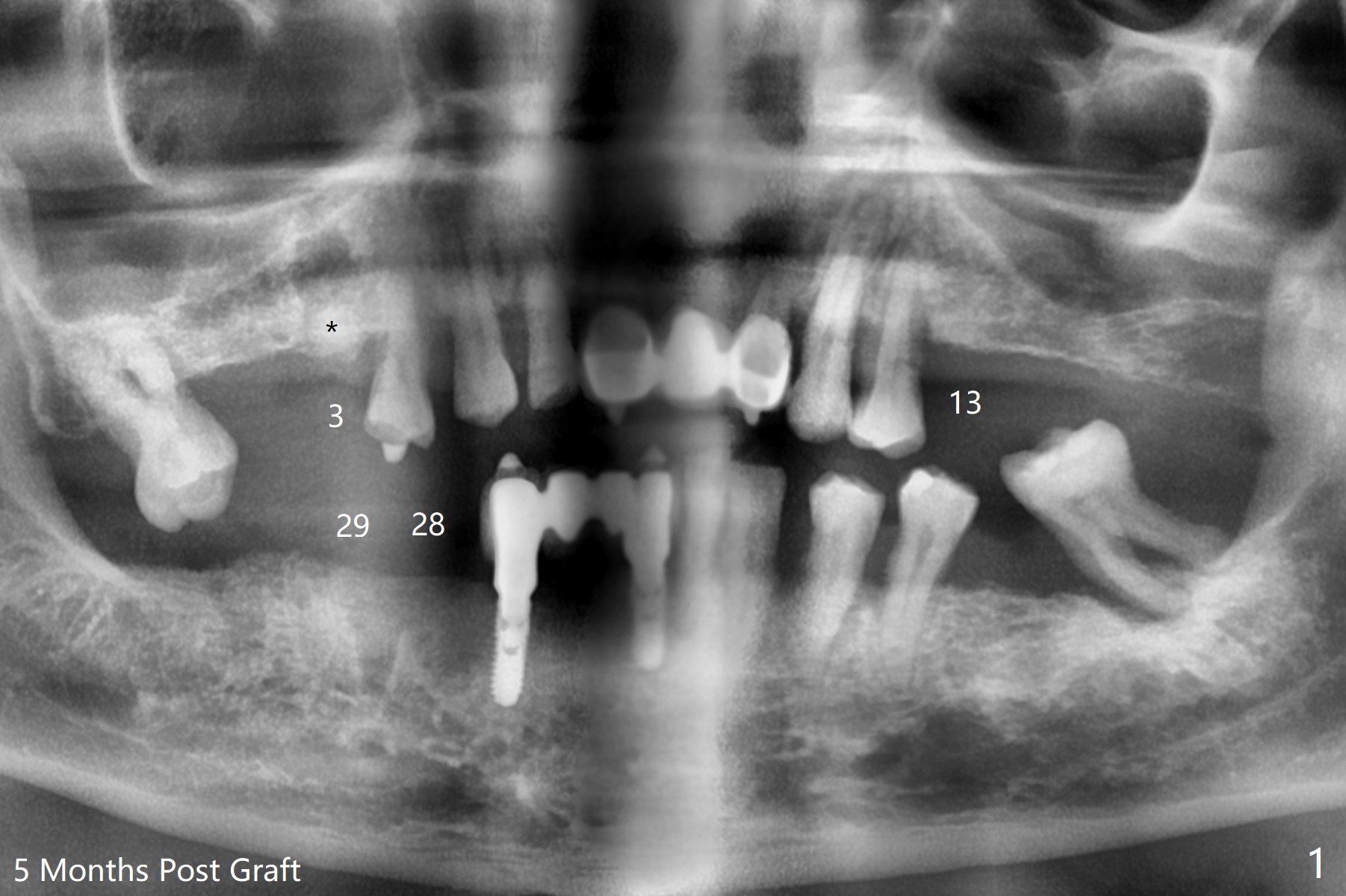 54岁男,28,29植骨后5个月,回来要求3,13,28,29种植(图一)。3号牙需要切开除去残根(图二:*),然后导板种植,准备两个PRF膜。为了保证植牙间距离,尝试在28,29处植入3.5x13毫米植体(图三,四)。在13号牙种植时(图五),考虑12号牙腭侧植骨(图六)。为了减少对12号牙咬合创伤,考虑4个植牙即刻修复。