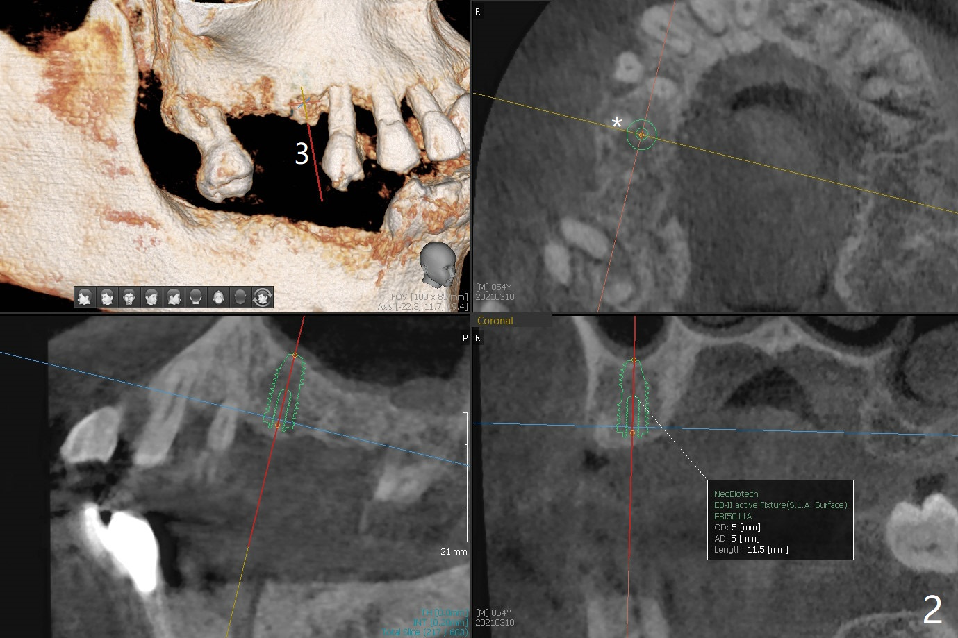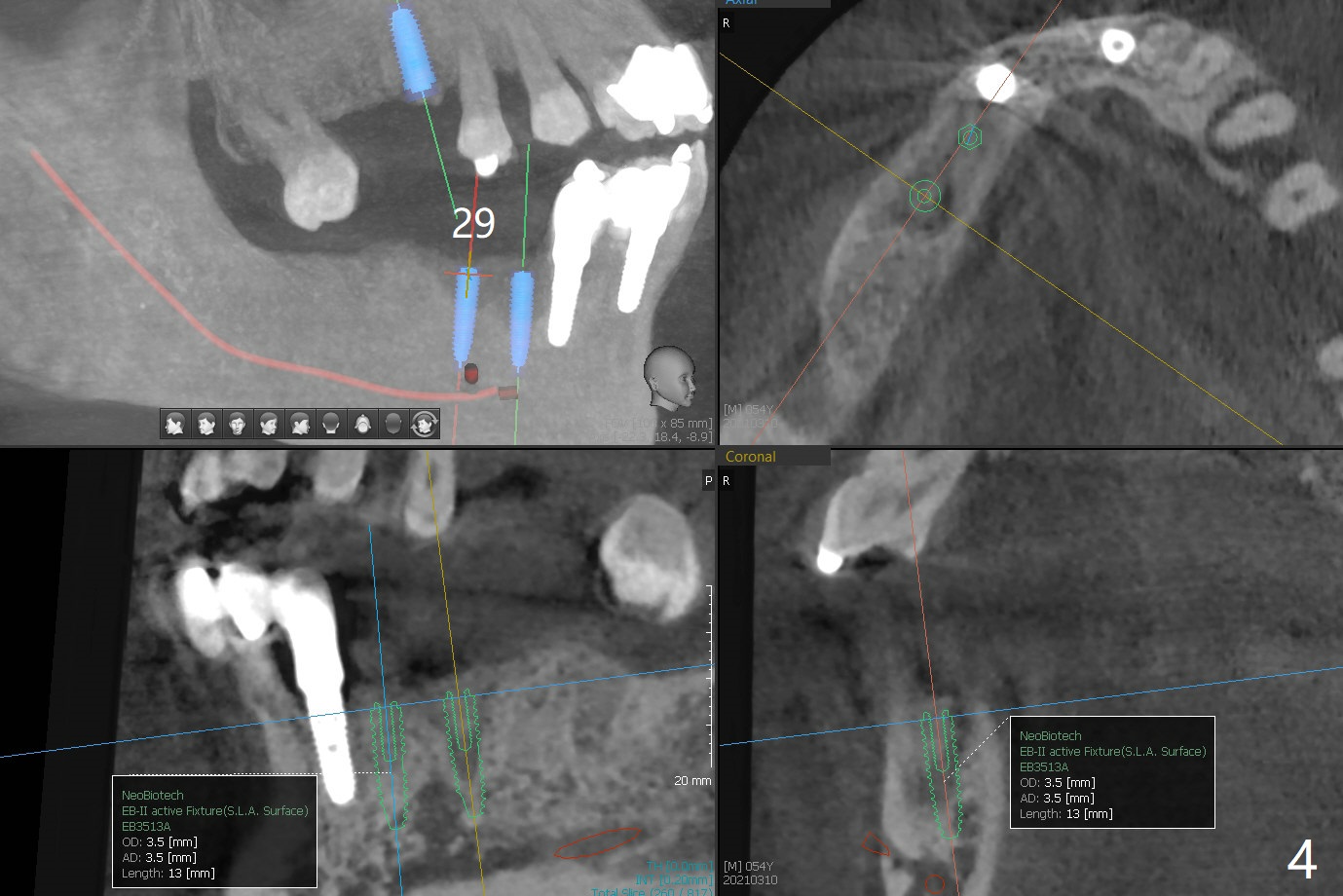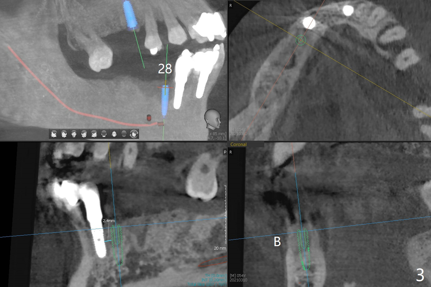 54岁男,28,29植骨后5个月,回来要求3,13,28,29种植(图一)。3号牙需要切开除去残根(图二:*),然后导板种植,准备两个PRF膜。为了保证植牙间距离,尝试在28,29处植入3.5x13毫米植体(图三,四)。在13号牙种植时(图五),考虑12号牙腭侧植骨(图六)。为了减少对12号牙咬合创伤,考虑4个植牙即刻修复。
