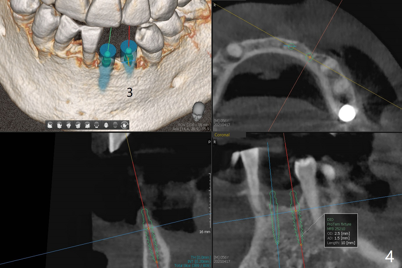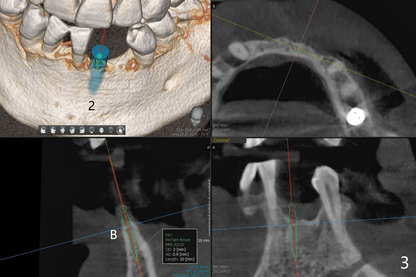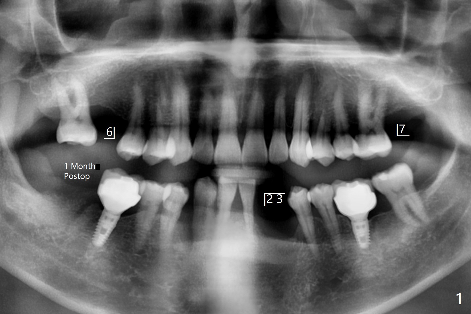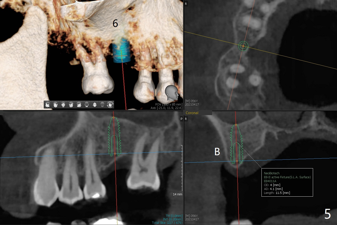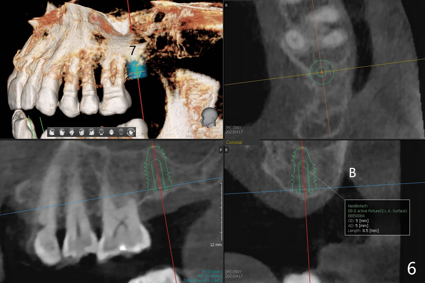 56岁男右下7位点保存一个月,还缺失4个牙齿(图一),左下2,3牙槽嵴特别狭窄,骨皮质为主(图二),应该植入2.0,2.5毫米植体(图三,四),避免复杂植骨术。而右上3骨质也狭窄,但是骨质密度低,几乎松质骨(图五),如果采纳骨膨胀术(高速倒转),植体可以大于4.0毫米,防止植体断裂。左上7骨质宽,但是短,5x8.5毫米植体可能胜任功能(图六)。如果植入10毫米植体,需要做上颌窦提升。