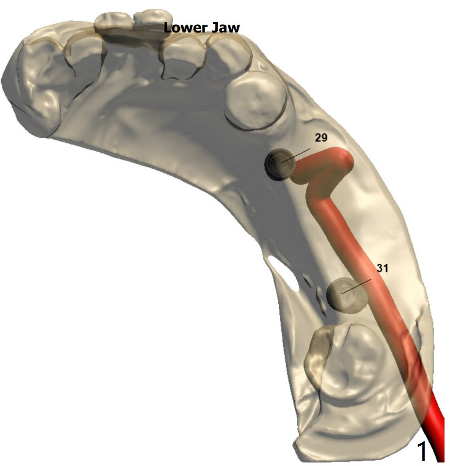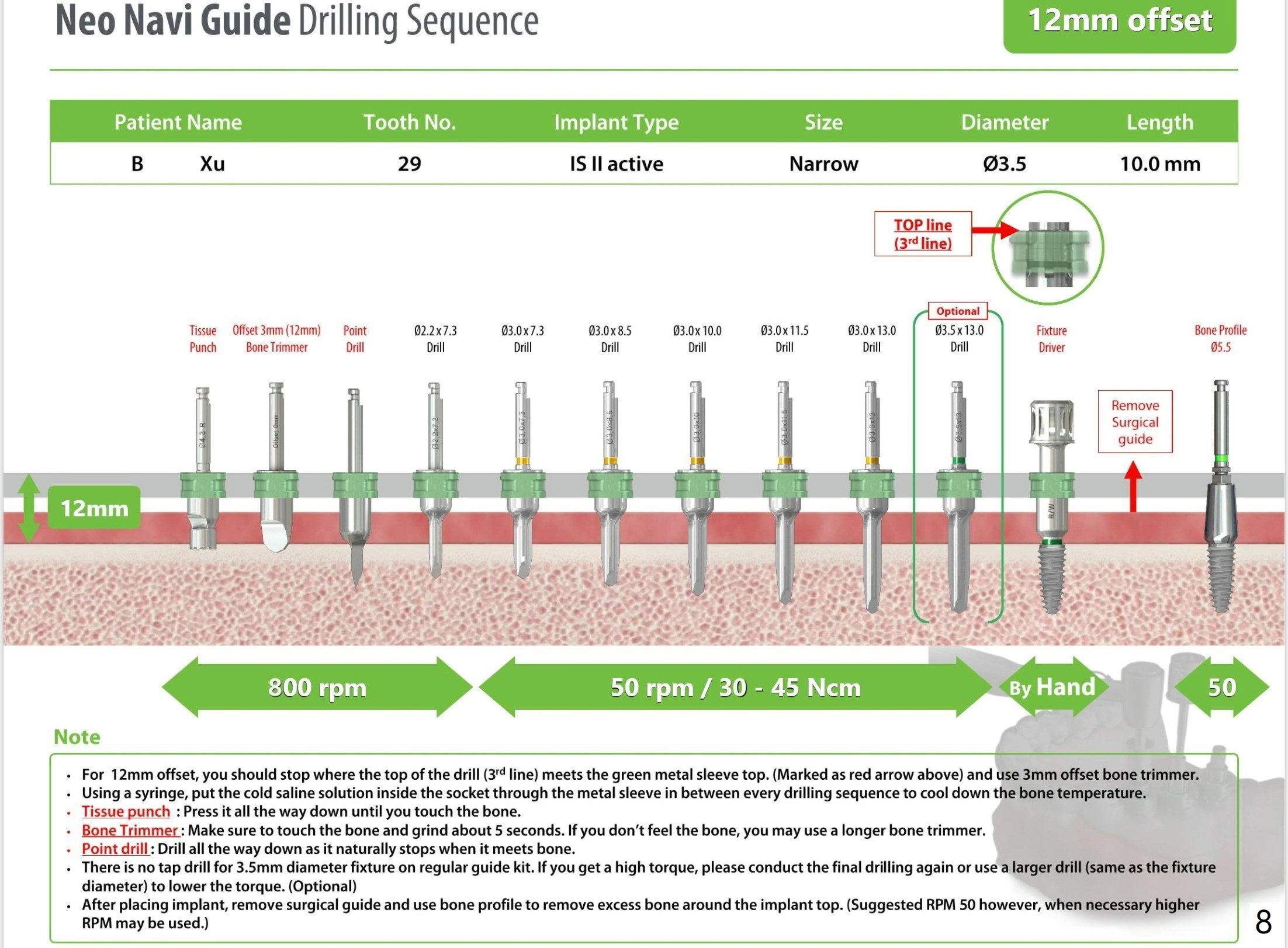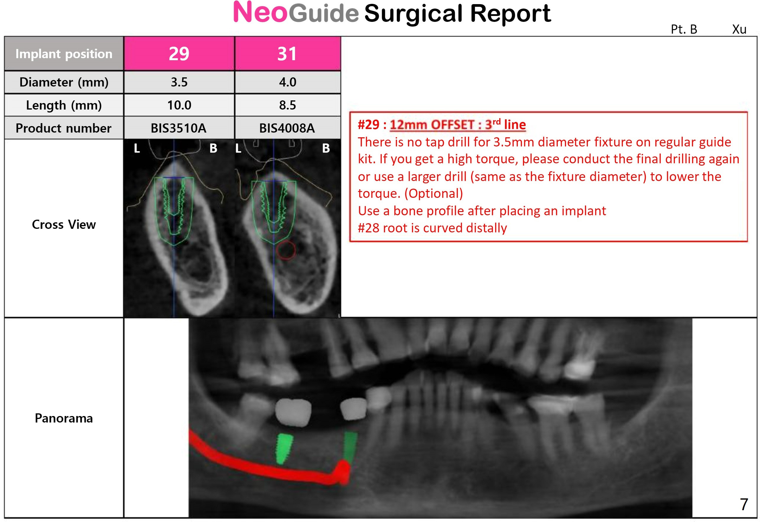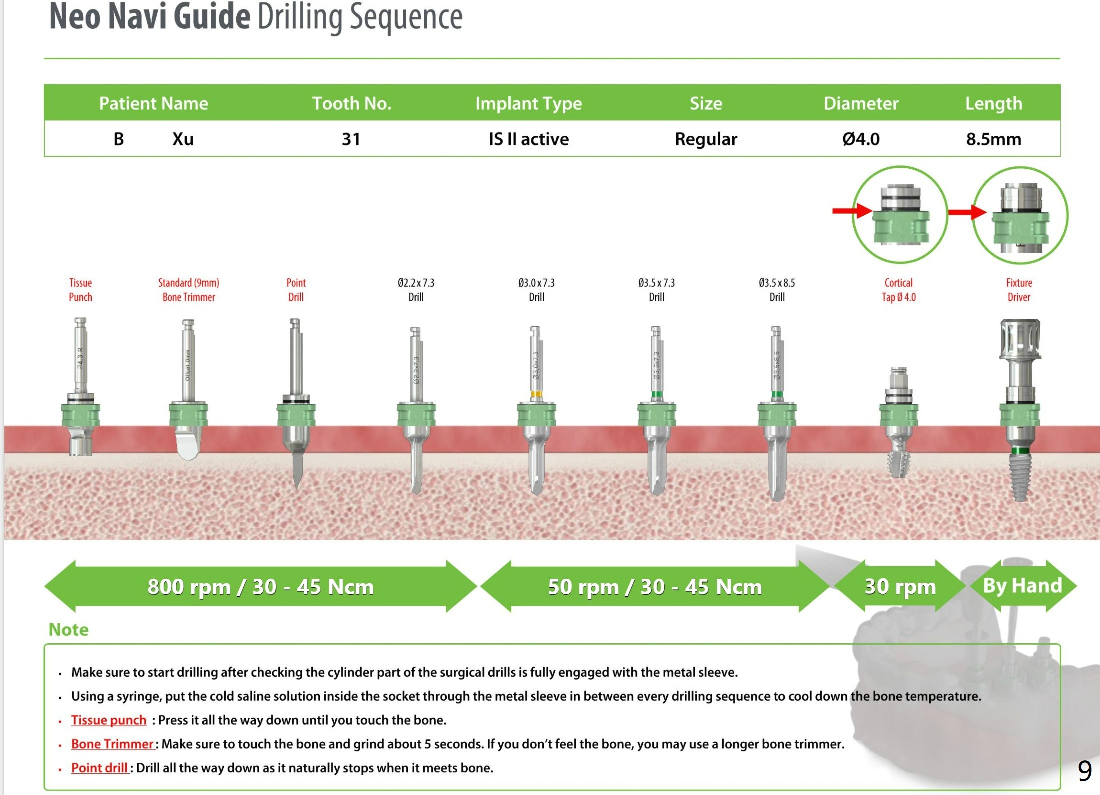 A 81-year-old woman. Take PAs when 12 mm bone trimmer is done (to determine whether the sloped ridge is flattened) and 2.2 mm drills reach the depth. Drill very slowly to reduce deviation and avoid touching #28 apex (Fig.4). Return to Protect Graft 3 Xin Wei, DDS, PhD, MS 1st edition 06/18/2021, last revision 07/13/2021