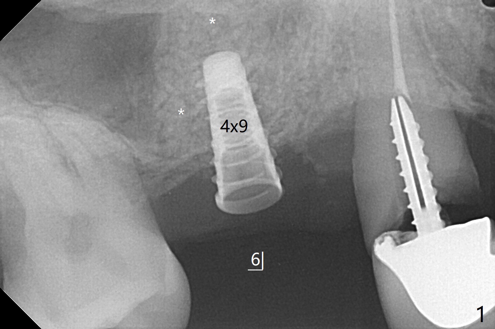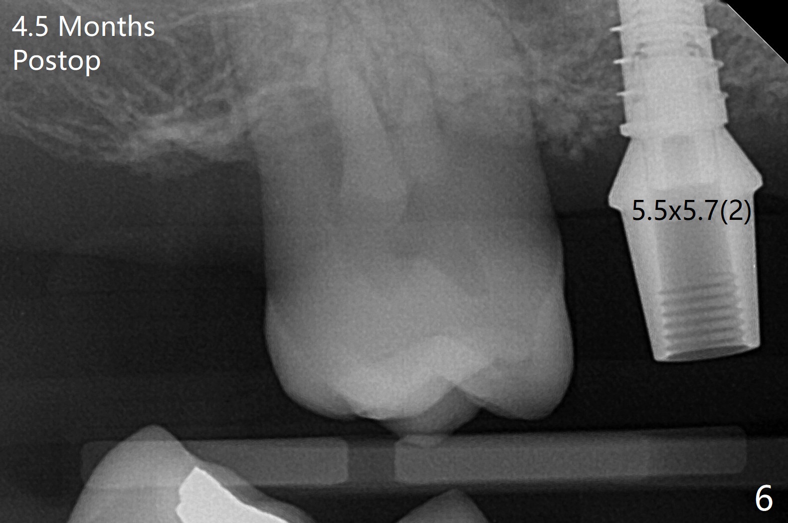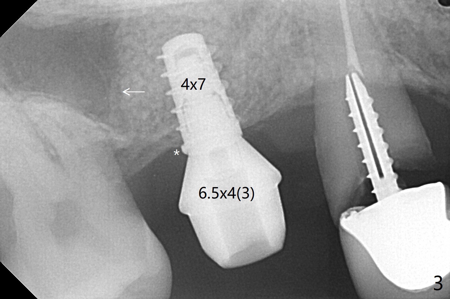 49岁女(个子小)牙齿问题多,同意先做右上5,6种植,6骨质高度1-2毫米,一个月前因动脉出血外提升失败。今天她回来做内提升,同意如果条件合适,同期徒手植牙(将来做一个磨牙牙冠),事先服用阿奇霉素。使用粘性骨粉和报废植体做内提(图一:*),最后植入4x7毫米植体(35Ncm),近中颊侧平牙槽嵴(图二:*),其余骨上 (图三: *),不敢植入太深,怕掉入上颌窦。第二个预防掉入上颌窦措施是利用大号基台(图三),然后在基台周围放置骨粉(图四:*,五),缝合,牙周敷料。伤口愈合后,准备制作树脂敷料,防止植体和基台往口腔脱落。术后五天复诊,无上颌窦炎症,牙周敷料稳定。她再回来时已经术后4.5个月,植体稳定,更换基台没有疼痛(图六,七),口腔卫生极佳,使用水牙线,不敢患侧刷牙。