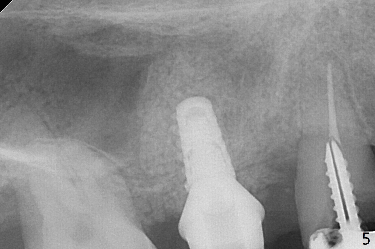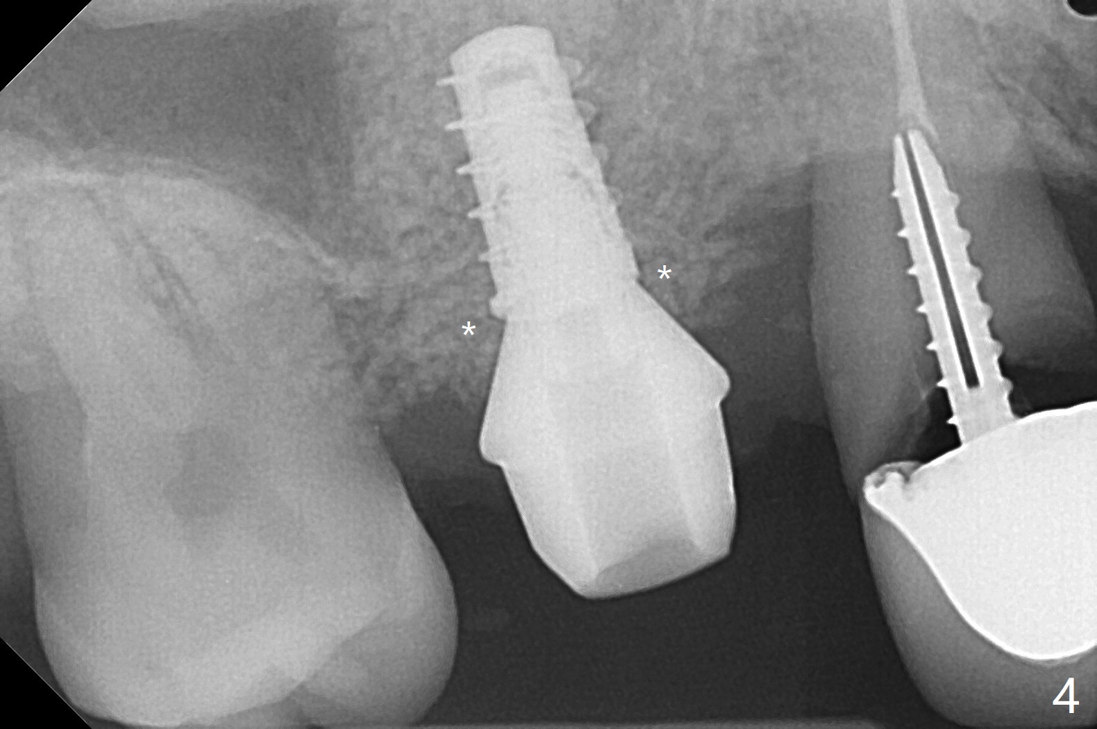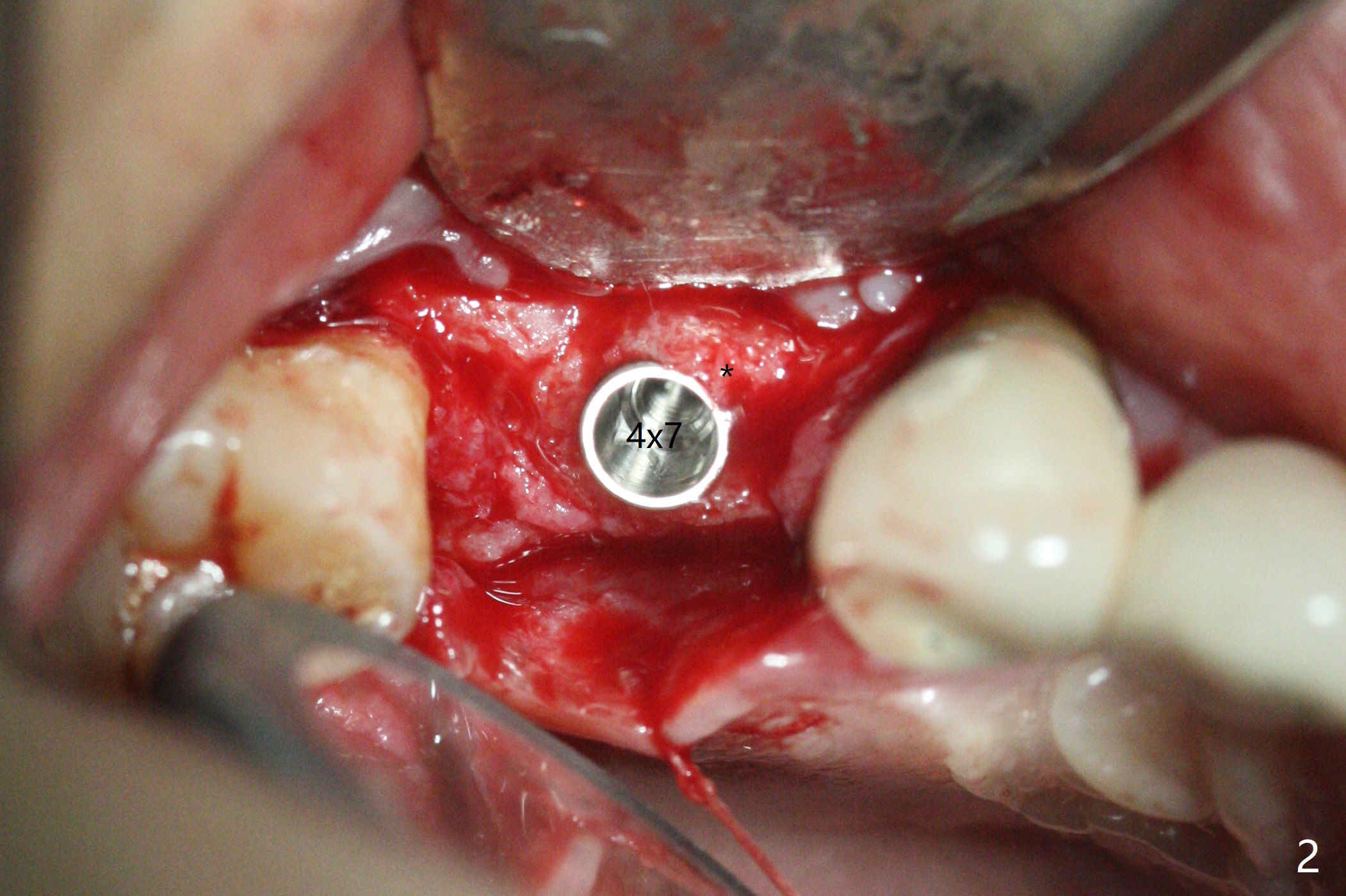 49岁女(个子小)牙齿问题多,同意先做右上5,6种植,6骨质高度1-2毫米,一个月前因动脉出血外提升失败。今天她回来做内提升,同意如果条件合适,同期徒手植牙(将来做一个磨牙牙冠),事先服用阿奇霉素。使用粘性骨粉和报废植体做内提(图一:*),最后植入4x7毫米植体(35Ncm),近中颊侧平牙槽嵴(图二:*),其余骨上 (图三: *),不敢植入太深,怕掉入上颌窦。第二个预防掉入上颌窦措施是利用大号基台(图三),然后在基台周围放置骨粉(图四:*,五),缝合,牙周敷料。伤口愈合后,准备制作树脂敷料,防止植体和基台往口腔脱落。术后五天复诊,无上颌窦炎症,牙周敷料稳定。她再回来时已经术后4.5个月,植体稳定,更换基台没有疼痛(图六,七),口腔卫生极佳,使用水牙线,不敢患侧刷牙。