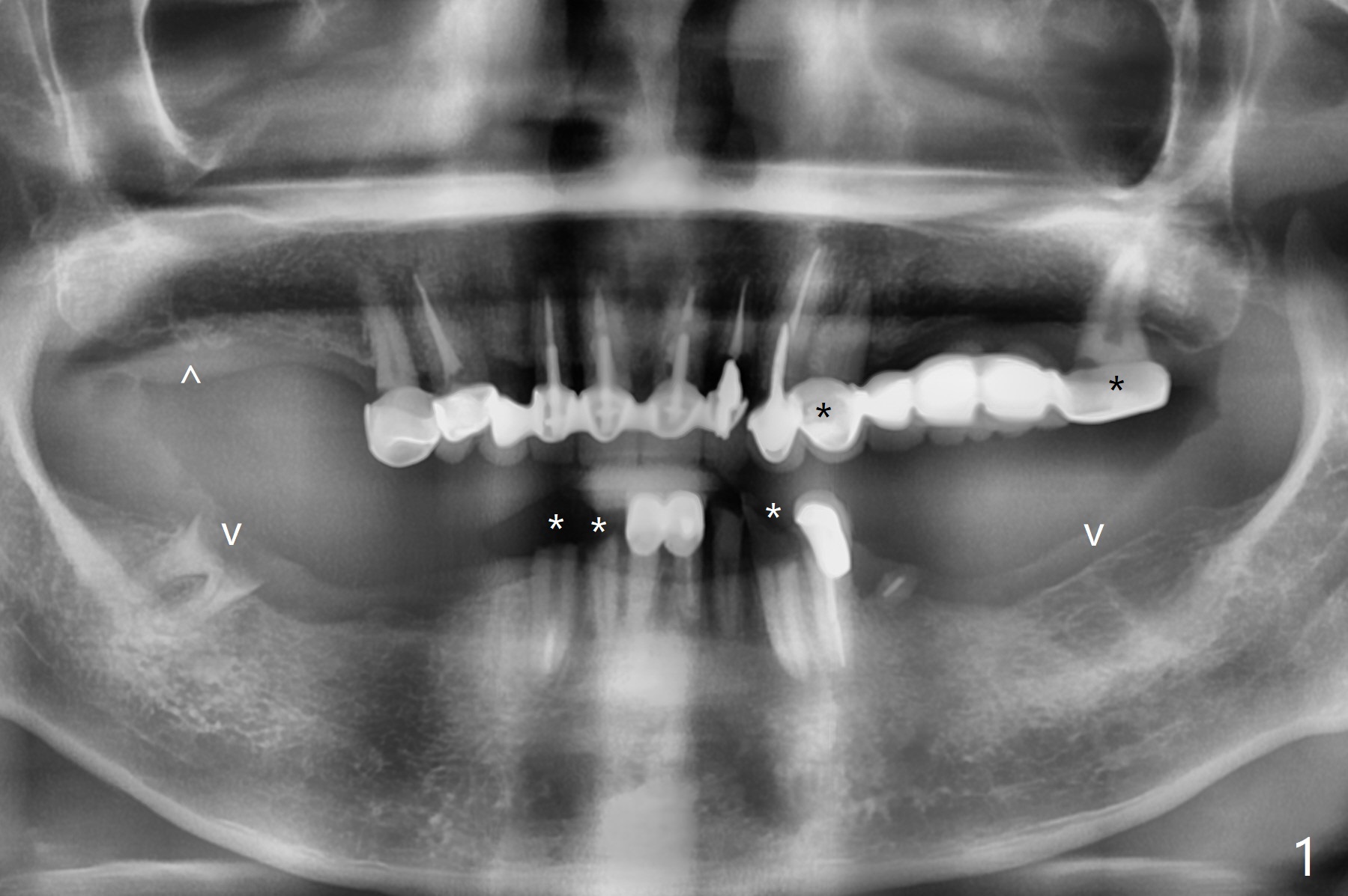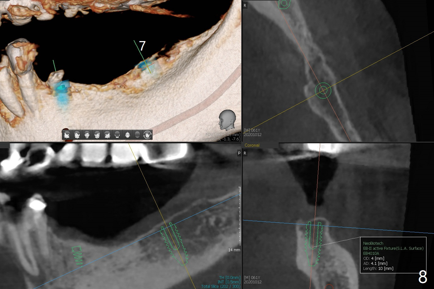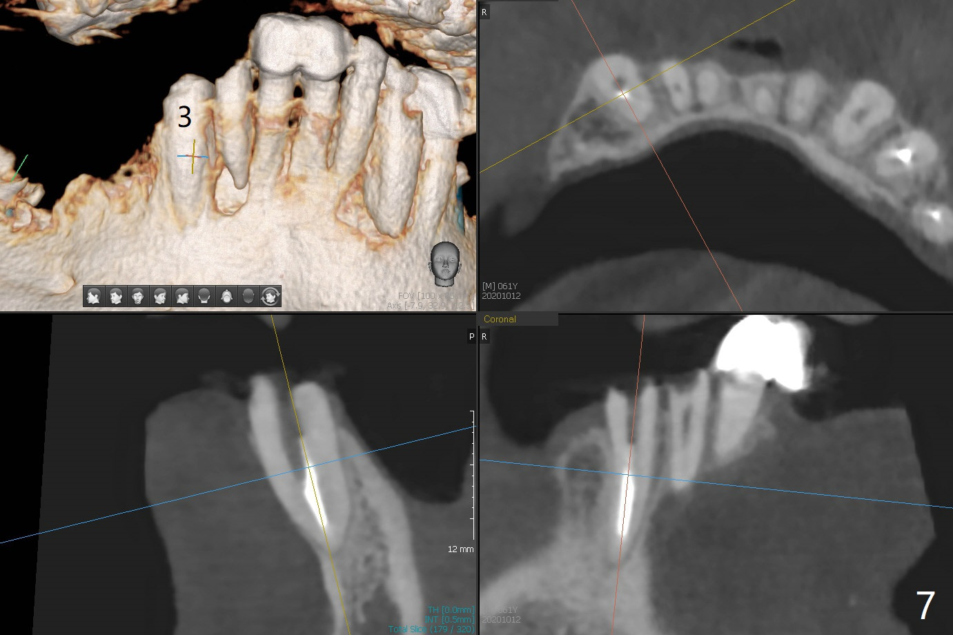 61男牙齿不好,左上4-8牙桥松动(图一,五,六),右下2,左下3根尖瘘道(图二),左上4,8也需要根管治疗,以上牙齿以及右下3插入球状牙桩(图一:*),然后在右上,左下,右下7植牙,放置球状基台(图一:箭头),固定上下活动义齿(覆盖义齿)。下前牙颊侧骨板几乎没有(图七)。左下7骨头(图八)宽于左下5(图三)。