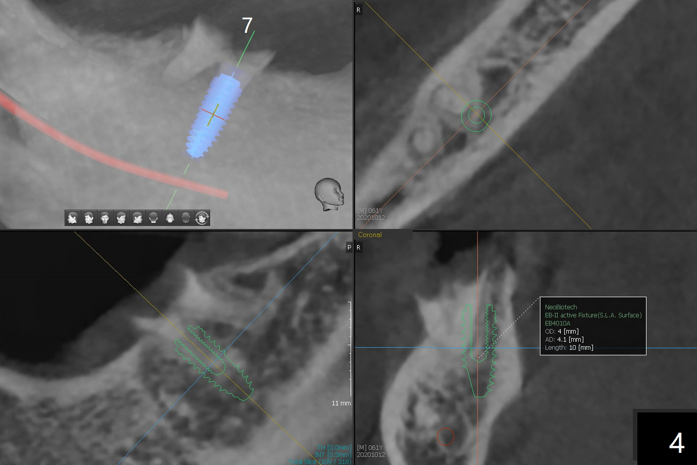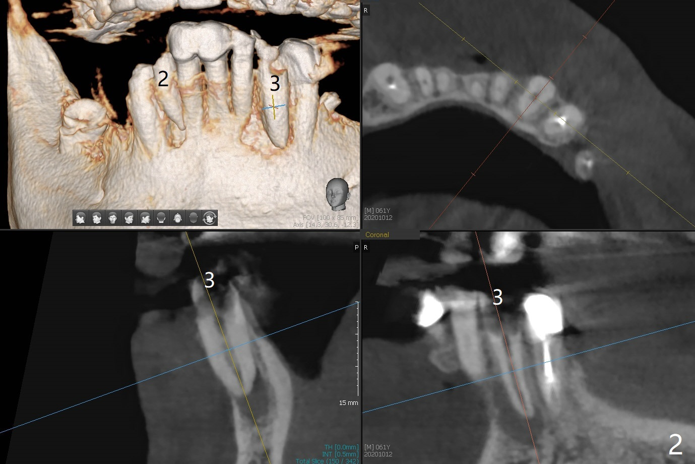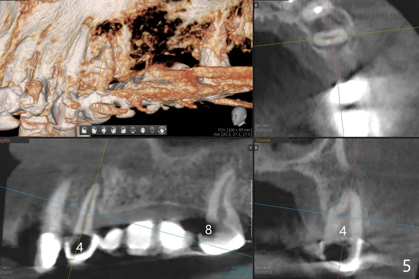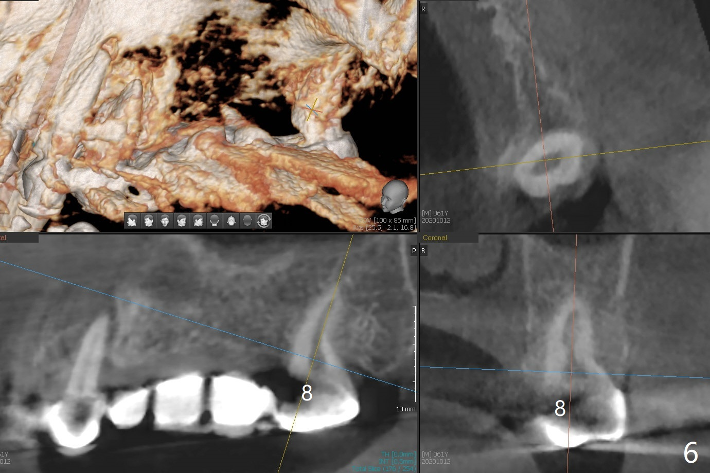 61男牙齿不好,左上4-8牙桥松动(图一,五,六),右下2,左下3根尖瘘道(图二),左上4,8也需要根管治疗,以上牙齿以及右下3插入球状牙桩(图一:*),然后在右上,左下,右下7植牙,放置球状基台(图一:箭头),固定上下活动义齿(覆盖义齿)。下前牙颊侧骨板几乎没有(图七)。左下7骨头(图八)宽于左下5(图三)。