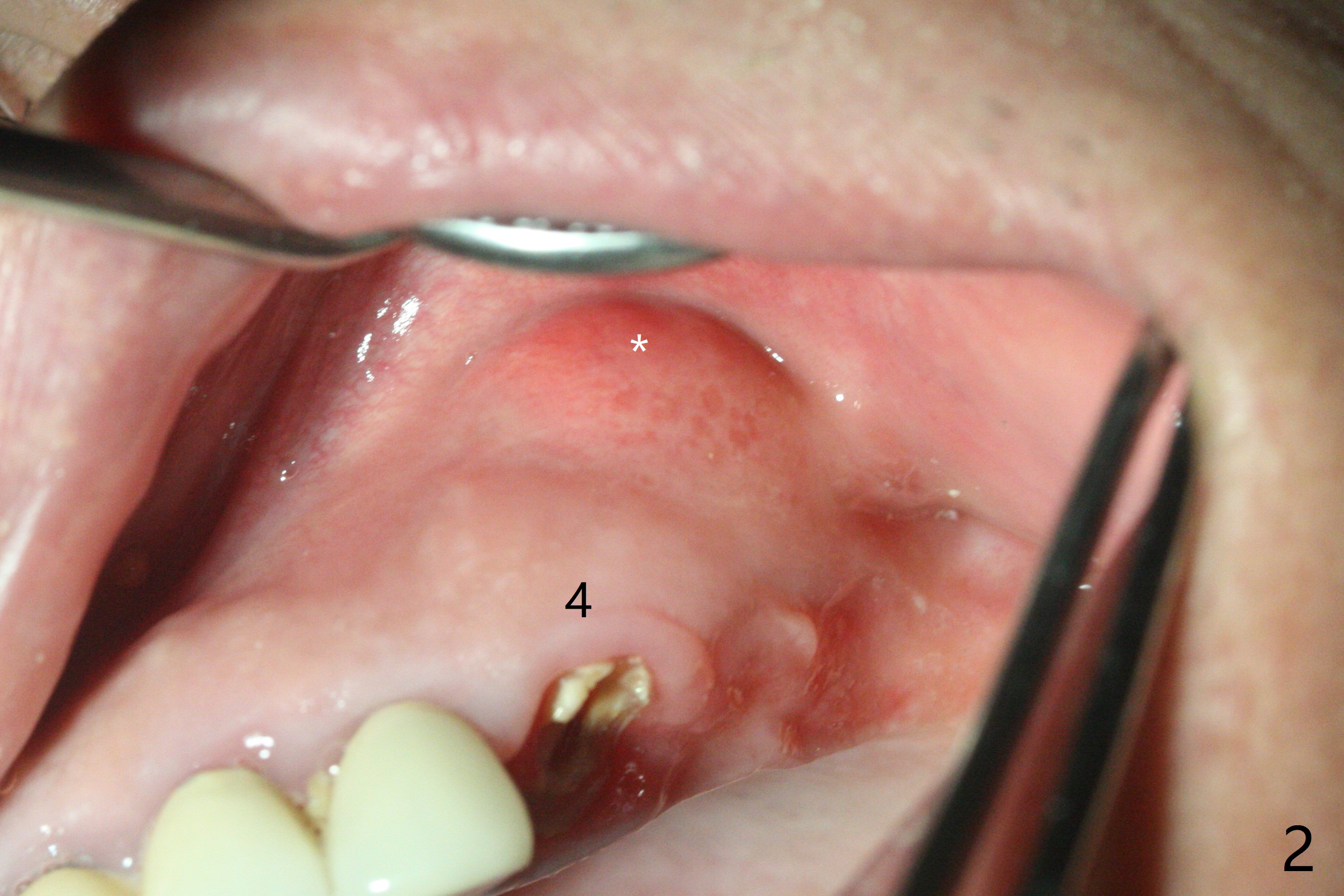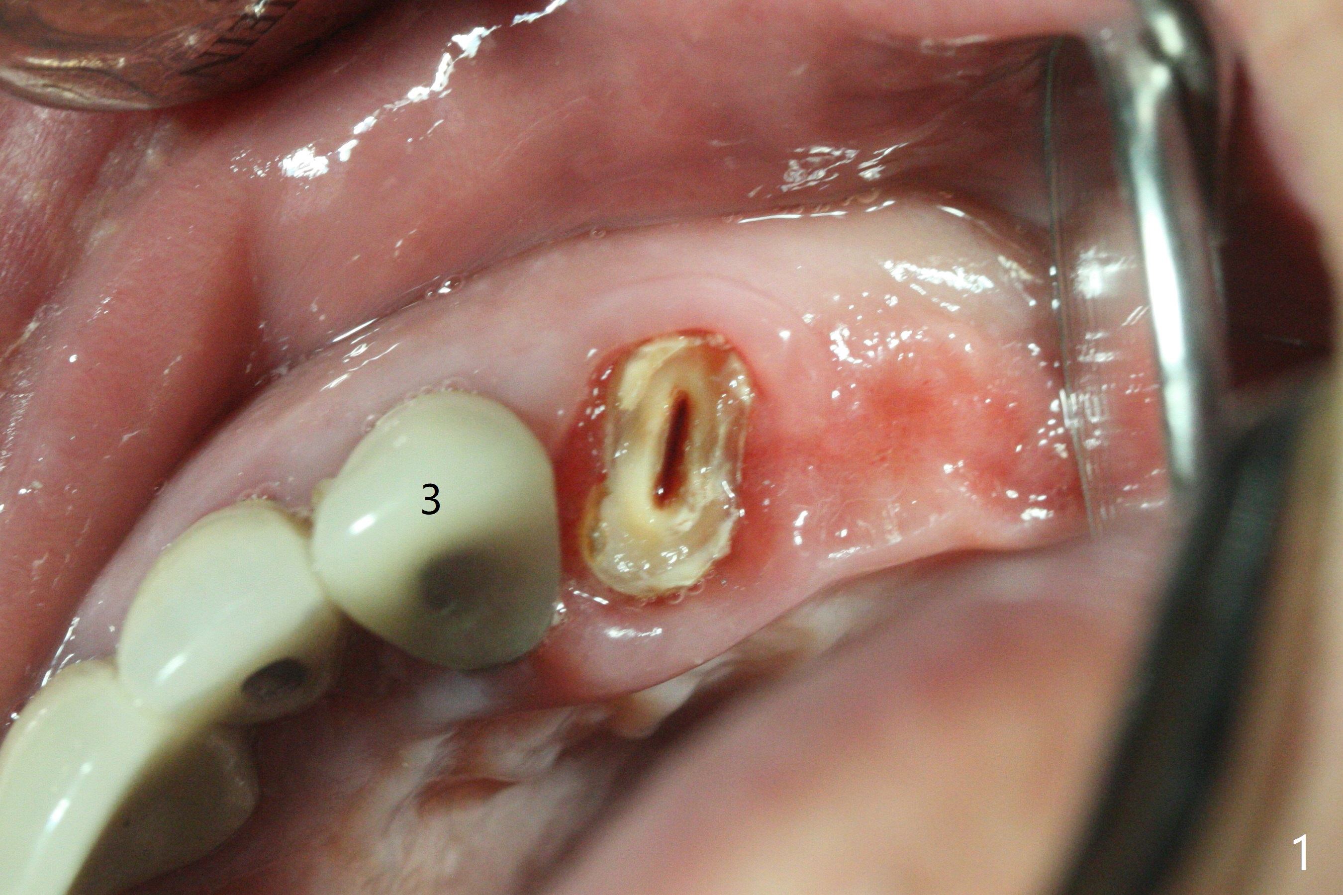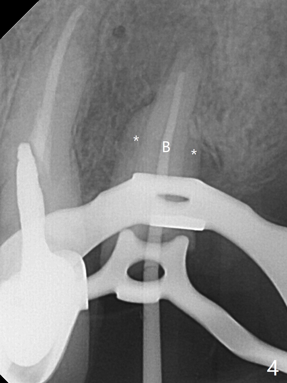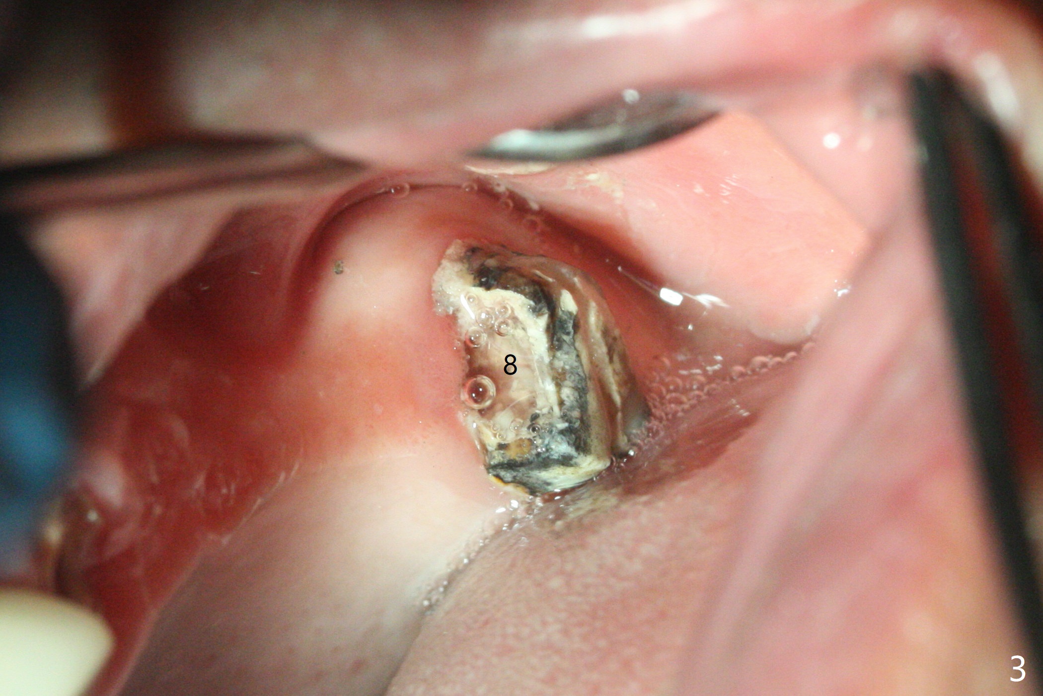 为了美观,病人希望先进行下颌治疗,当他回来时,提到左上肿胀,但是没有明显疼痛。去除左上4-8桥,发现4仍可以保留(图一,二),8龋齿龈下(图三)。4根管治疗只发现颊侧根管(图四:B),腭侧根管好像闭锁,与CT一致。放置氢氧化钙糊剂,明天病人回来治疗,术后两周。我的疑问是,如果肿胀消失,仅完成颊侧根管充填,治疗够吗?什么时候可以安置球状牙桩?如果肿胀没有消失,怎么搞通腭侧根管?