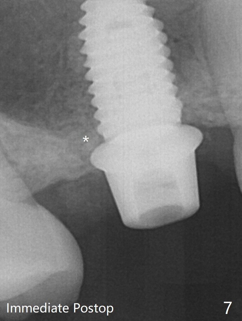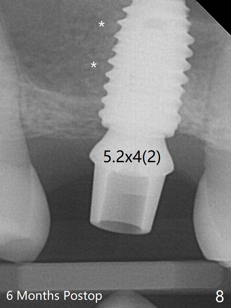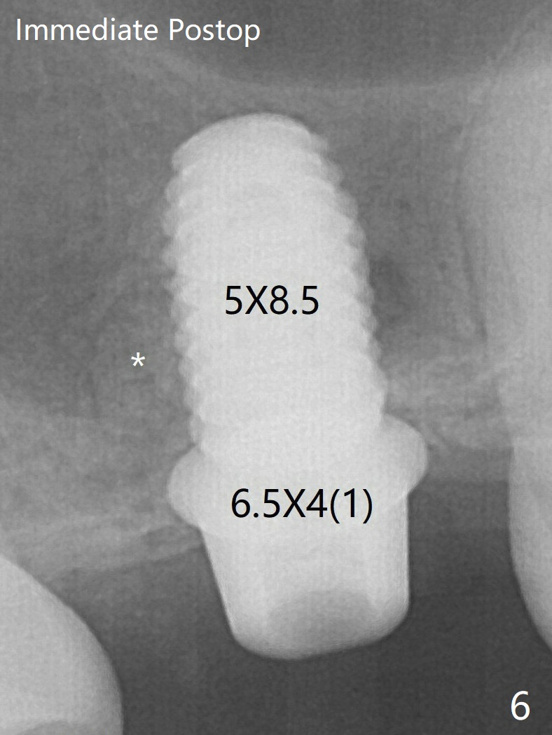 A 4.5x10 mm dummy implant is placed with high torque after 4x7.3 mm drill with 3 mm stopper so that 4.5x7.3 mm drill with 1 mm stopper is used before placement of a 5x8.5 mm final implant with ~ 35 Ncm (Fig.6-7). There is no pain when a 5.2x4(2) mm cemented abutment is torqued at 30-35 Ncm before impression (Fig.8). *: bone graft in the sinus. When the permanent crown is delivered, the patient feels light pain when she bites hard. The discomfort persists 4 months post cementation (Fig.9). The crown/abutment is replaced with a healing abutment (Fig.10).