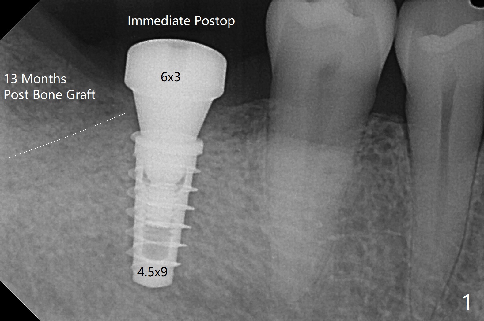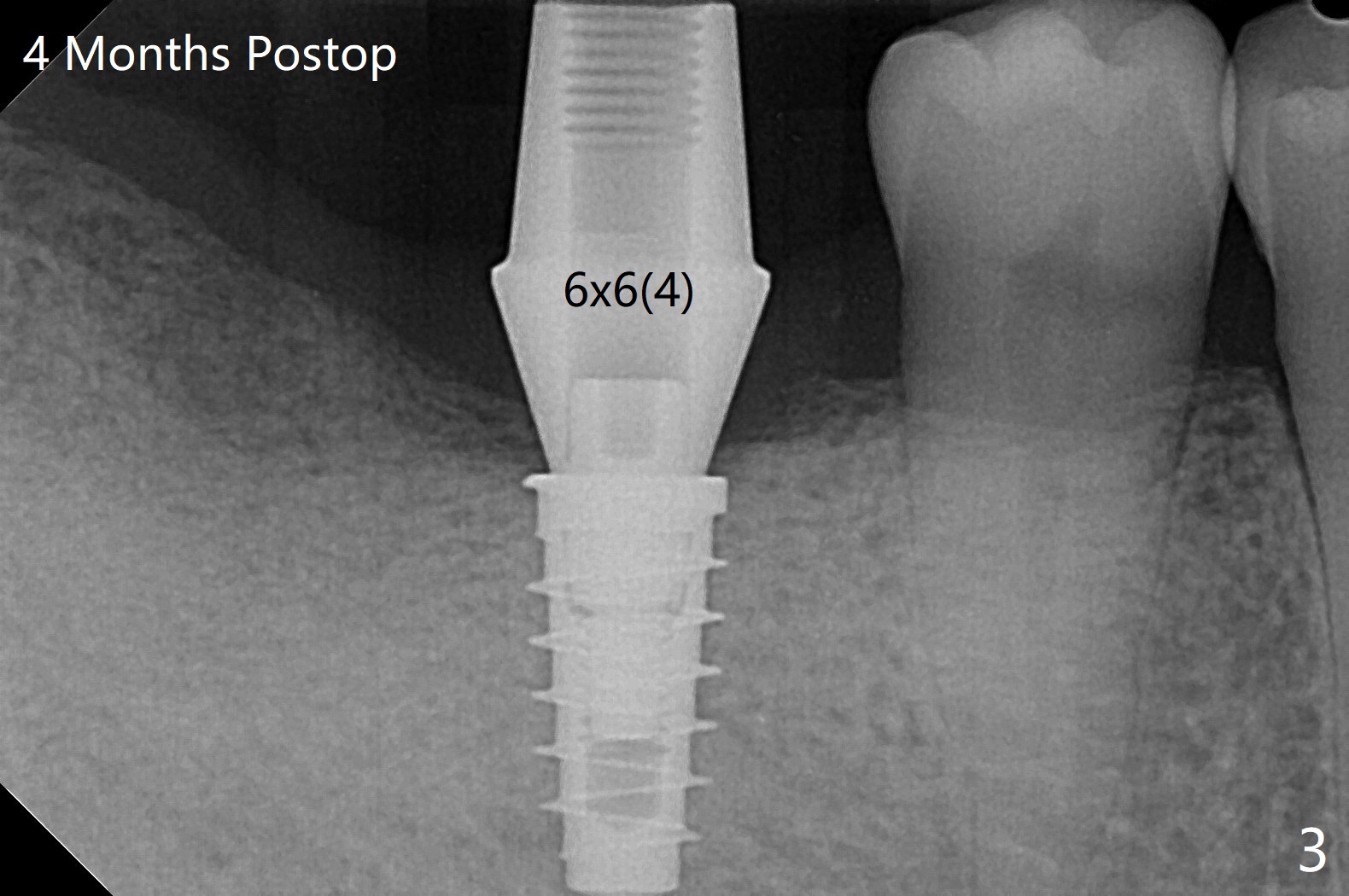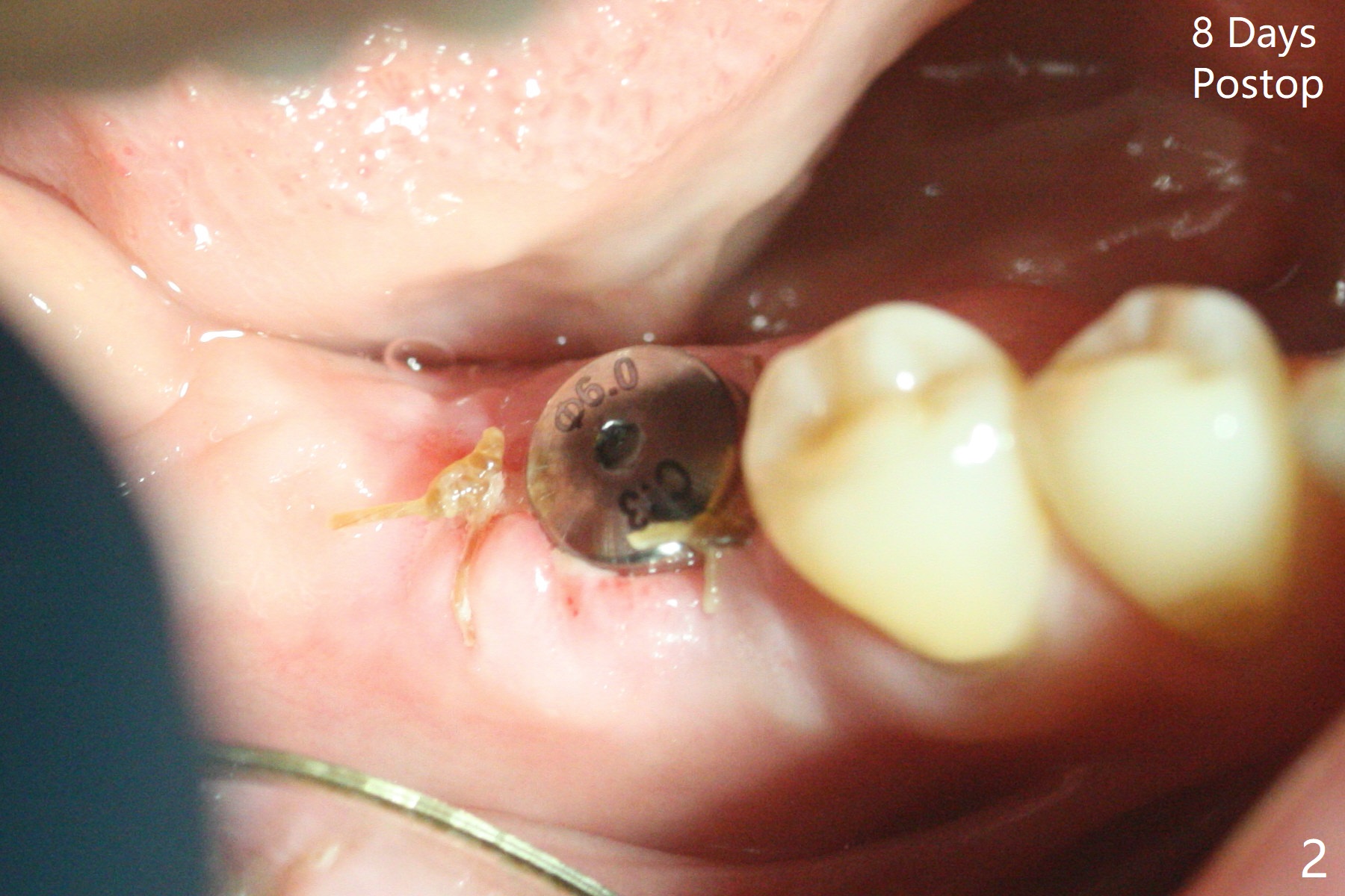右下7(以前近中倾斜移位)位点保留后13月回来做6导板种植,骨质密度高,钻洞慢,注意灌溉制冷,使用4.5毫米功螺纹钻头后,植入4.5x9毫米植体(图一:牙槽嵴下~1毫米,扭力大约35Ncm)。使用5.5和6.0毫米profile drills后,放置6x3毫米愈合基台,最后植体,基台周围放置自体骨(事先翻瓣)。看样子邻牙植骨(图一:白线)对植牙有帮助。翻瓣缺点是缝合后伤口保护,牙周敷料术后一两天脱落(远中植体最好使用修复基台,不容易脱落),造成病人恐慌,第二次敷料术后第七天脱落,可欣的是伤口术后第八天愈合(图二)。术后四个月更换基台(图三),调整高度后,取模。由于基台边缘龈上,先拧紧(30 Ncm)后粘固,之后不再取出基台。然后对合取模,修改对合牙冠。