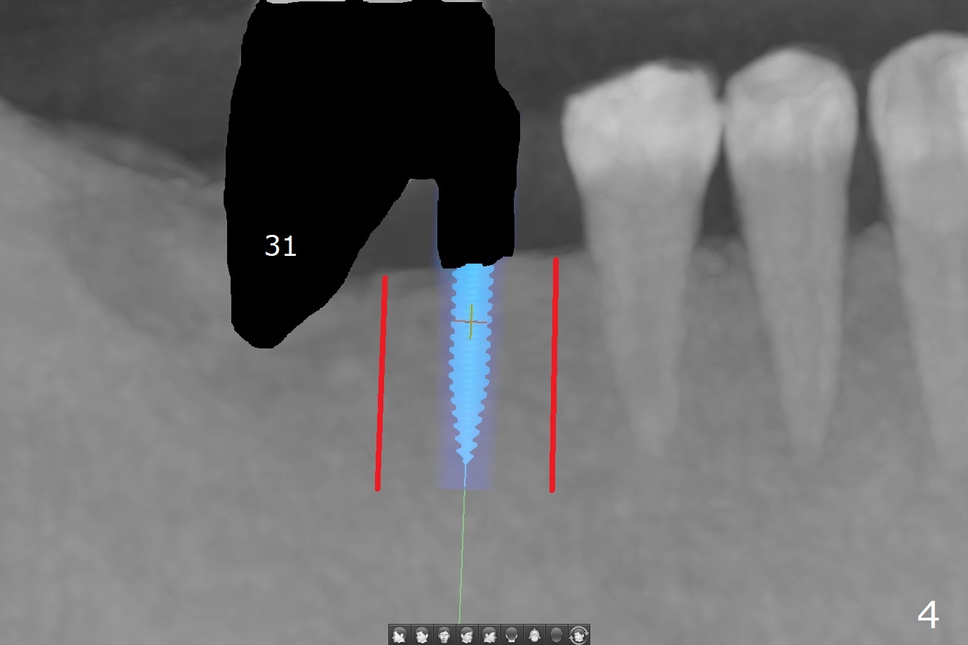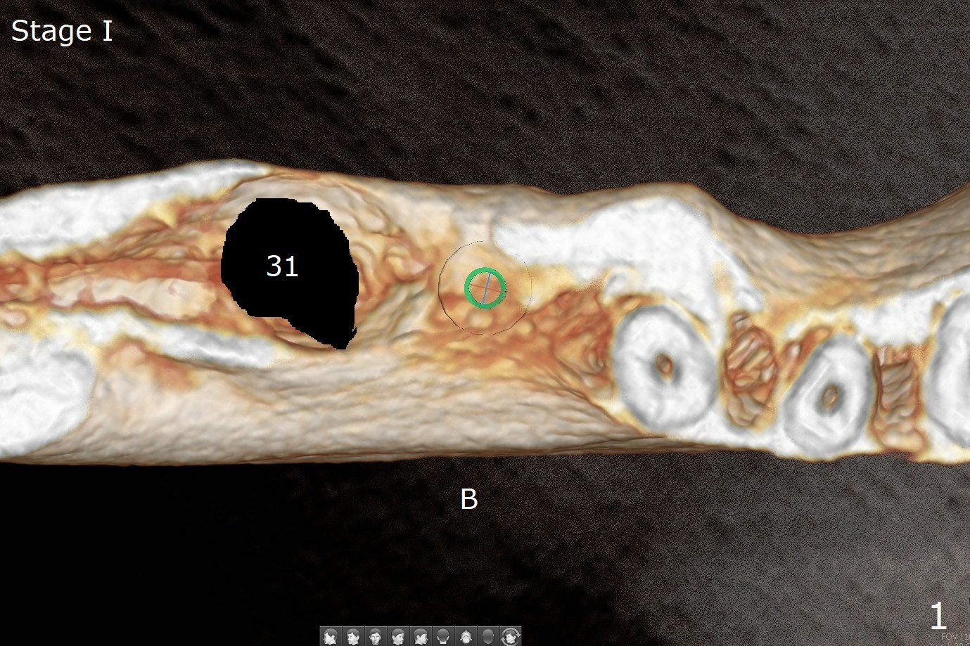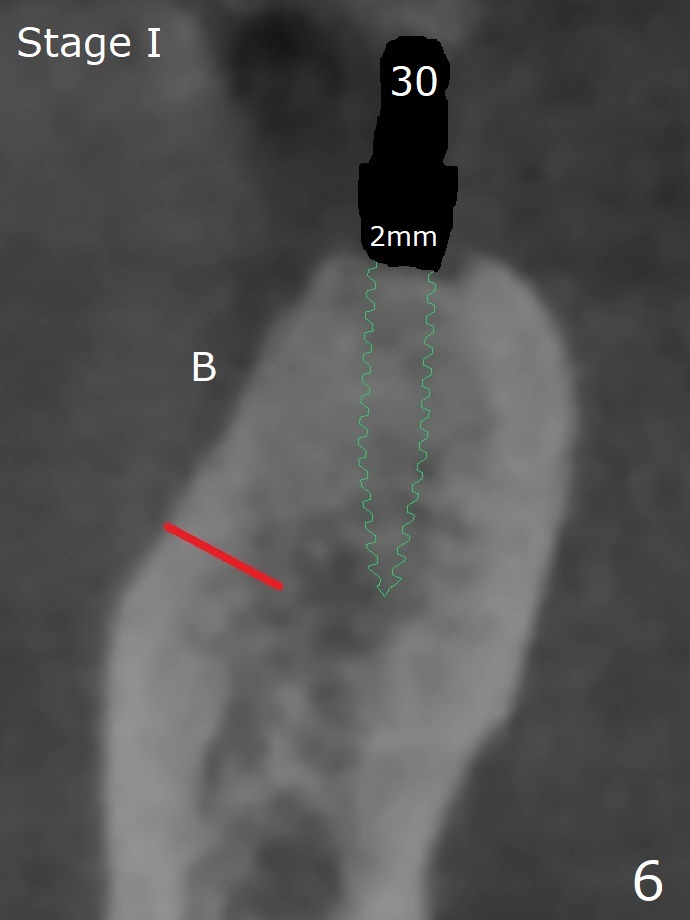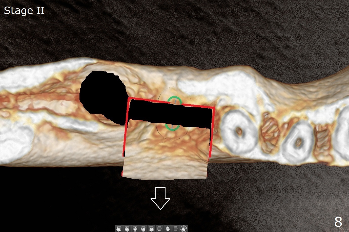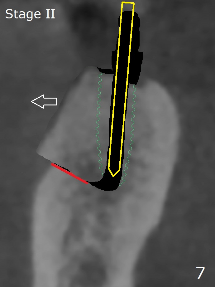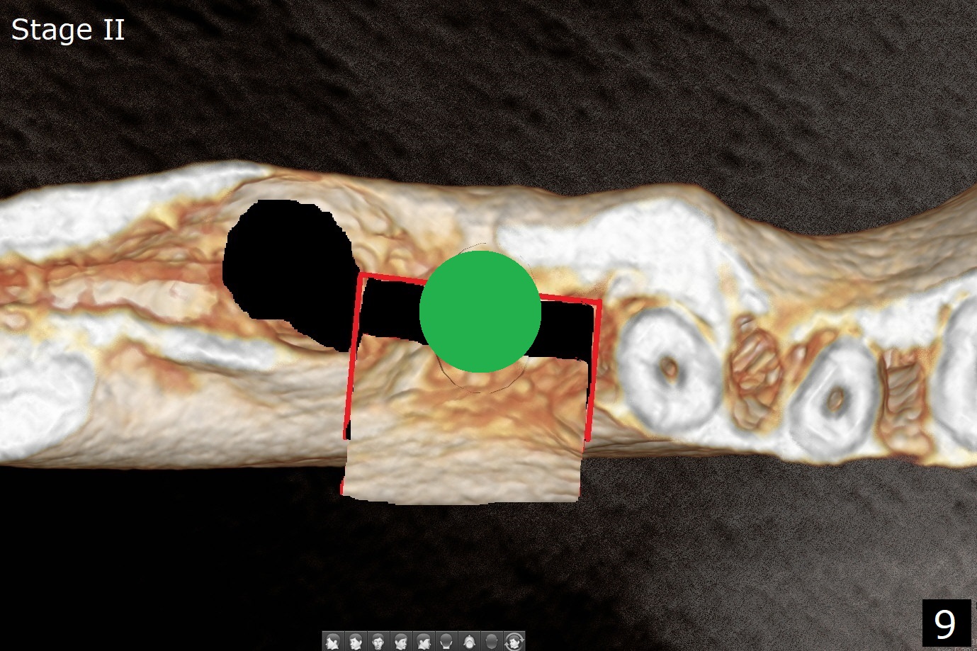 Several months post #31 socket preservation, the narrow ridge of #30 (Fig.1 (CT 3-D occlusal view), 6 (coronal section)) will be exposed with a crestal and 2 oblique incisions, followed by osteotomy with a 2 (2.2) mm drill (green) and a surgical guide. A crestal transverse cut will be conducted using a surgical fissure bur (Fig.2 red), followed by 2 vertical cuts (Fig.3,4 (3-D X-ray mode, buccal view) and an apical transverse one (Fig.5,6). The incision will be closed. Three weeks later, a crestal incision will be made. The buccal plate will be fractured and pushed buccal (Fig.7,8 arrow) using chisel (yellow). The guide will be reseated for osteotomy, implant placement (Fig.9 green) and bone graft. In fact there is not much problem when the osteotomy moves lingual.
