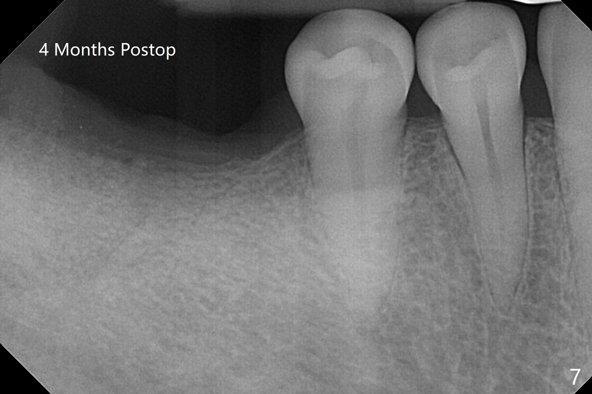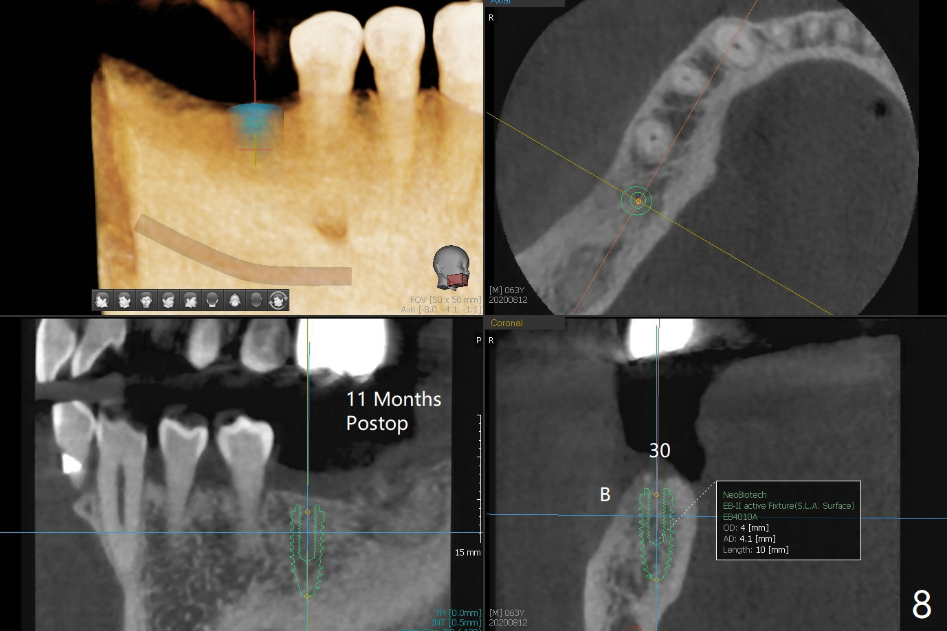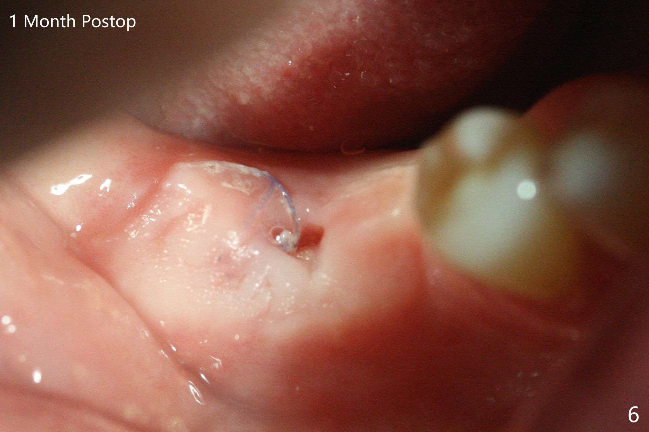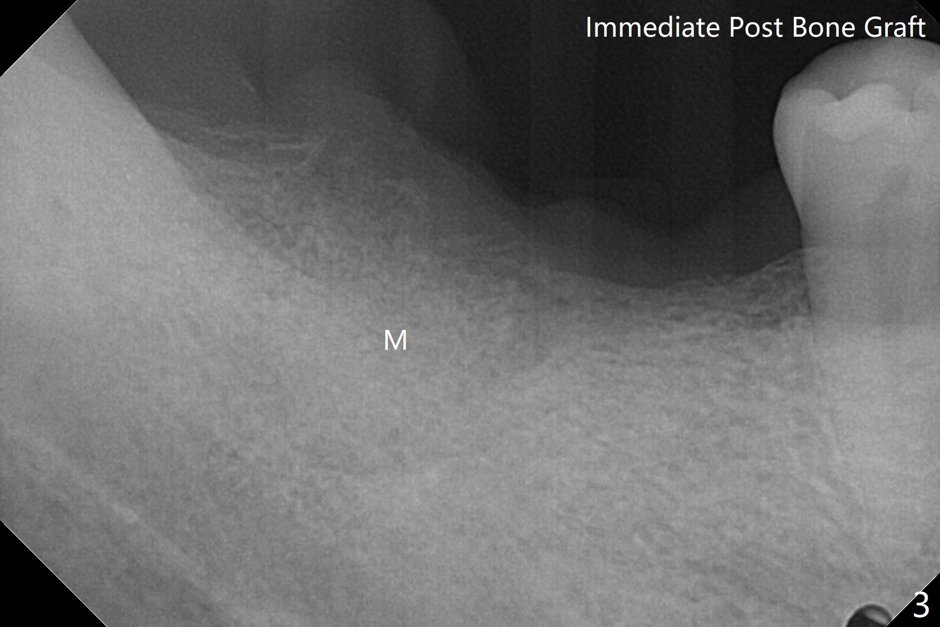 Since the tooth #31 is mesially shifted and tilted with mobility, it would not be a good distal anchor tooth for #30 implant placement with a surgical guide. It is extracted when an implant is placed at #3 so that autogenous bone harvested from the osteotomy at #3 will be mixed with allograft (Vanilla) and alloplast (Osteogen) for #31 socket preservation (Fig.3 M). After Osteogen plug and 6-month membrane are placed over the mixed graft, the socket is approximated with 5-0 PGA (Fig.1,2). The 6-month membrane appears to be retained 5 days postop (Fig.4). The socket reduces substantially nearly 1 month postop (Fig.5,6). The small 2nd molar socket (as compared to the 1st molar one) heals quick. PGA suture should be used more often (for more cases and repeat multiple times for secure closure). The bone density in the graft area increases 4 months postop (Fig.7). The graft remains in site nearly 11 months postop (Fig.8). The ridge #30 will be split with guide. In fact there is not much problem when the osteotomy moves lingual.