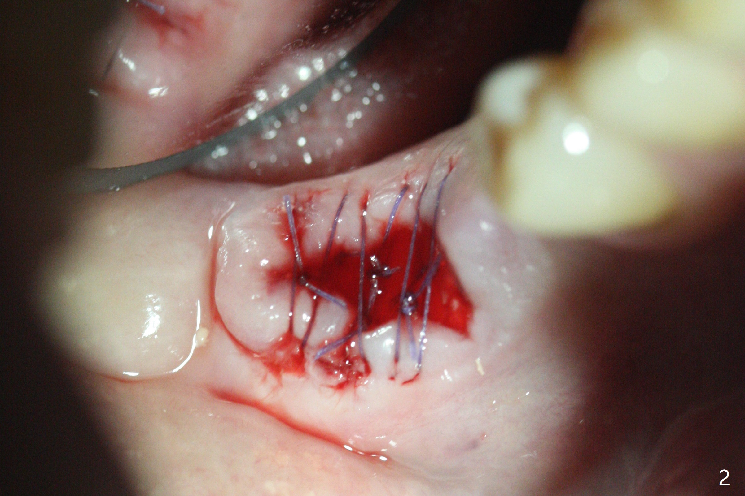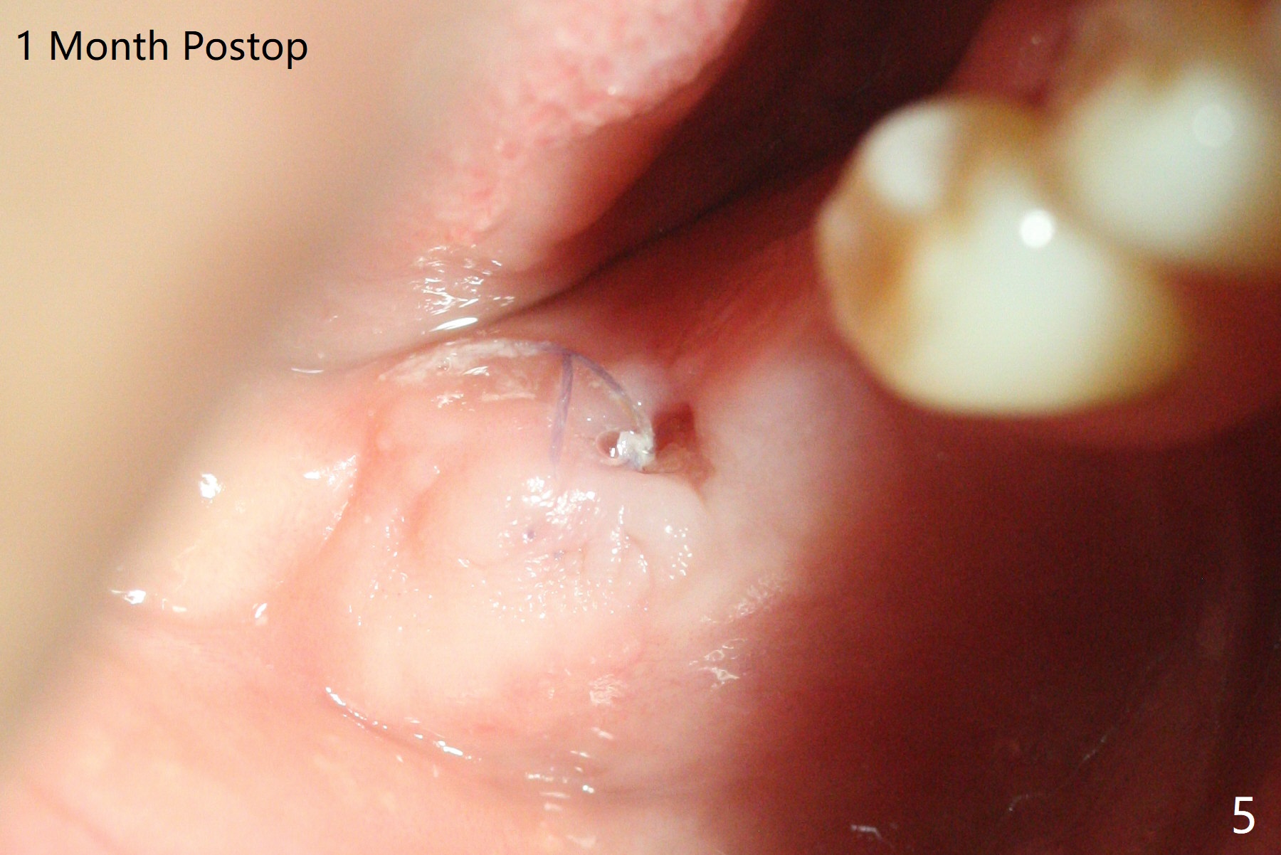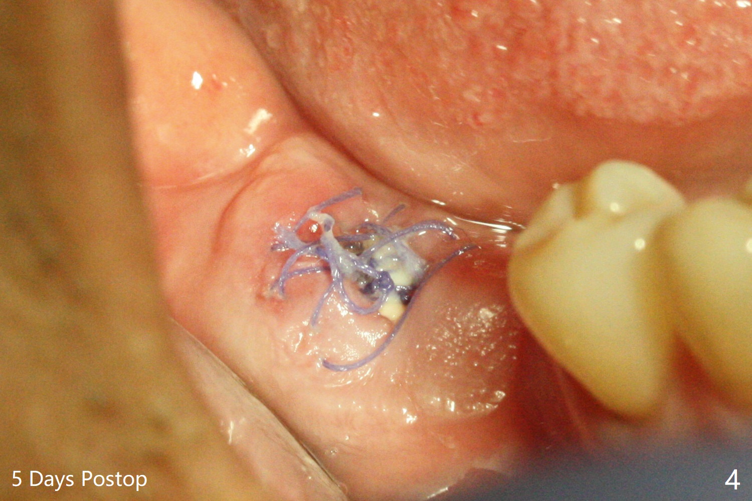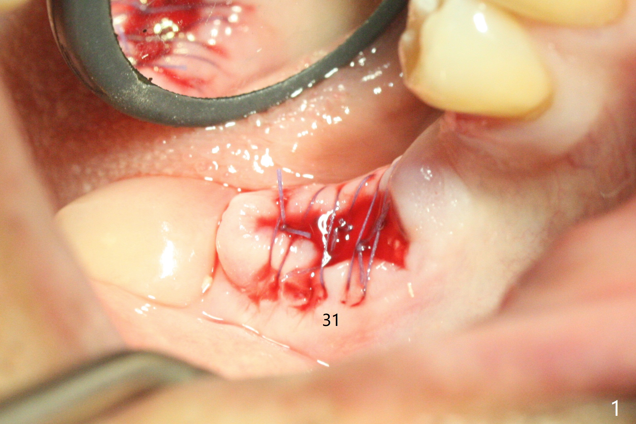 Since the tooth #31 is mesially shifted and tilted with mobility, it would not be a good distal anchor tooth for #30 implant placement with a surgical guide. It is extracted when an implant is placed at #3 so that autogenous bone harvested from the osteotomy at #3 will be mixed with allograft (Vanilla) and alloplast (Osteogen) for #31 socket preservation (Fig.3 M). After Osteogen plug and 6-month membrane are placed over the mixed graft, the socket is approximated with 5-0 PGA (Fig.1,2). The 6-month membrane appears to be retained 5 days postop (Fig.4). The socket reduces substantially nearly 1 month postop (Fig.5,6). The small 2nd molar socket (as compared to the 1st molar one) heals quick. PGA suture should be used more often (for more cases and repeat multiple times for secure closure). The bone density in the graft area increases 4 months postop (Fig.7). The graft remains in site nearly 11 months postop (Fig.8). The ridge #30 will be split with guide. In fact there is not much problem when the osteotomy moves lingual.