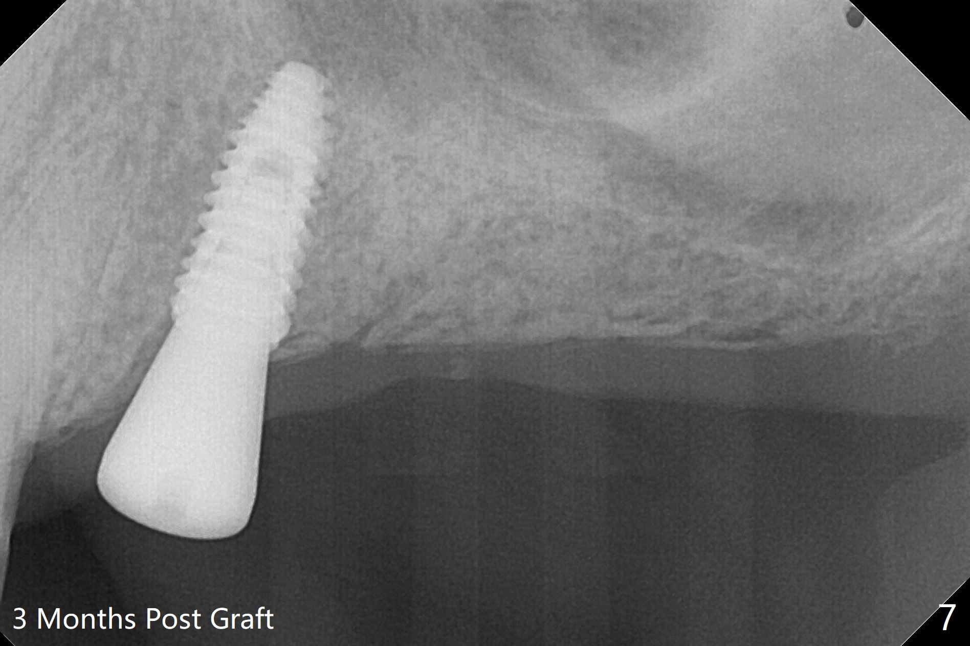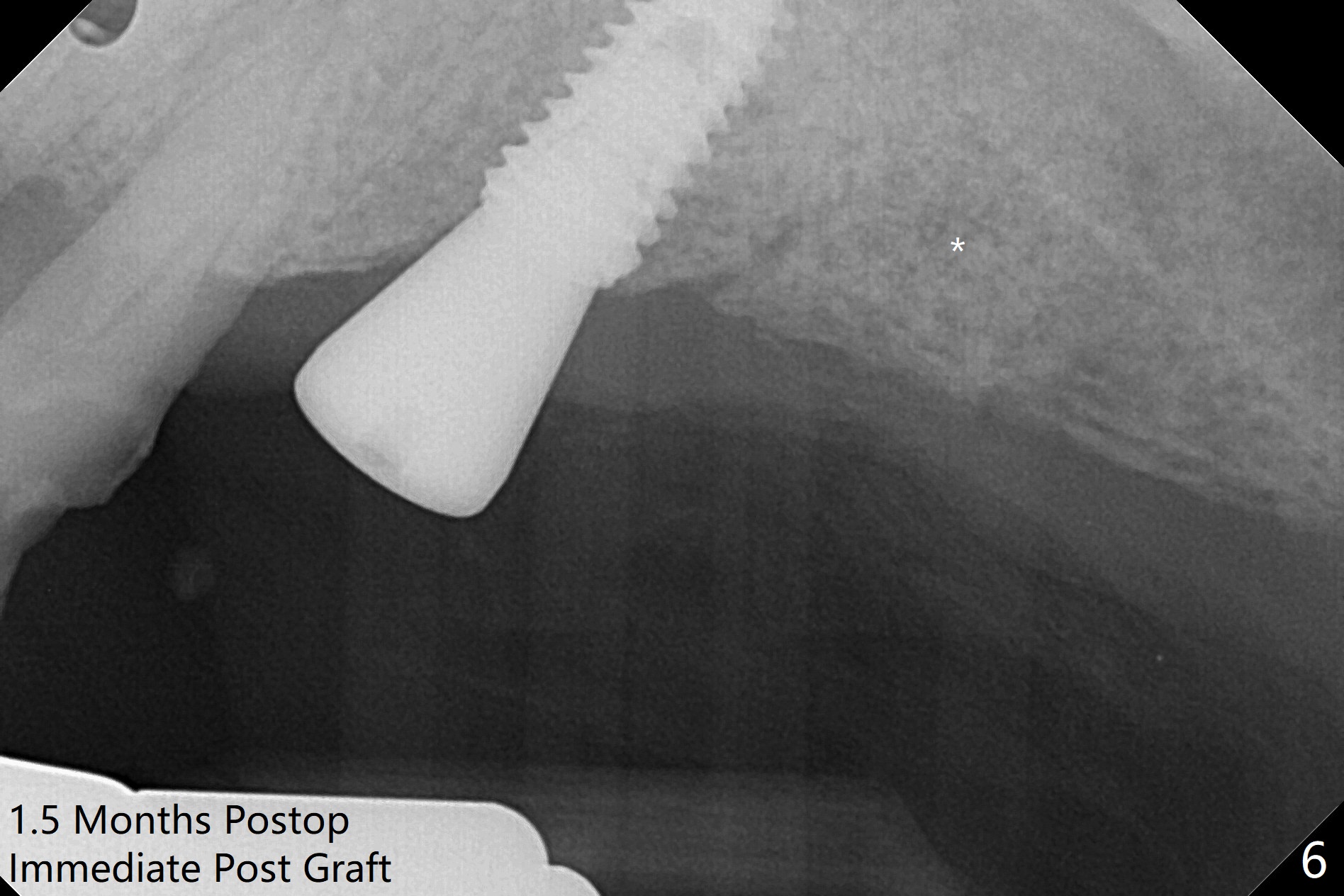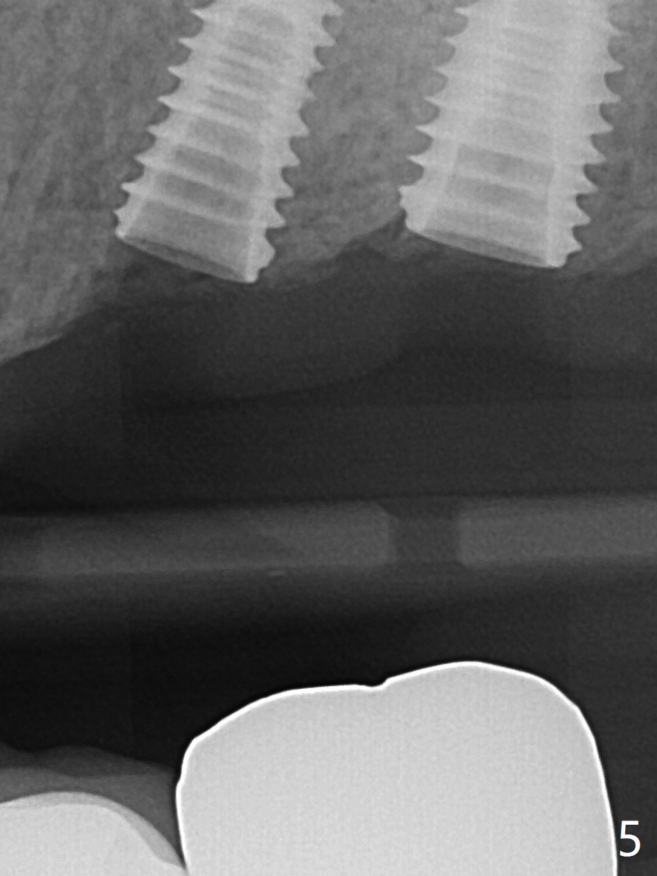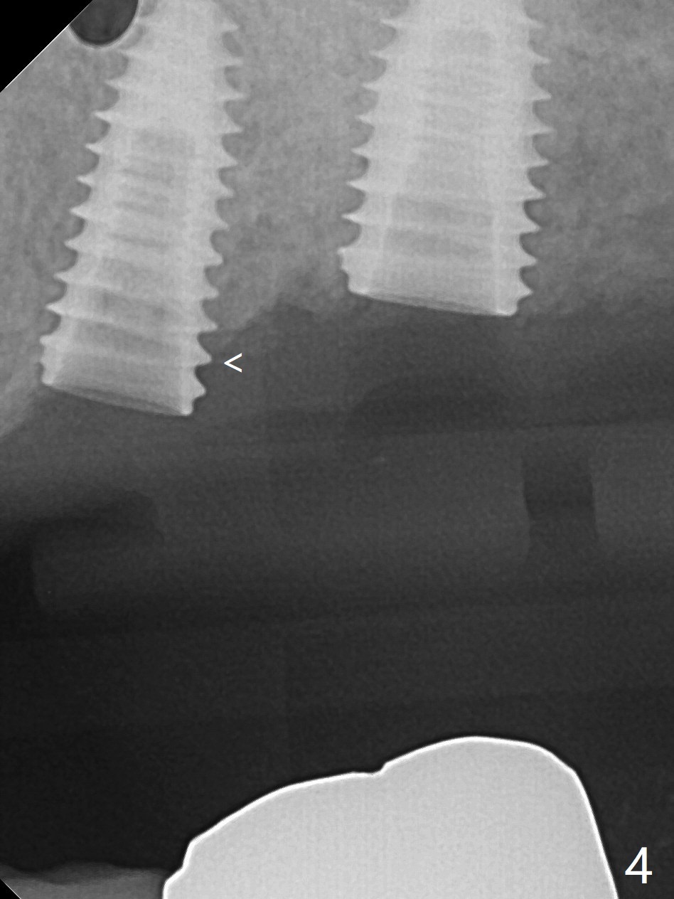 PA is taken after 2.2 mm drill reaches the depth at #13 to confirm that the osteotomy is parallel to the long axis of the tooth #12 (Fig.1). Fixture mount is used to place a 4x10 mm implant at #13 and stays as an anchor pin while osteotomy and sinus lift are being conducted at #14 (Fig.2). In fact there is discrepancy in depth using the guide. For example the last drill for osteotomy is 4.5x7.3 mm according to design, whereas 4.5x11.5 mm drill has to be used before the sinus floor has small area of perforation without sinus membrane breakage. Autogenous bone harvested from the osteotomy, PRF membrane and a 4.5x10 mm dummy implant are used for sinus lift (Fig.2). The placement depth of the implant at #13 has to be adjusted multiple times until satisfaction (Fig.2-5). The implant at #14 is infected and loosened 1.5 months postop; after its removal, the sinus floor is absent without membrane perforation; the large defect with basically intact buccal and palatal walls is grafted (Fig.6 *). Four to five months later, use the same guide and drill sequence until 3.5x7.3 mm drill. Insert a 4x10 mm dummy implant to the 2nd line of 12 mm offset and take 5x5 cm CT to determine the diameter and depth of a final implant. Use healing screw. The pattern of bone graft changes 3 months postop (Fig.7, as compared to Fig.6). Return to Upper Arch Immediate Implant, Trajectory II 矫正,糖尿病,种植水平 Xin Wei, DDS, PhD, MS 1st edition 08/06/2019, last revision 12/06/2020