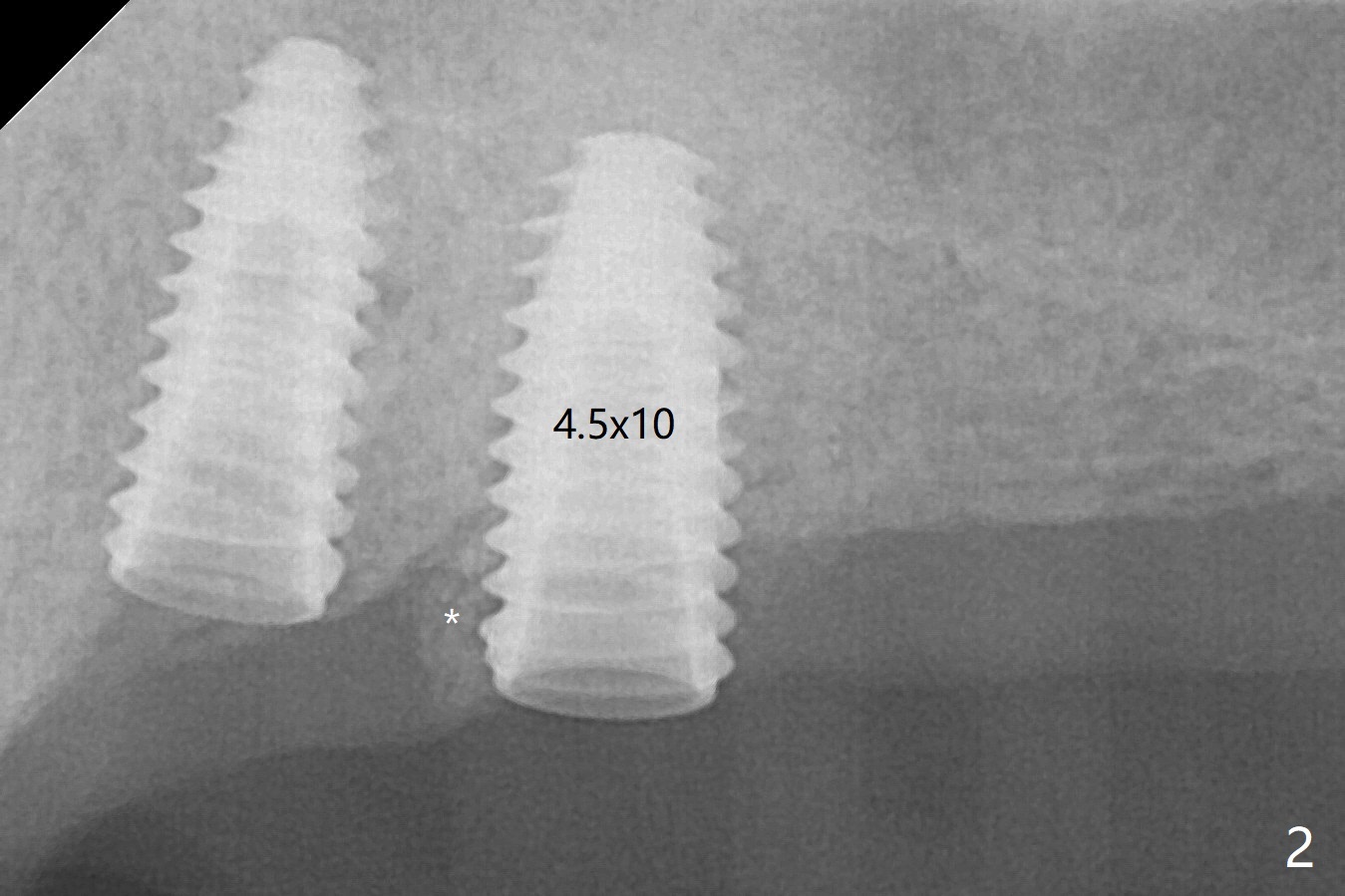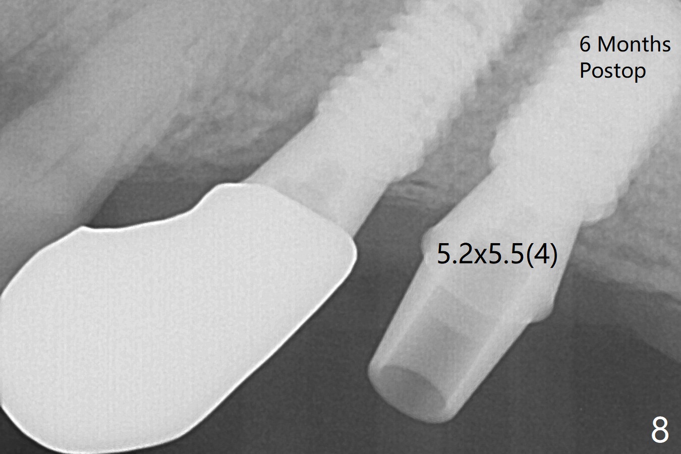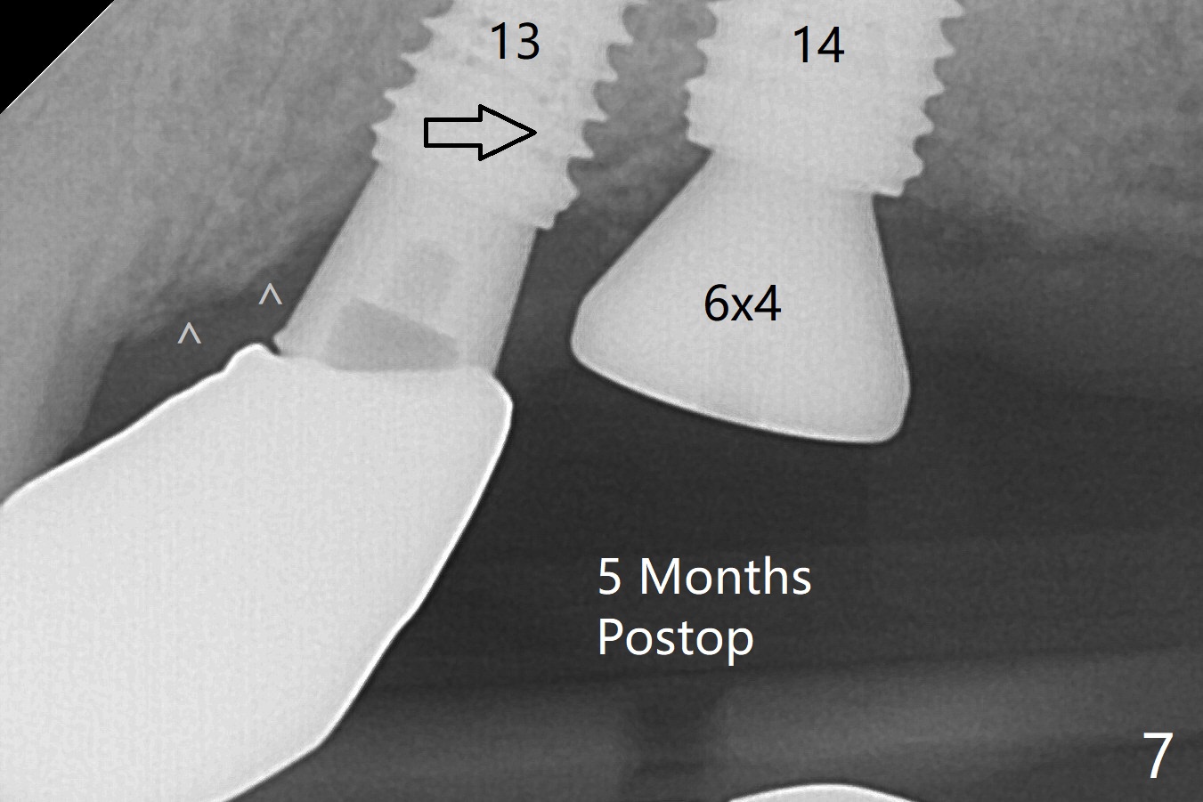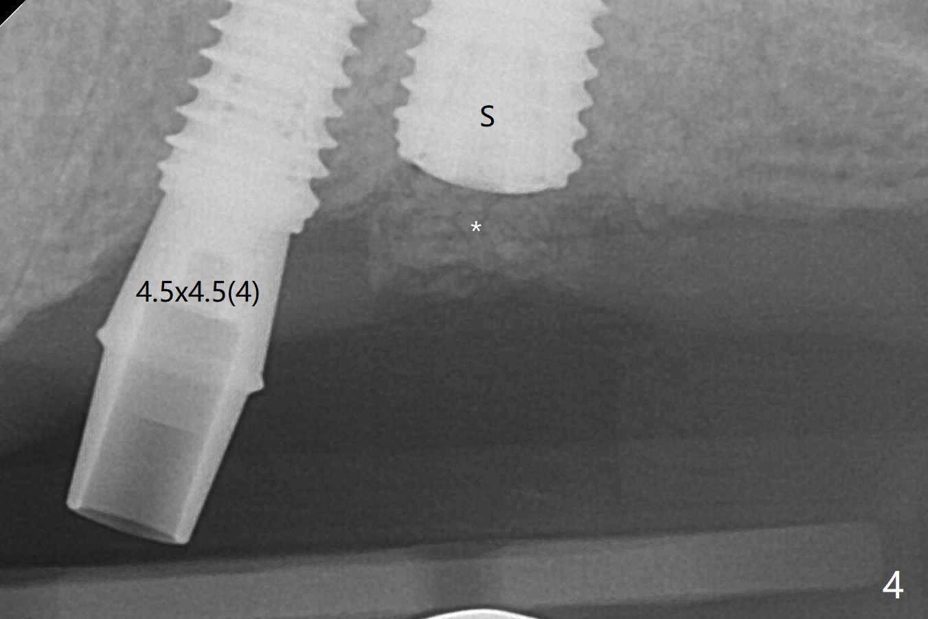 Three months post #14 implant removal and bone graft, the existing guide is reused, but no stop fixture mount cannot be inserted into #13 implant as an anchor. After 3.5x7.3 mm drill with 12 mm offset, the bottom of the osteotomy is not so hard; therefore sinus lift is conducted with allograft and 4x10 mm dummy implant (Fig.1). The lifted sinus floor is in fact not noted during the surgery (Fig.1 dashed red line). Sinus lift continues with bone graft and 4.5x10 mm (Fig.2); bone graft is squeezed out (*). The final implant (5x8.5 mm) is not seated until use of 4.5x7.3 and 4.0x10 mm drills (Fig.3). The implant is further placed free hand until subcrestal distal; since the torque is not high, a healing screw (S) is placed with packing allograft around the plateau of the implant (*). By placing a 4.5x4.5(4) mm cemented abutment at #13, a provisional is fabricated with extension to cover the bone graft at #14. When the provisional dislodges 1.5 months postop, #14 wound does not heal with the erythematous gingiva and exposed healing screw (Fig.5). Diabetes is not well controlled (HbA1c >6% (normal 4-5.6%)). Poor oral hygiene is another contributing factor in failure. After cleaning and torque 30 Ncm of the abutment at #13, impression is taken. In fact the tooth #12 has lost the palatal cusp (Fig.6 <); a crown will be fabricated at #12 when the implant at #14 osteointegrates. The implant at #14 is uncovered 5 months postop (Fig.7 (6.8x3 mm healing abutment)). The implants of #13 and 14 are close to each other, which is related to the slanted ridge at #13 (^). The osteotomy and the implant slide distal during placement (arrow). The implant in the slanted ridge should be intentionally placed mesial to compensate for the shifting. Or the ridge should be trimmed precisely; open surgery is necessary. A 5.2x5.5(4) mm cemented abutment is apparently completely seated with 35 Ncm torque 6 months postop (Fig.8). Although the distal plateau of the implant is exposed when the provisional is removed, post cementation bitewing shows equicrestal placement distal (Fig.9).