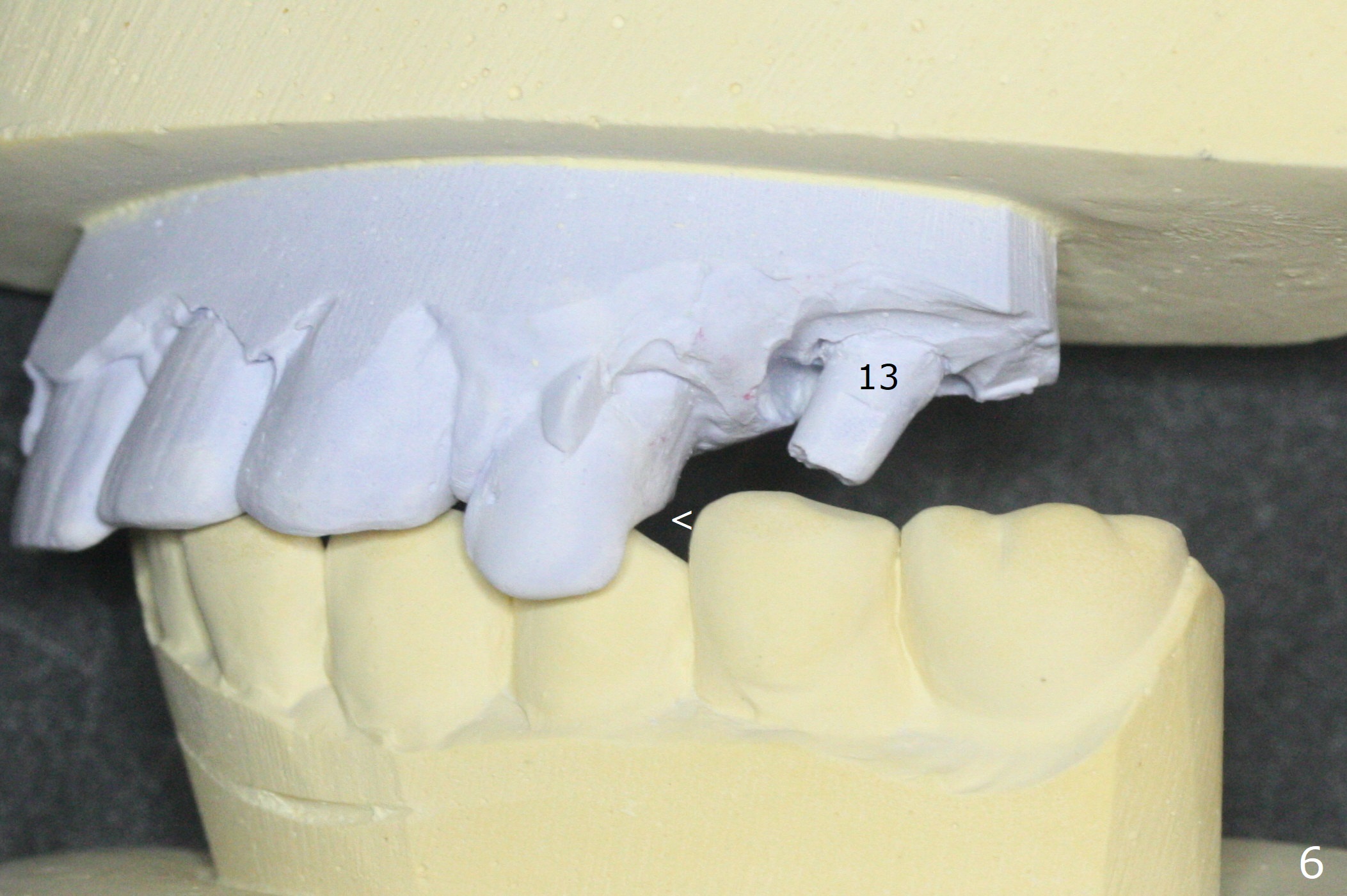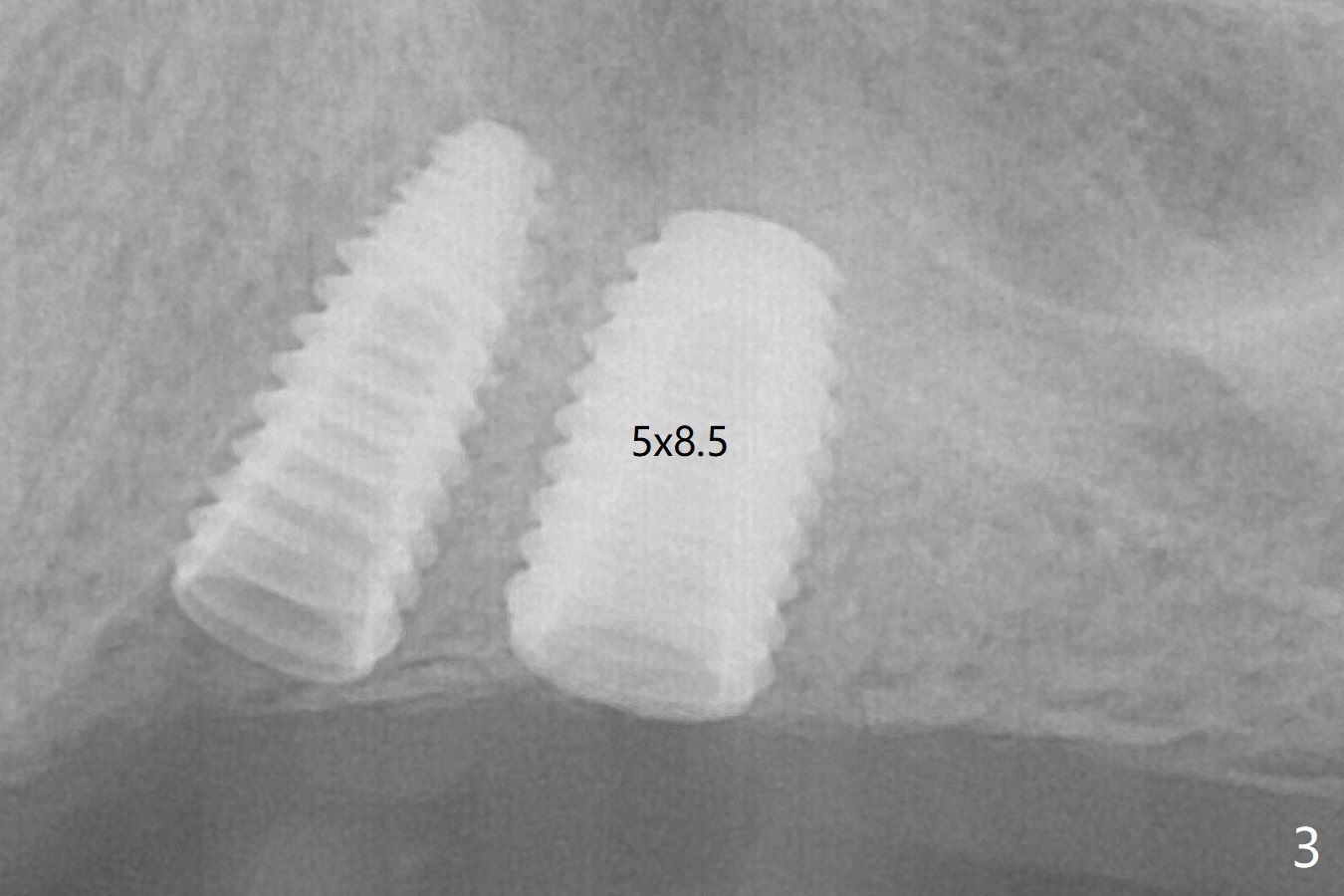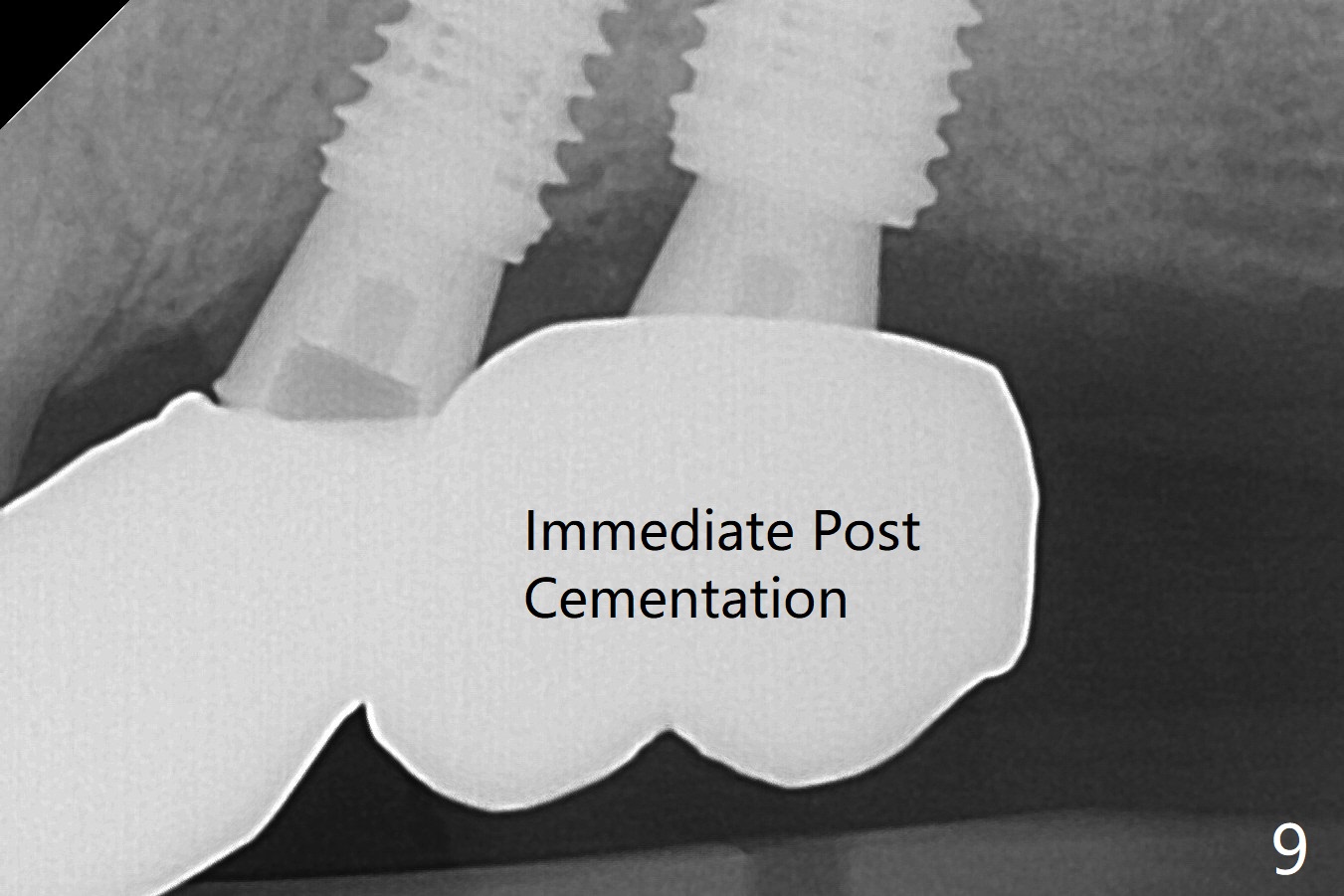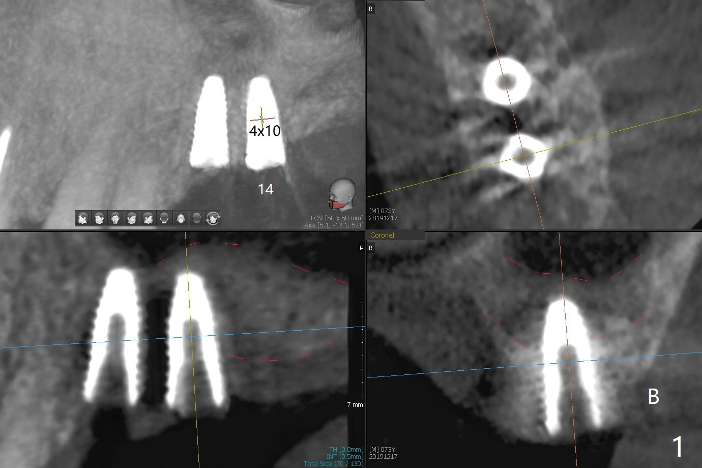 Three months post #14 implant removal and bone graft, the existing guide is reused, but no stop fixture mount cannot be inserted into #13 implant as an anchor. After 3.5x7.3 mm drill with 12 mm offset, the bottom of the osteotomy is not so hard; therefore sinus lift is conducted with allograft and 4x10 mm dummy implant (Fig.1). The lifted sinus floor is in fact not noted during the surgery (Fig.1 dashed red line). Sinus lift continues with bone graft and 4.5x10 mm (Fig.2); bone graft is squeezed out (*). The final implant (5x8.5 mm) is not seated until use of 4.5x7.3 and 4.0x10 mm drills (Fig.3). The implant is further placed free hand until subcrestal distal; since the torque is not high, a healing screw (S) is placed with packing allograft around the plateau of the implant (*). By placing a 4.5x4.5(4) mm cemented abutment at #13, a provisional is fabricated with extension to cover the bone graft at #14. When the provisional dislodges 1.5 months postop, #14 wound does not heal with the erythematous gingiva and exposed healing screw (Fig.5). Diabetes is not well controlled (HbA1c >6% (normal 4-5.6%)). Poor oral hygiene is another contributing factor in failure. After cleaning and torque 30 Ncm of the abutment at #13, impression is taken. In fact the tooth #12 has lost the palatal cusp (Fig.6 <); a crown will be fabricated at #12 when the implant at #14 osteointegrates. The implant at #14 is uncovered 5 months postop (Fig.7 (6.8x3 mm healing abutment)). The implants of #13 and 14 are close to each other, which is related to the slanted ridge at #13 (^). The osteotomy and the implant slide distal during placement (arrow). The implant in the slanted ridge should be intentionally placed mesial to compensate for the shifting. Or the ridge should be trimmed precisely; open surgery is necessary. A 5.2x5.5(4) mm cemented abutment is apparently completely seated with 35 Ncm torque 6 months postop (Fig.8). Although the distal plateau of the implant is exposed when the provisional is removed, post cementation bitewing shows equicrestal placement distal (Fig.9).