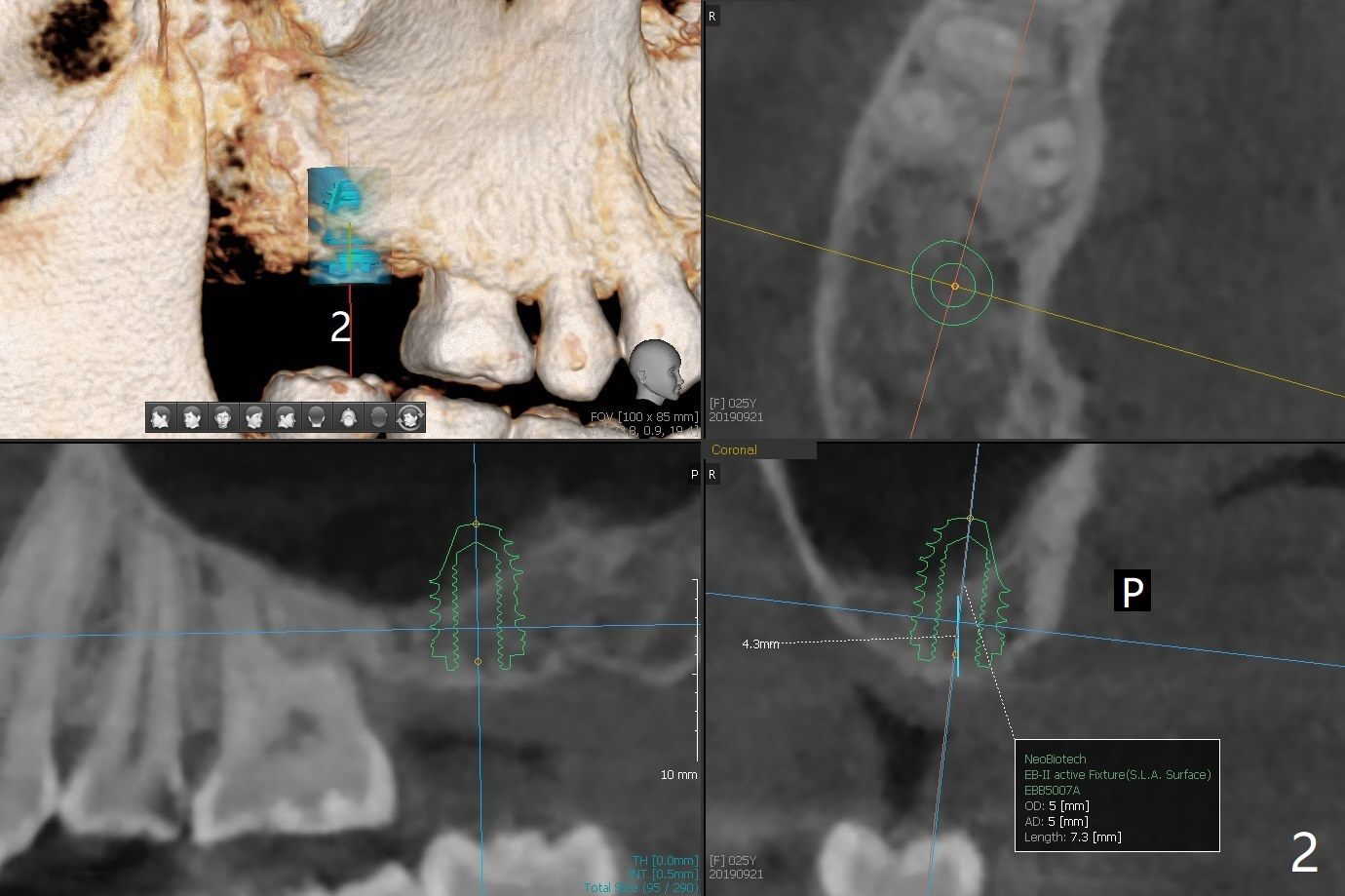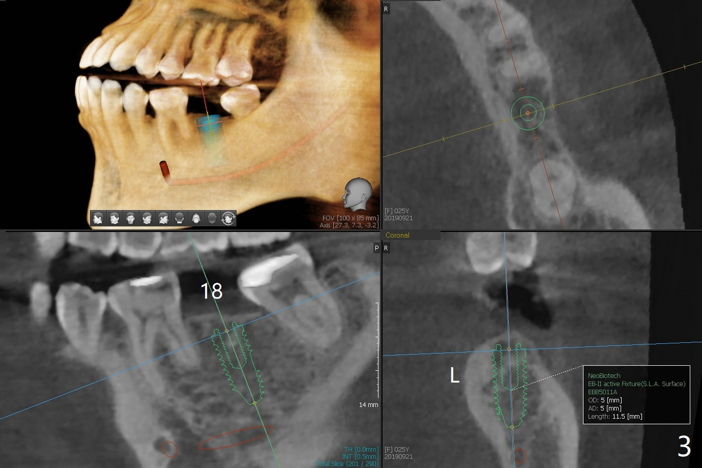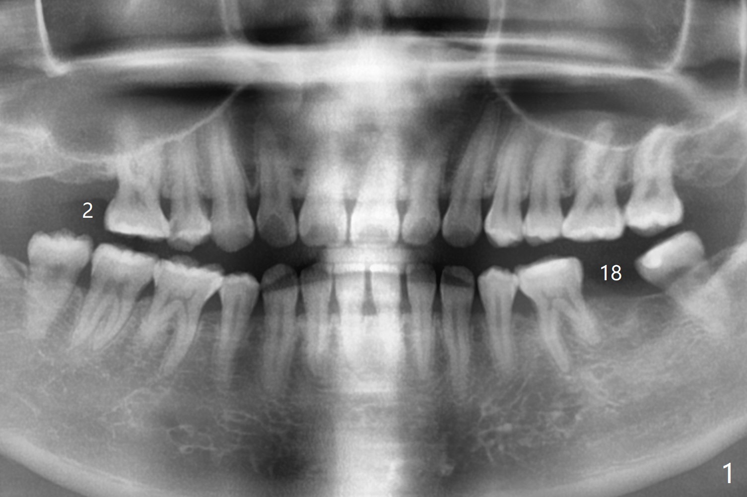 A 25-year-old woman had #2 and 18 extracted ~ 1 year ago (Fig.1). Because of the short and loose bone at #2, a short implant will be placed with sinus lift (PRF, Fig.2). If needed, probe mesiobuccal aspect of the osteotomy when it is close to the sinus floor to detect early sinus floor perforation before water lifting. It would be safer to use water lifting after the 1st sinus safe drill is used. Then water lifting and the 2nd sinus safe drill, et al. To reduce micromovement, a healing screw will be most likely placed instead of a healing abutment. In contrast, a healing abutment is possible at #18 (Fig.3).