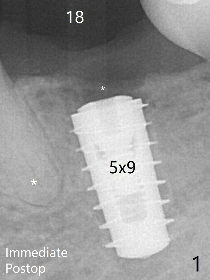 A layer of new bone forms on the top of the implant 3 months postop (Fig.4 *). It will be removed with surgical handpiece and profile drill.