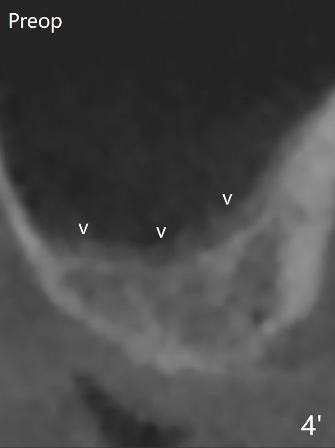 Although bone graft around the implant is limited (Fig.3,4 *), the sinus membrane is lifted (in fact expanded by water) substantially (arrowheads, as compared to preop CT (Fig.4')).