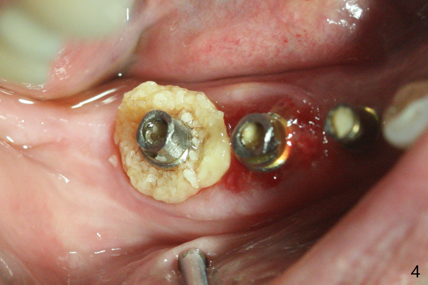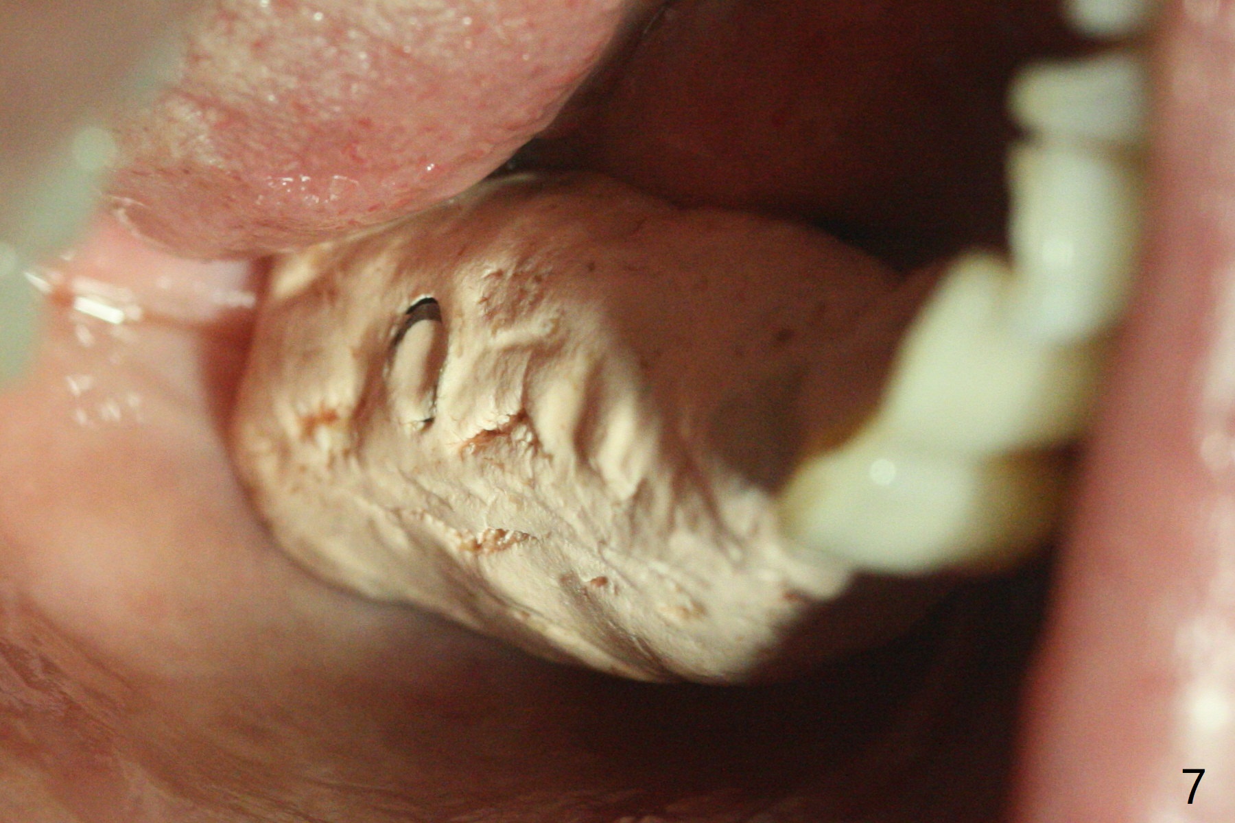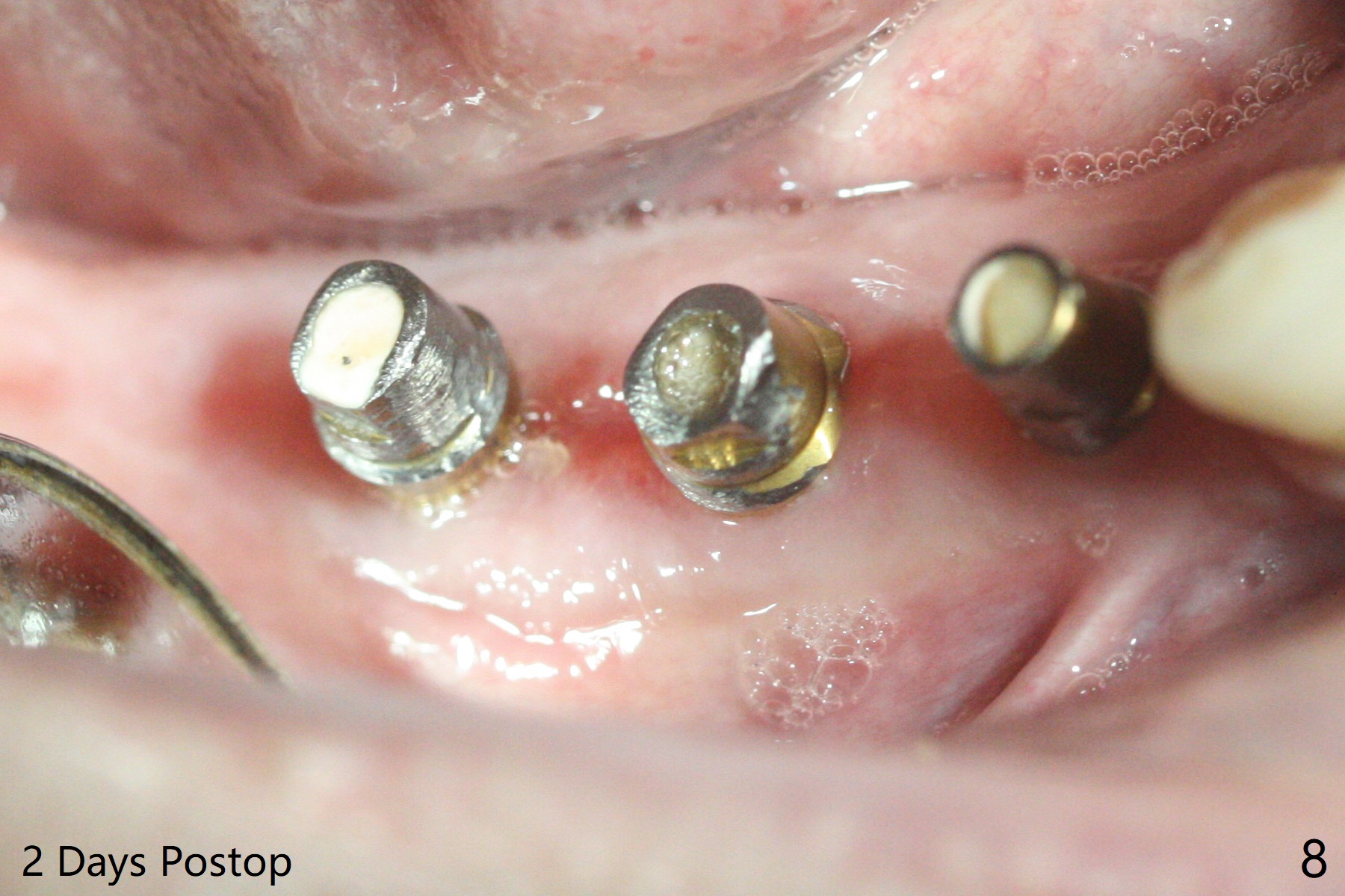 右下4-6种植后3.5月制作临时牙桥(保险的钱用完了),虽然不舒服,病人也没有及时复诊。新年过后(术后11月),她回来修复,但是临时牙桥下沉,造成牙龈退缩(图一),6螺纹暴露(图二:>),粘性骨粉中间形成一个洞眼(图三),插入6基台固定(图四),同样PRF膜也形成两三个洞眼固定在基台上(图五)。当粘性骨粉放置时,暴露螺纹已经被血凝块覆盖,舍不得去除,所以骨粉就不能接触螺纹(图六),最后用牙周敷料固定(图七),想象比树脂敷料服帖。不过2天后,牙周敷料脱落,骨粉丧失,伤口好像已经愈合(图八),没有做任何处理。今后类似病例应该在基台上涂抗病毒凡士林(以后好撤除),使用树脂敷料。Return to No Deviation Xin Wei, DDS, PhD, MS 1st edition 01/05/2021, last revision 01/08/2021