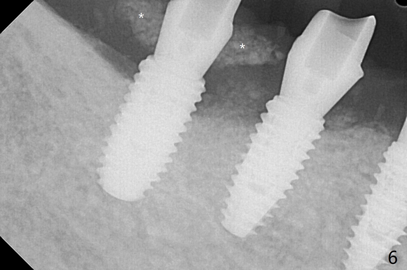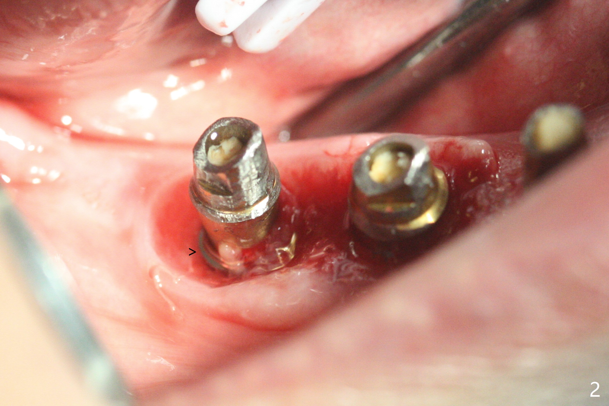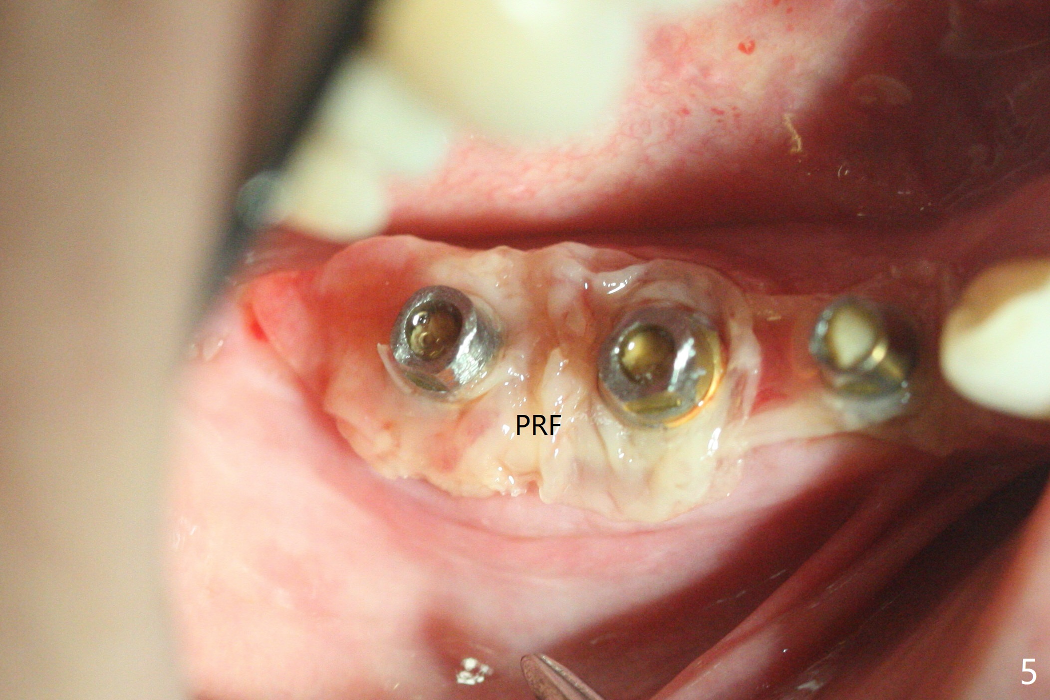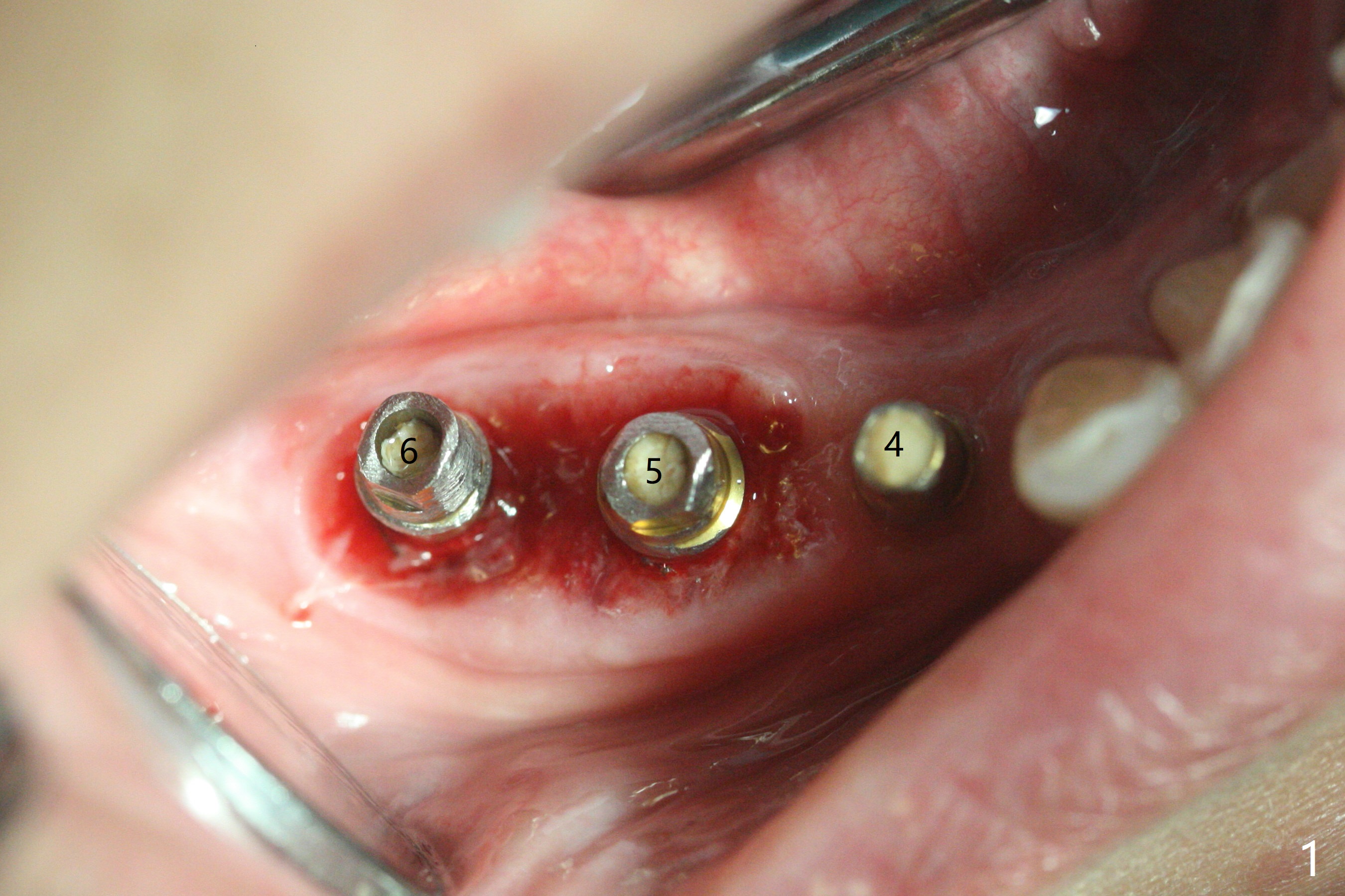 右下4-6种植后3.5月制作临时牙桥(保险的钱用完了),虽然不舒服,病人也没有及时复诊。新年过后(术后11月),她回来修复,但是临时牙桥下沉,造成牙龈退缩(图一),6螺纹暴露(图二:>),粘性骨粉中间形成一个洞眼(图三),插入6基台固定(图四),同样PRF膜也形成两三个洞眼固定在基台上(图五)。当粘性骨粉放置时,暴露螺纹已经被血凝块覆盖,舍不得去除,所以骨粉就不能接触螺纹(图六),最后用牙周敷料固定(图七),想象比树脂敷料服帖。不过2天后,牙周敷料脱落,骨粉丧失,伤口好像已经愈合(图八),没有做任何处理。今后类似病例应该在基台上涂抗病毒凡士林(以后好撤除),使用树脂敷料。Return to No Deviation Xin Wei, DDS, PhD, MS 1st edition 01/05/2021, last revision 01/08/2021