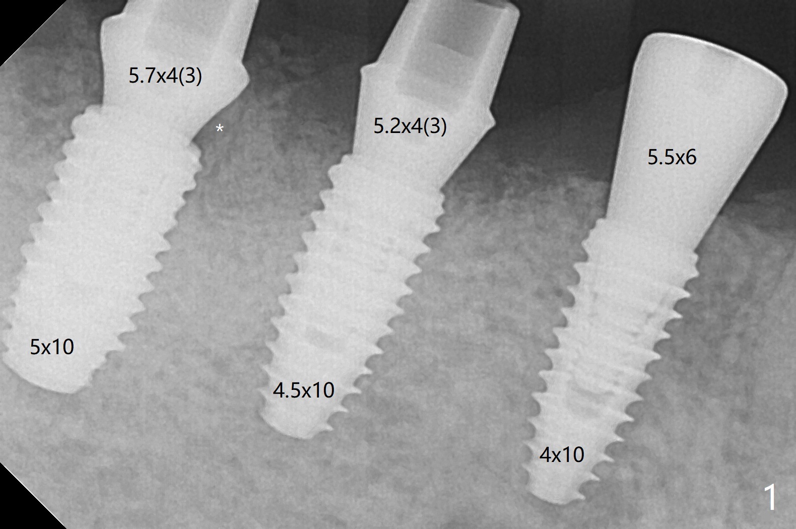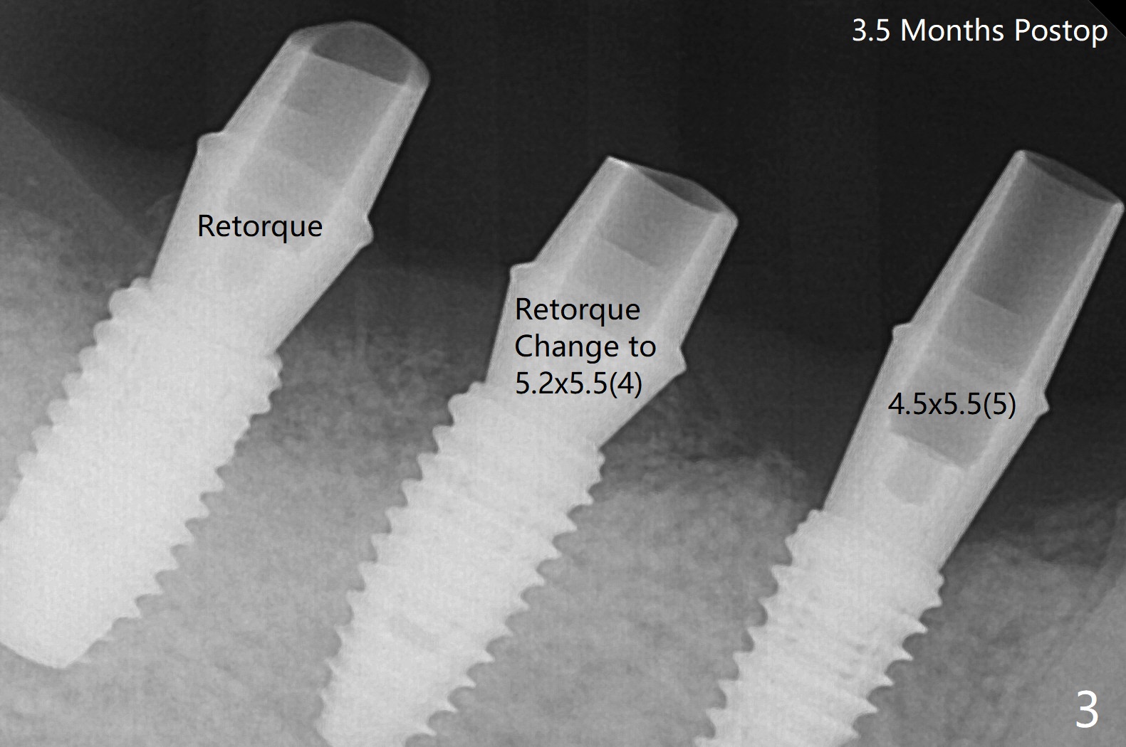 Implant placement with guide at #28-30 is smooth, but abutment placement at #30 is in-complete in spite of use of 5.5 and 6.0 mm profile drills, probably related to inter-ference from the septal bone (Fig.1 *). Switch to a narrower abutment with longer cuff after reuse of the profile drills does not help; there is a vertical gap between the abutment and implant (Fig.2 ^), whereas there is a horizontal gap between them in Fig.1. The defect between the implants of #29 and 30 is filled with sticky bone, followed by PRF. The wound is sutured with 4-0 PGA and perio-dontal dressing. The incom-pletely seated abutment should be retightened or removed ~ 1 month postop when the socket heals to prevent bone loss. Three and a half months postop, a 4.5x5.5(5) mm cemented abutment is placed and torqued to 30 Ncm at #28 after removal of the healing abutment (Fig.3). At the same time, the cemented abutments at #29 and 30 are removed for cleaning and then re-placed and torqued. Note the complete seating of the abutment at #30, as compared to Fig.2. Since the abutment at #29 (5.2x4(3) mm) is subgingival mesially with possible biologic width violation (close to bone graft, Fig.3), it is later changed to 5.2x5.5(4) mm one.