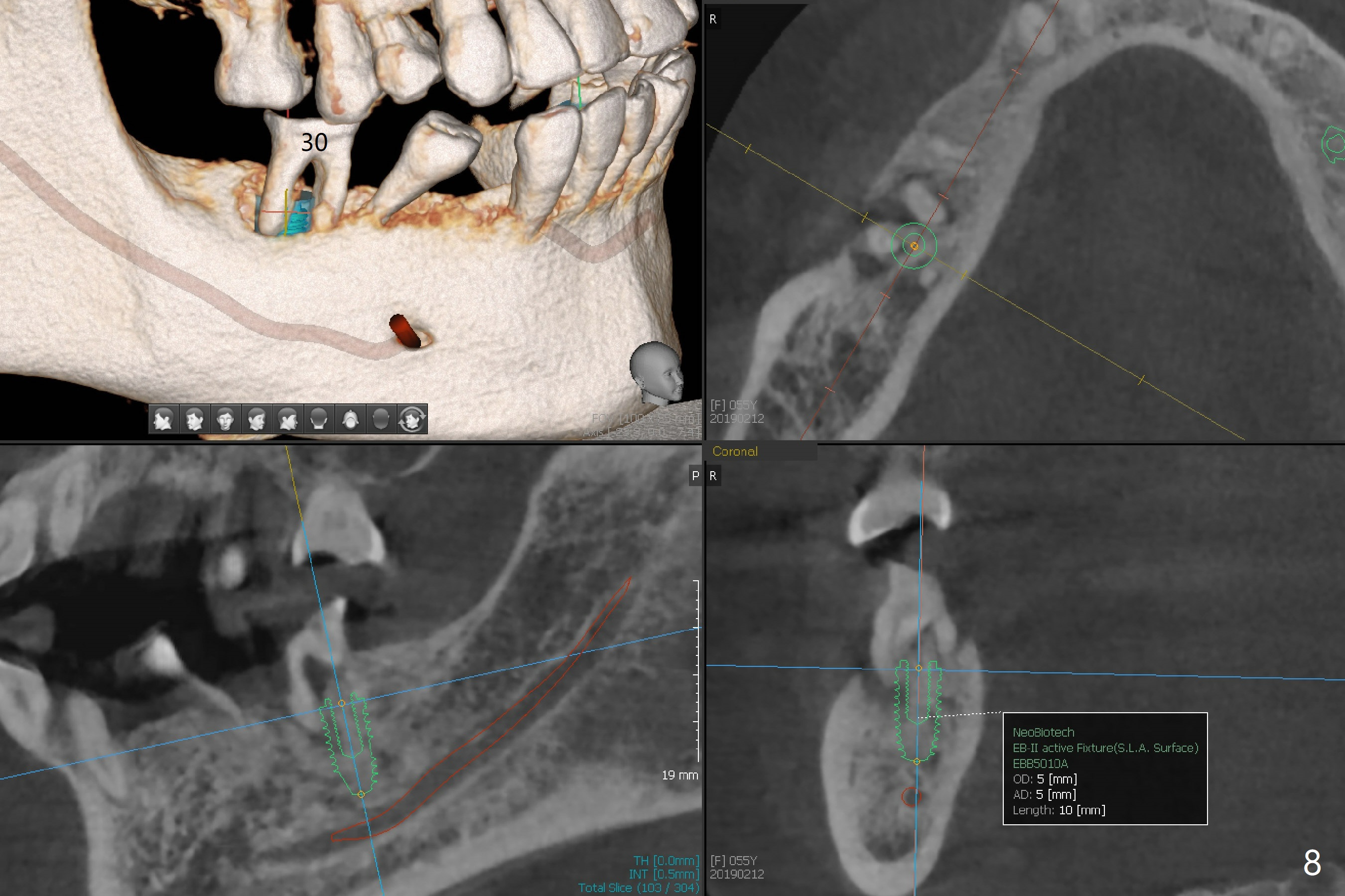 A 55-year-old woman has poor dentition, which is partially related to her previous history of ice chewing (Fig.1). The long bone height in the jaws suggests bruxism and requires as many teeth and implants as possible. After SRP, caries will be removed from #14 and 15 for determination of salvageability (Fig.2). The patient prefers to save the tooth #30. Endo referral will be recommended for #14 and 30. If the tooth #14 proves to be nonsalavageable, it will be extracted with #12 for immediate implants and subsequent FPD (Fig.3,4). Immediate implant will be avoided at #19 due to severe bone loss. Instead a short implant (5.5x5 or 6 mm) will be placed at #18, while a 4x11.5 mm one at #20 for FPD (Fig.5,6). All of the implant will use guides. There is a special point at #18. After use of 4.5 mm drill, the guide will be removed for free hand osteotomy using 5.0 mm drill, 5.5 mm tap and implant placement. PRF will be prepared for membrane and sticky bone at #19 and 20. For the lower right quadrant, treatment for #30 should be conducted first, either RCT or implant. The tooth #29 will be uprighted using #30 as an anchor, if the former is salvageable. The implant at #28 will be placed last (Fig.7,8).