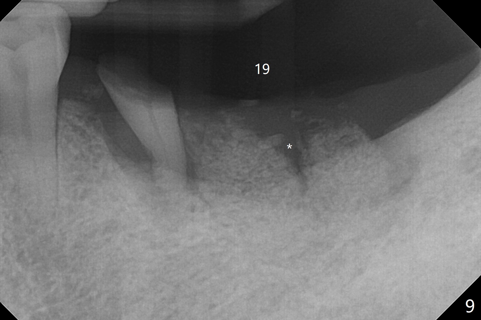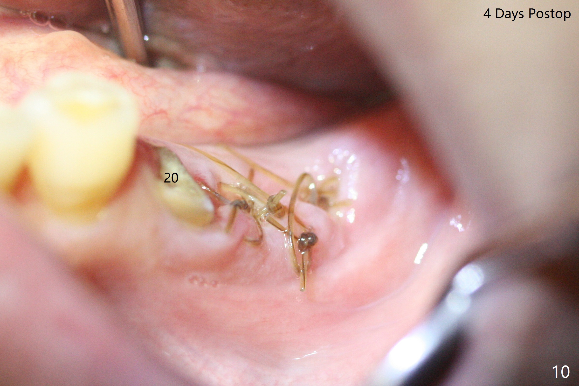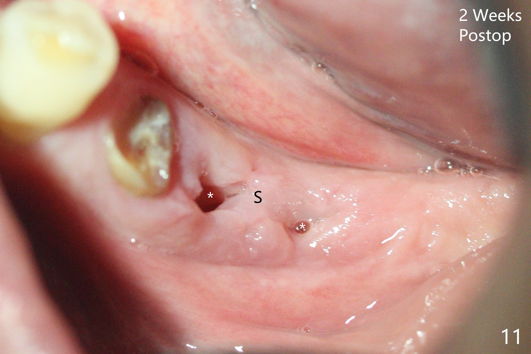 Next appointment for SRP, the patient requests extraction the loose tooth #19. There is no time for #20 extraction and socket preservation (Fig.9). With preservation of the septal gingiva (Fig.9 *), the socket opening is small without exposure of the bone graft 4 days postop, when the periodontal dressing is lost (Fig.10). Because of the gingiva superior to the septum (Fig.11 S), the openings of the mesial and distal sockets (*) are easily being closed 2 weeks postop.