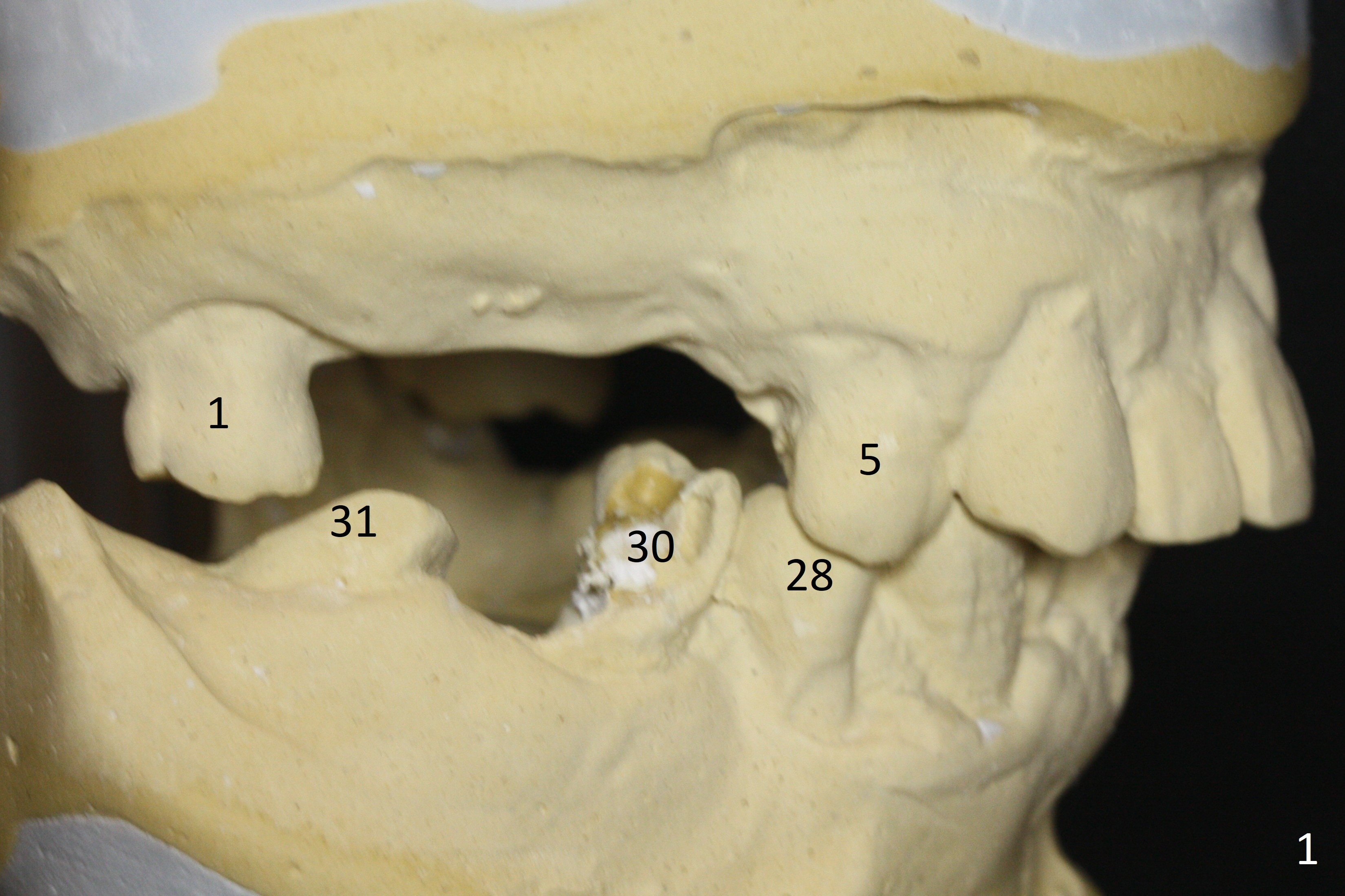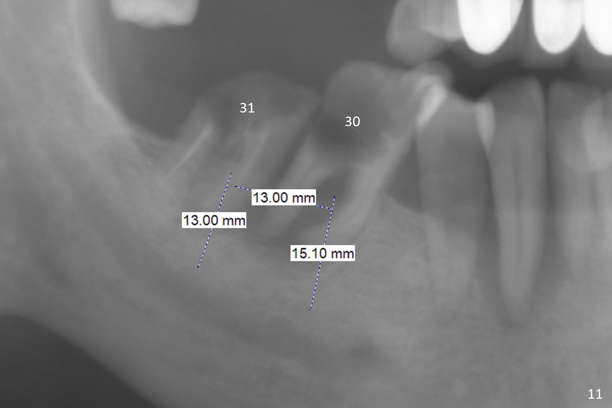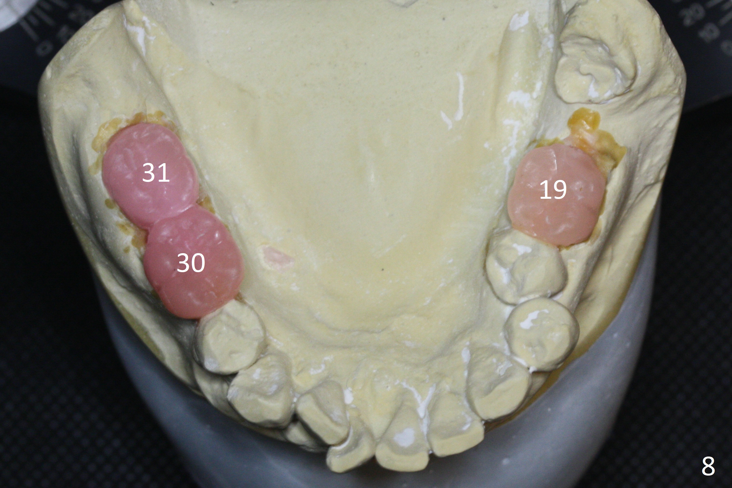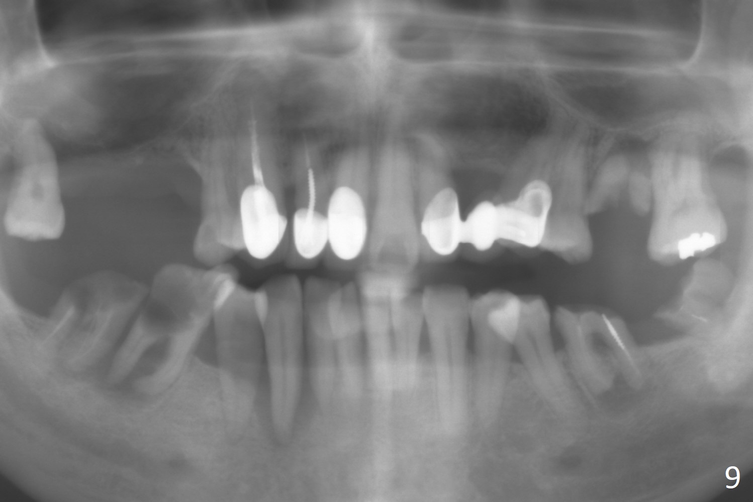 A 54-year-old man is 5 years post liver cancer surgery. After his platelet count returns normal, he wants to take care of his teeth. Most of his molars (#14, 19, 30,31) need extraction and implant placement (Fig.1-4). Although the 2nd premolars on the right are missing (Fig.1,3,4), it seems appropriate to establish 2 molar occlusion on the right (Fig.5,7,8) and 1 on the left (Fig.6,7 (because of #15 supraeruption (Fig.2 arrow))) . Since the residual roots in the lower right quadrant are irritating, implant placement will be done first (Fig.11, Clindamycin), followed by #2,3 (Fig.10) and 14(Fig.12 IBS) and 19 (Fig.12). Use IS drills and 4 and 5 mm stoppers to start osteotomy at #30 and 31, respectively.