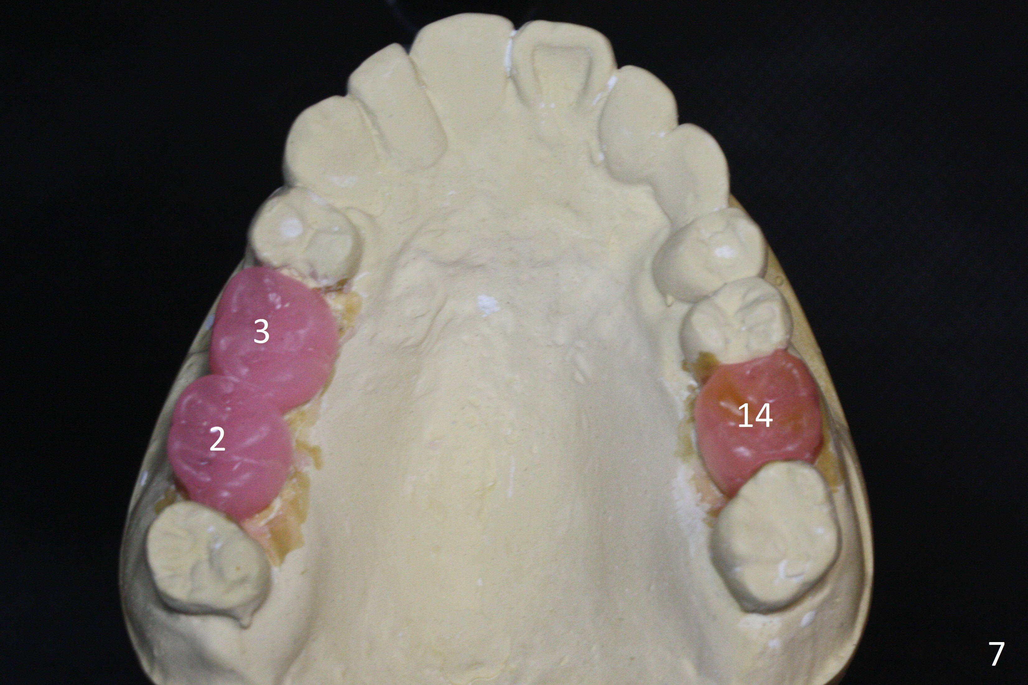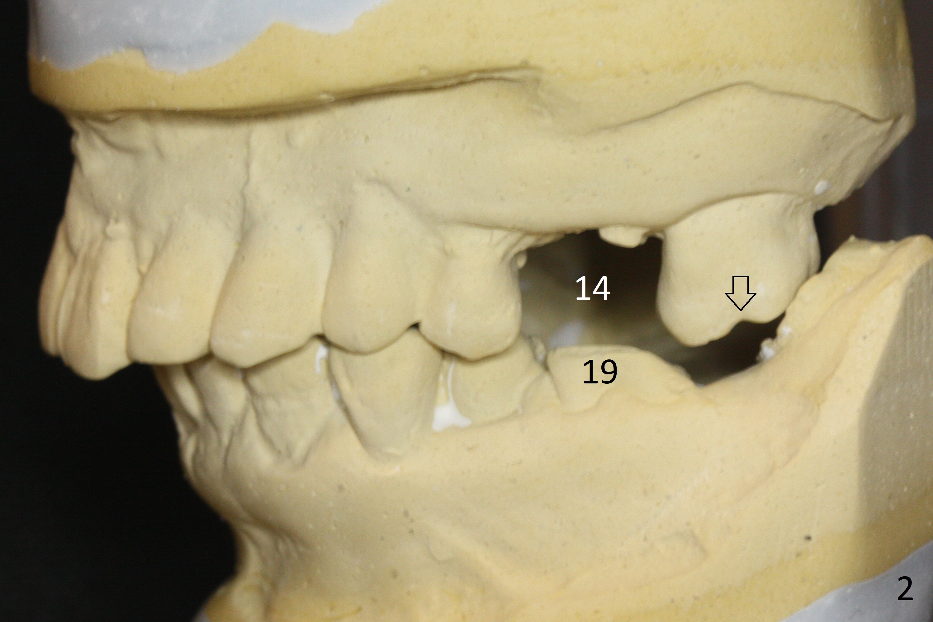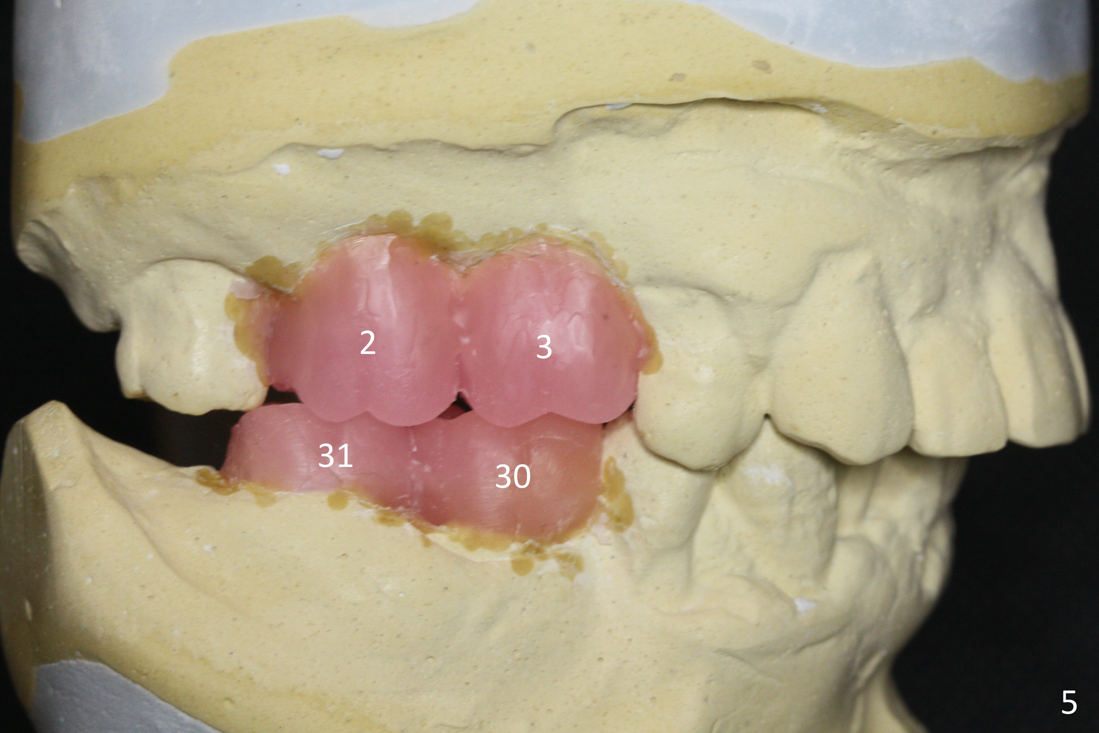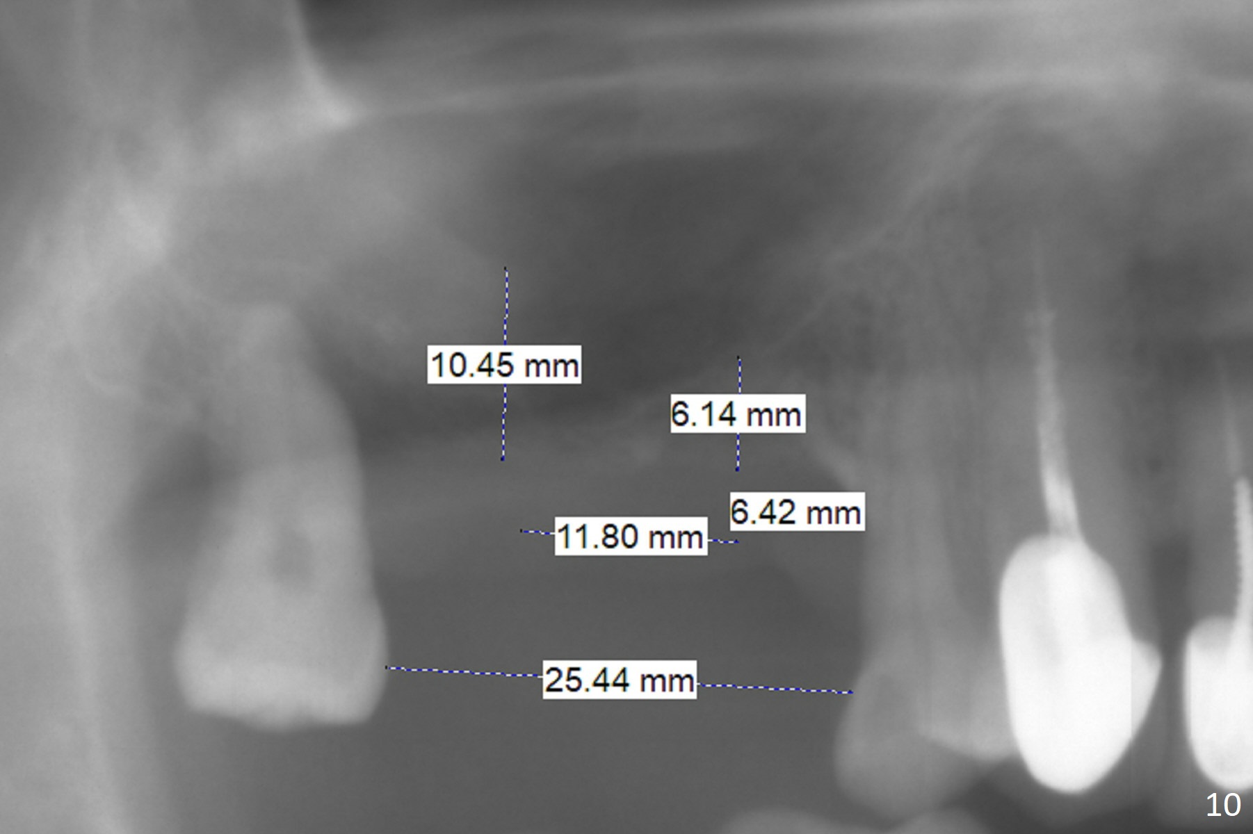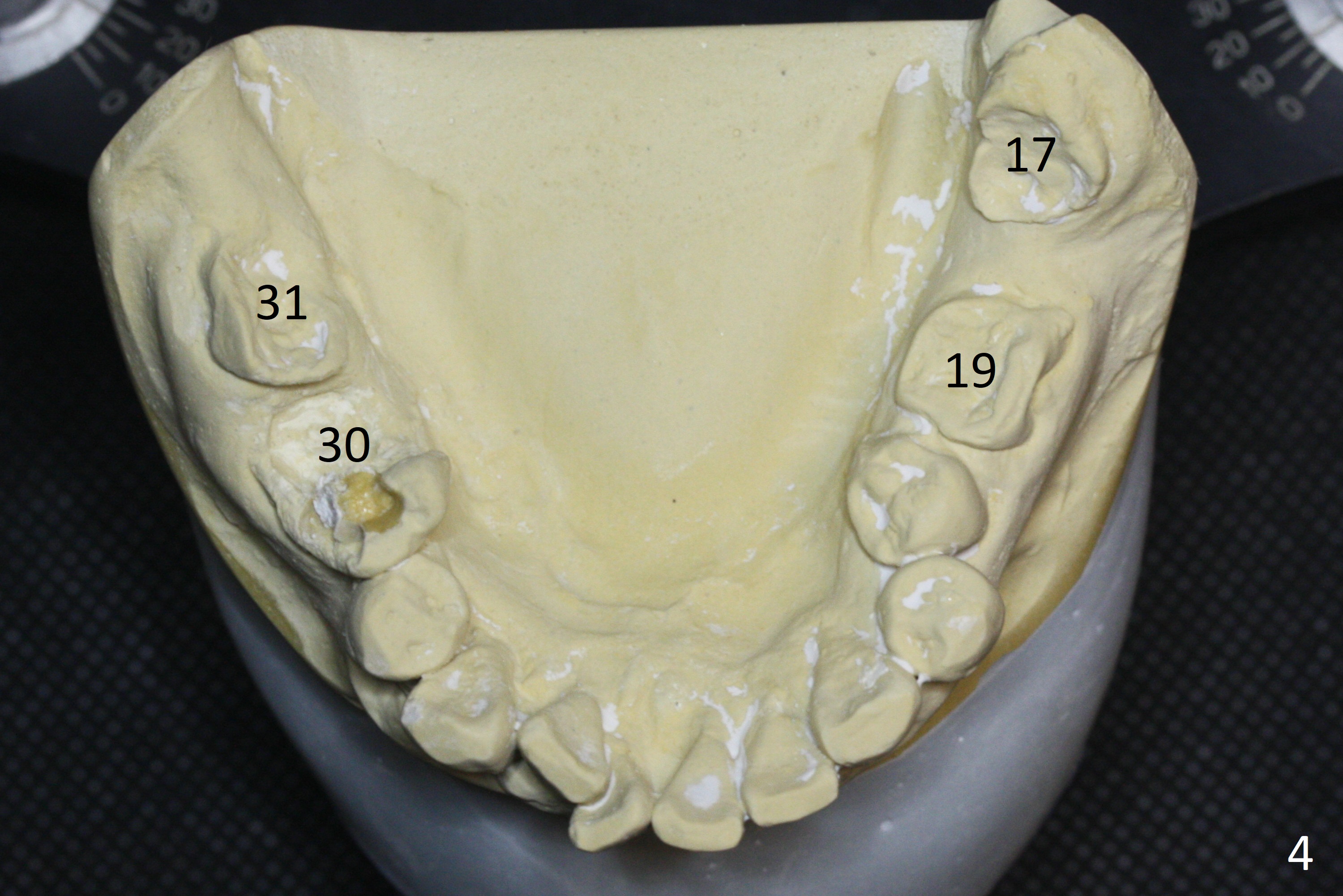 A 54-year-old man is 5 years post liver cancer surgery. After his platelet count returns normal, he wants to take care of his teeth. Most of his molars (#14, 19, 30,31) need extraction and implant placement (Fig.1-4). Although the 2nd premolars on the right are missing (Fig.1,3,4), it seems appropriate to establish 2 molar occlusion on the right (Fig.5,7,8) and 1 on the left (Fig.6,7 (because of #15 supraeruption (Fig.2 arrow))) . Since the residual roots in the lower right quadrant are irritating, implant placement will be done first (Fig.11, Clindamycin), followed by #2,3 (Fig.10) and 14(Fig.12 IBS) and 19 (Fig.12). Use IS drills and 4 and 5 mm stoppers to start osteotomy at #30 and 31, respectively.