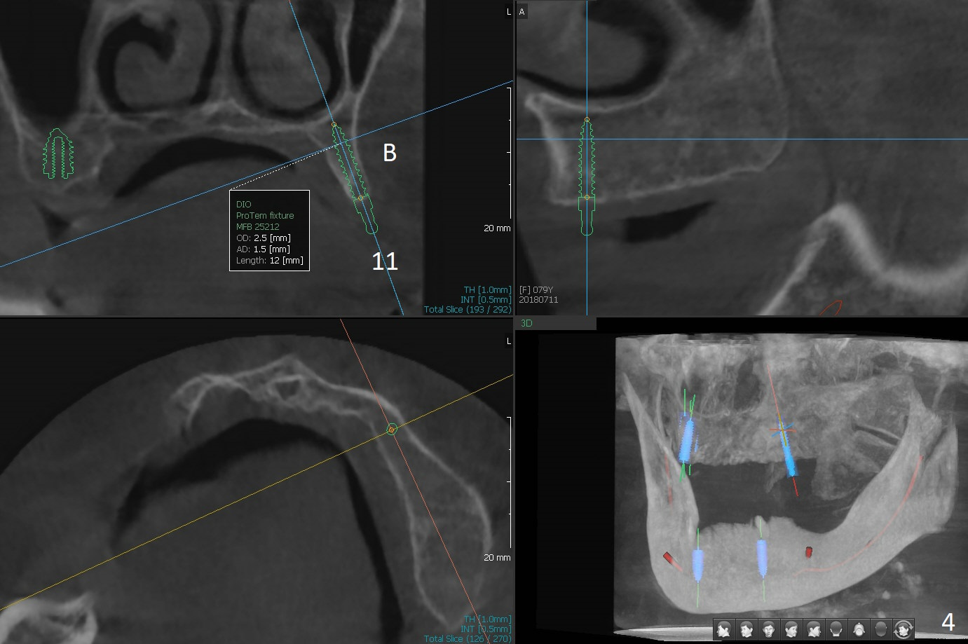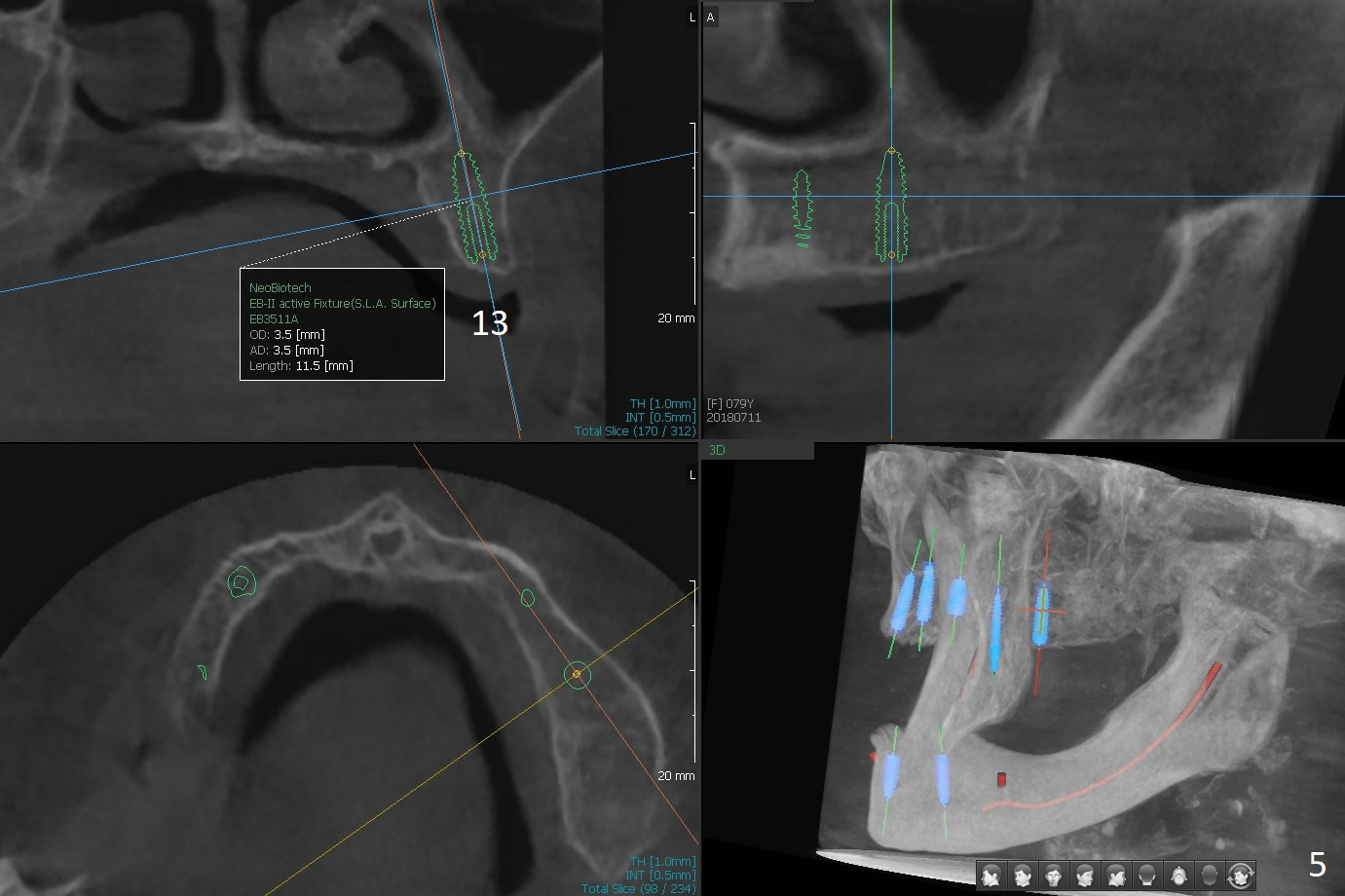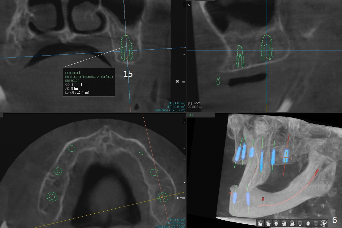 A 80-year-old woman wants to correct cross bite of complete dentures (Class II relationship). It seems that implant supported overdentures can make it possible (retention). Six implants will be placed in the maxillary canine and 2nd premolar and 2nd molar areas with surgical guide (Fig.1-6 (anterior ridge narrow)). Bone density is low. Prepare soft reline.