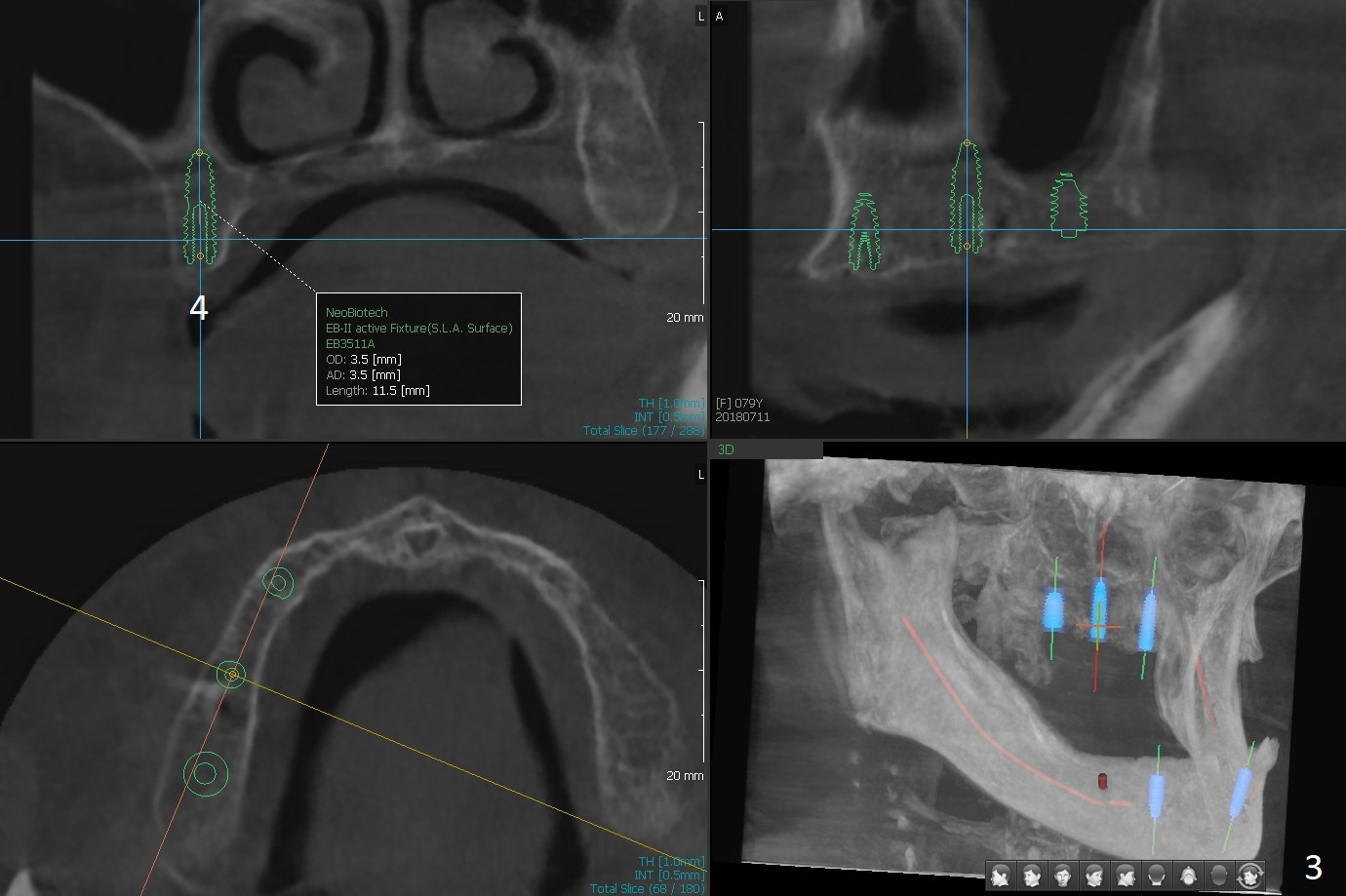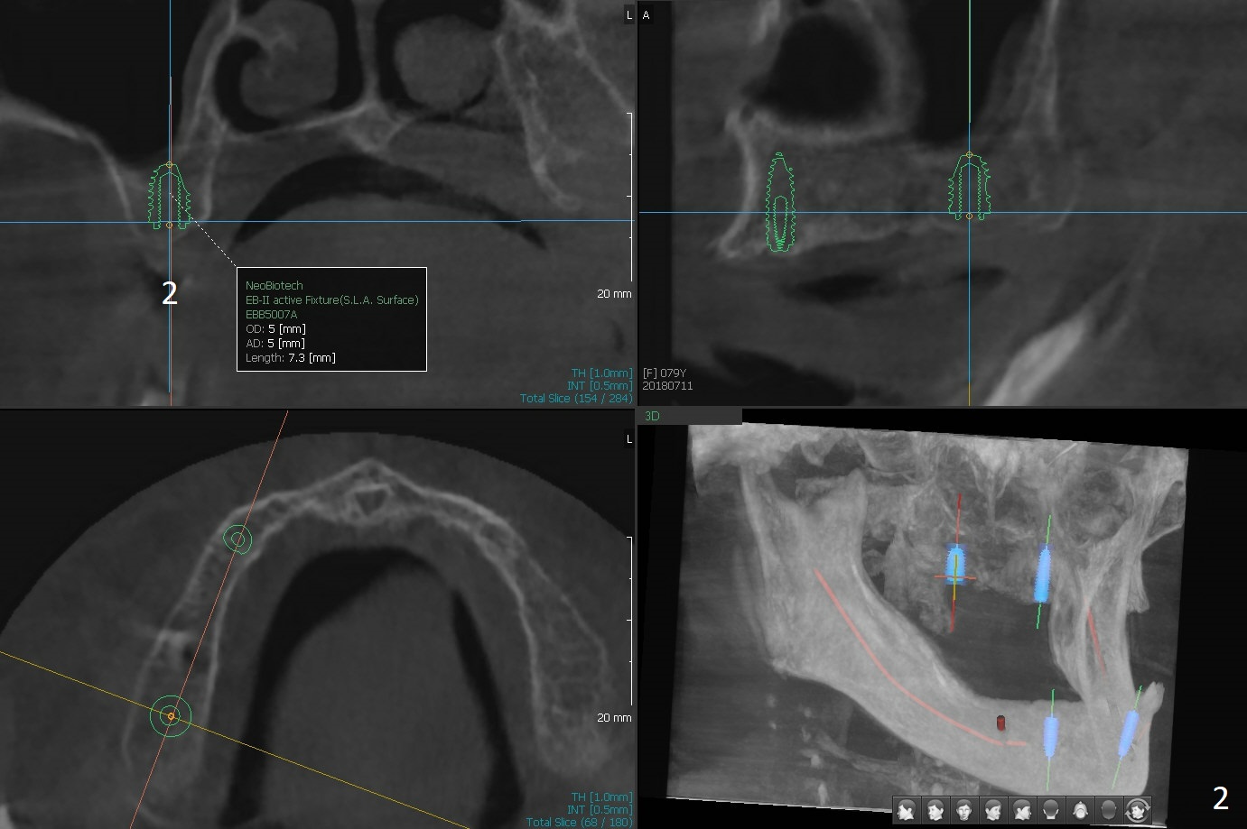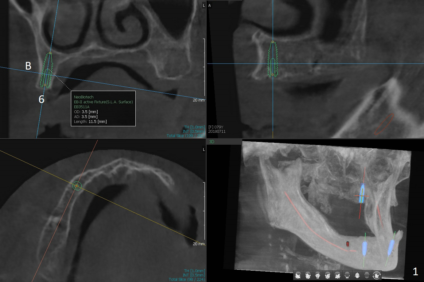 A 80-year-old woman wants to correct cross bite of complete dentures (Class II relationship). It seems that implant supported overdentures can make it possible (retention). Six implants will be placed in the maxillary canine and 2nd premolar and 2nd molar areas with surgical guide (Fig.1-6 (anterior ridge narrow)). Bone density is low. Prepare soft reline.