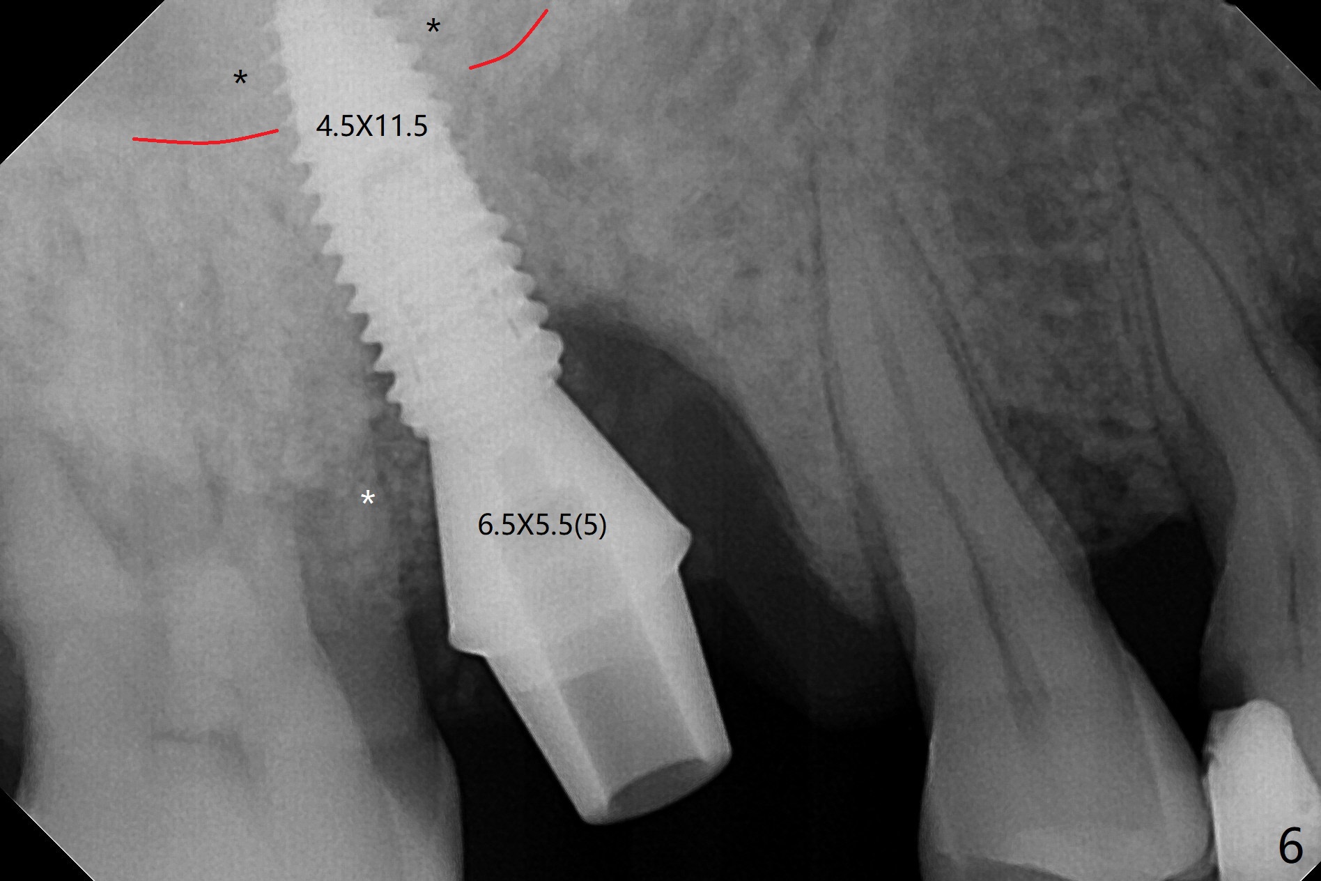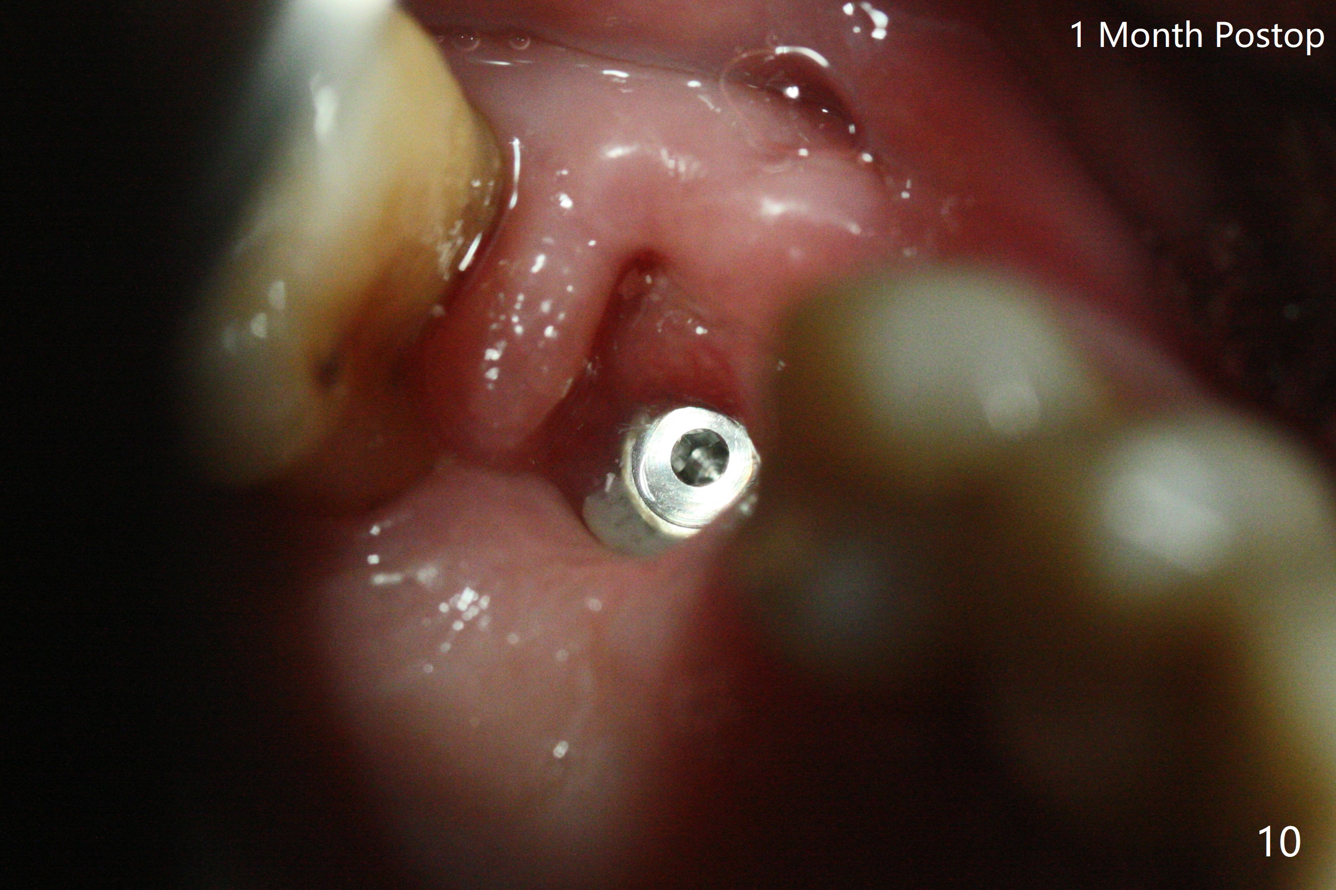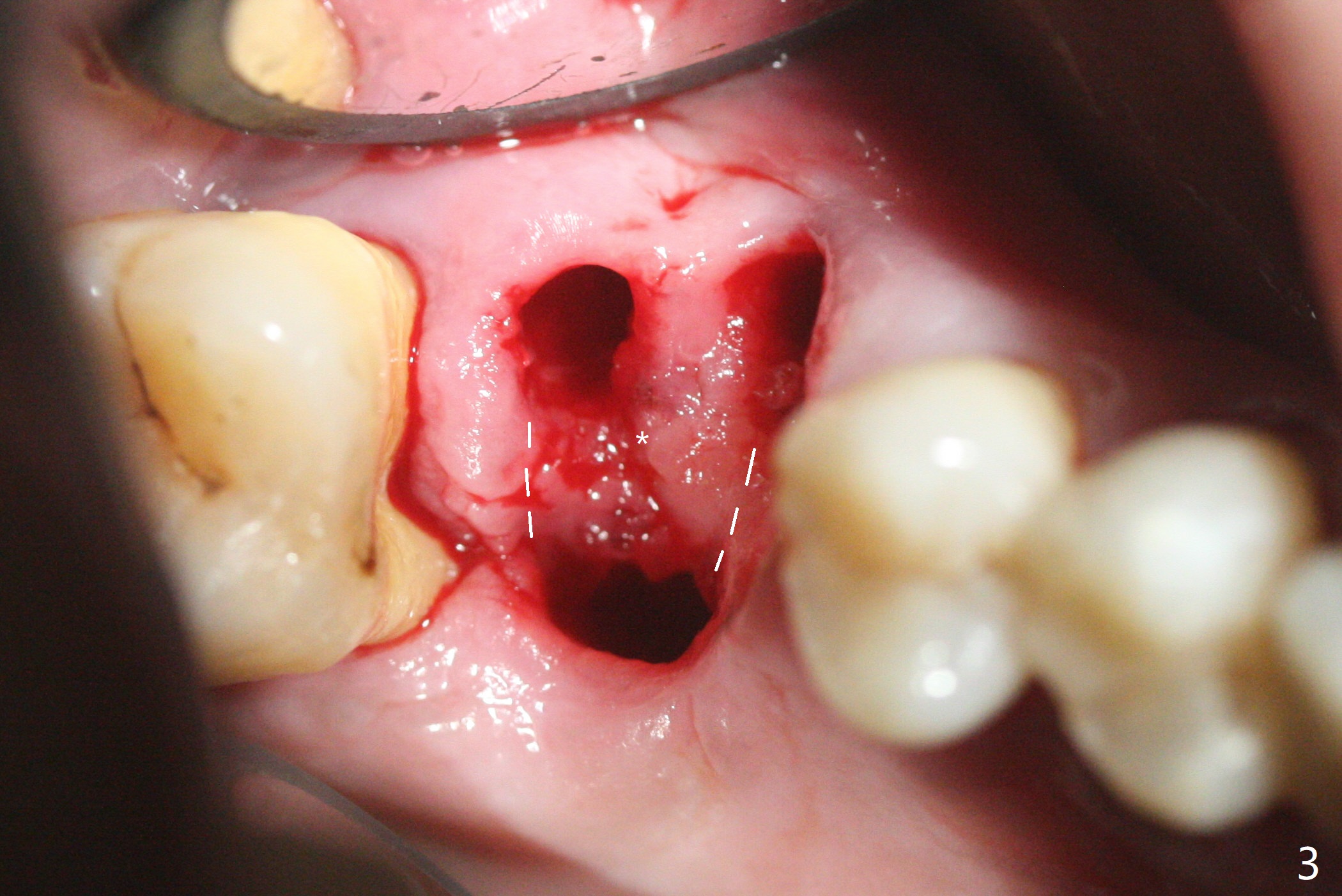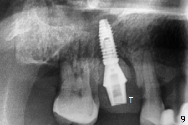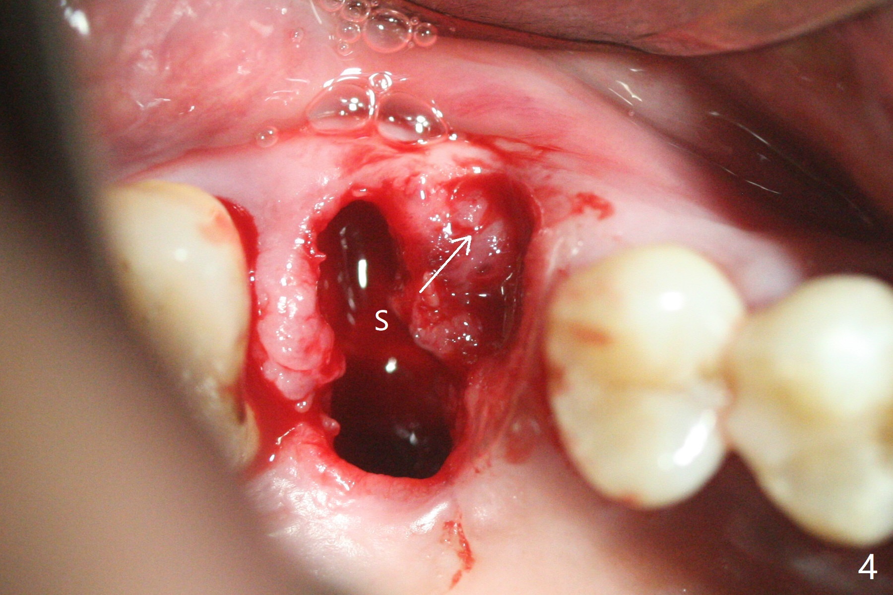 53岁男吸烟,牙周炎,咬合力大,3号牙颊侧(图一),腭侧(图二:P)牙龈退缩,尤其是近中颊侧根(图一:MB),拔牙后,中隔冠方(表面)有好像健康的牙龈(图三:*),近中,远中连接处切开(图三:虚线),将中隔牙龈推向近中颊侧牙槽窝(图四:箭头),修复退缩牙龈,而且暴露下面中隔(S),接着在它上面导板钻洞,避免软组织创伤。利用报废植体试图内提升(图五(红虚线:窦底)),最终正式植体完成提升(图六:黑*),初步在牙槽窝深部放置粘性骨粉(白*)后,放入基台,之后再次在植体,基台周围放置骨粉(图七:*),最后借助临时牙冠(图八,九:T)和外衬里(图八:R)封闭牙槽窝开口,G是近中颊侧迁移的牙龈。植体垂直进入上颌窦可以减少窦膜破裂(图五,六,九),术后没有鼻出血。术后1个月临时牙冠松动,去除牙冠和基台,安置愈合帽(图十)。表面骨粉遗失,但是颊侧移位的中隔牙龈好像帮助软组织预后。