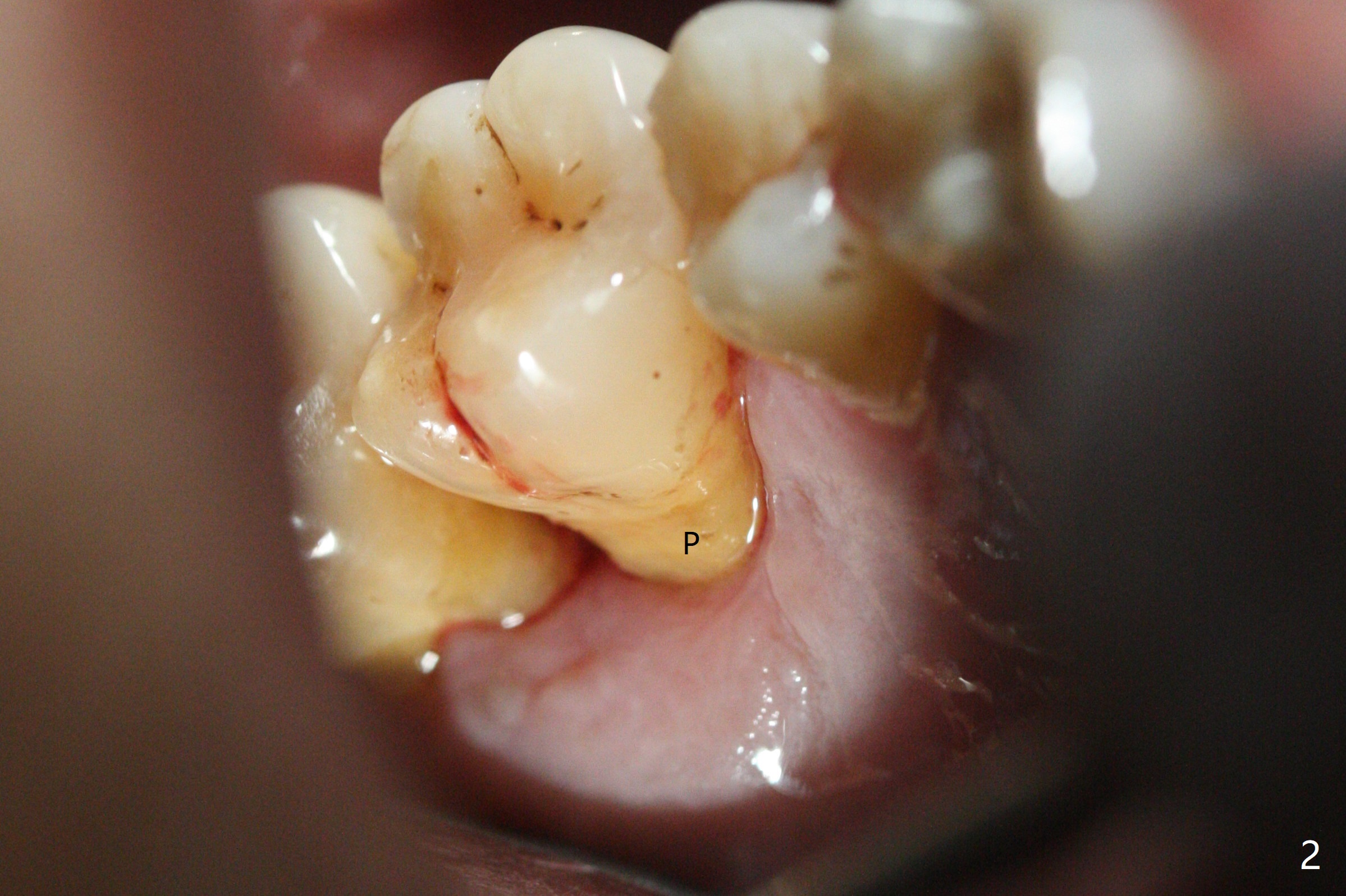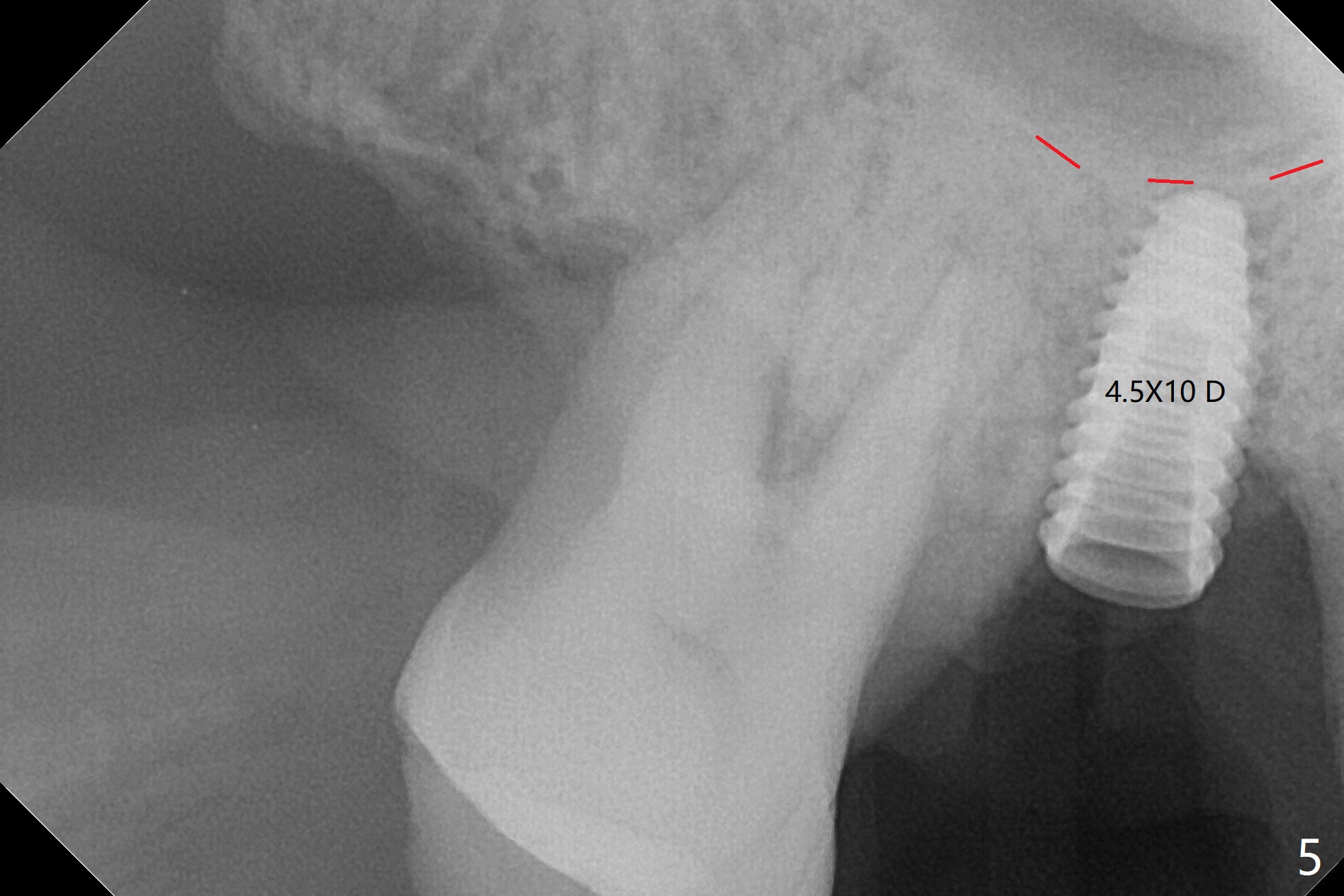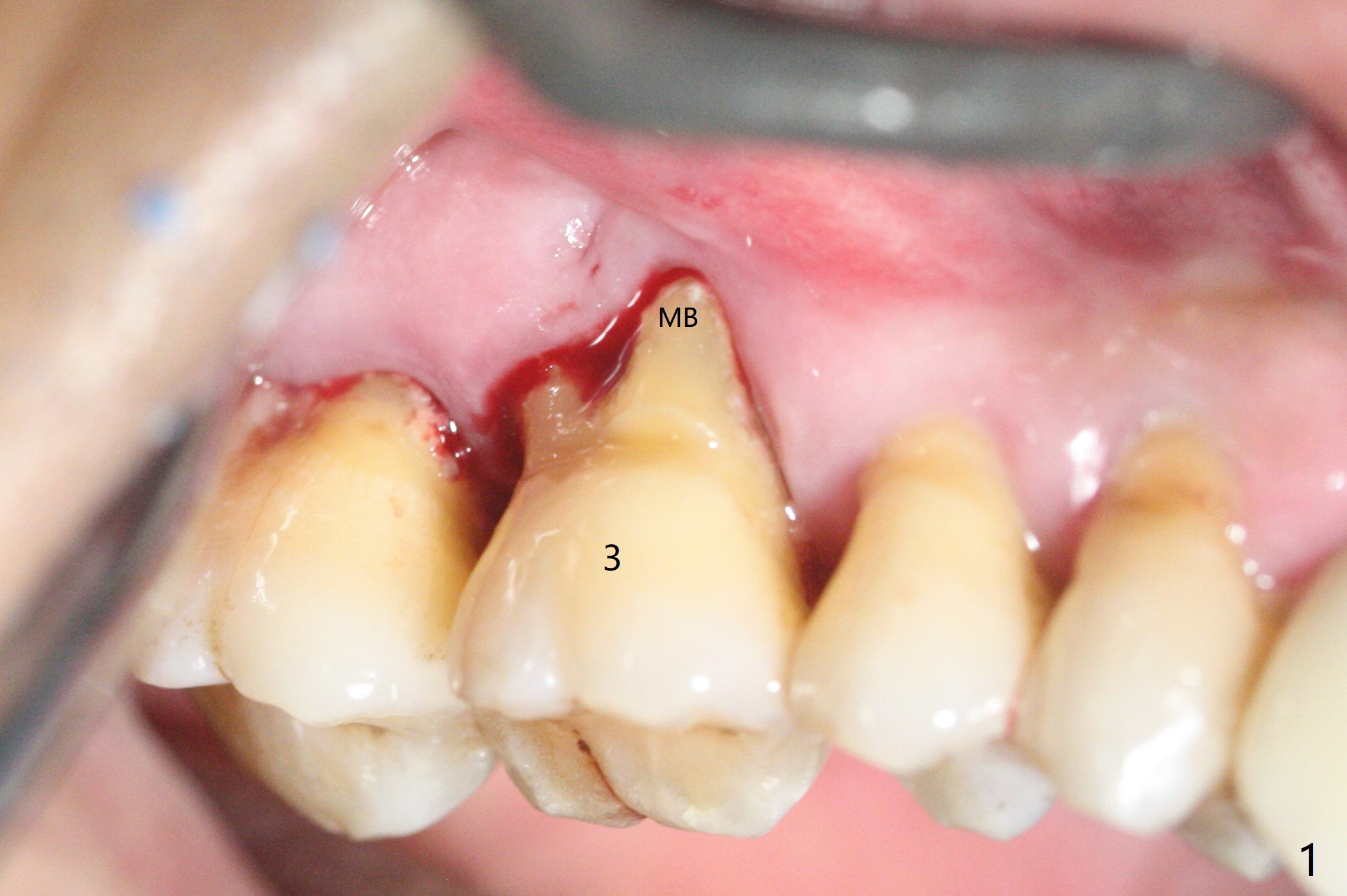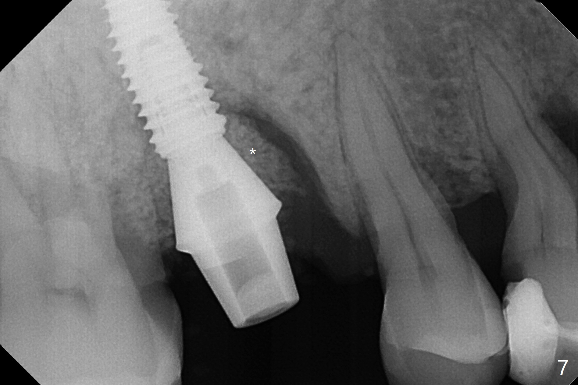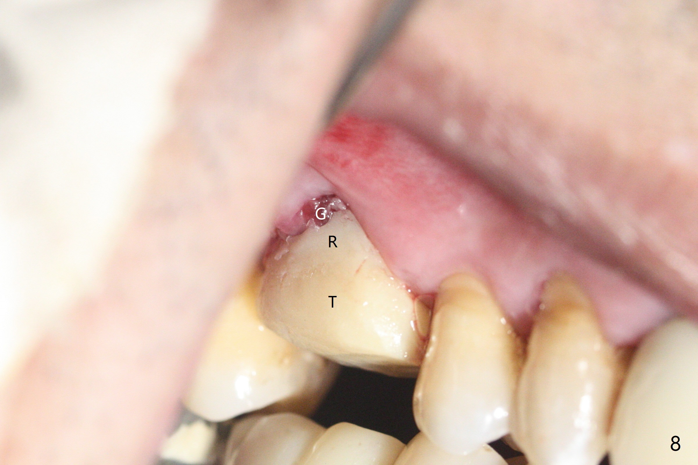 53岁男吸烟,牙周炎,咬合力大,3号牙颊侧(图一),腭侧(图二:P)牙龈退缩,尤其是近中颊侧根(图一:MB),拔牙后,中隔冠方(表面)有好像健康的牙龈(图三:*),近中,远中连接处切开(图三:虚线),将中隔牙龈推向近中颊侧牙槽窝(图四:箭头),修复退缩牙龈,而且暴露下面中隔(S),接着在它上面导板钻洞,避免软组织创伤。利用报废植体试图内提升(图五(红虚线:窦底)),最终正式植体完成提升(图六:黑*),初步在牙槽窝深部放置粘性骨粉(白*)后,放入基台,之后再次在植体,基台周围放置骨粉(图七:*),最后借助临时牙冠(图八,九:T)和外衬里(图八:R)封闭牙槽窝开口,G是近中颊侧迁移的牙龈。植体垂直进入上颌窦可以减少窦膜破裂(图五,六,九),术后没有鼻出血。术后1个月临时牙冠松动,去除牙冠和基台,安置愈合帽(图十)。表面骨粉遗失,但是颊侧移位的中隔牙龈好像帮助软组织预后。