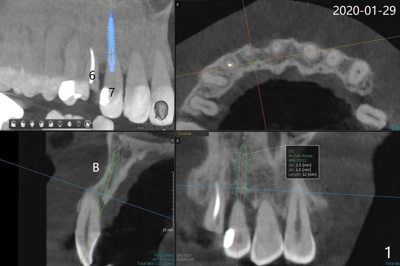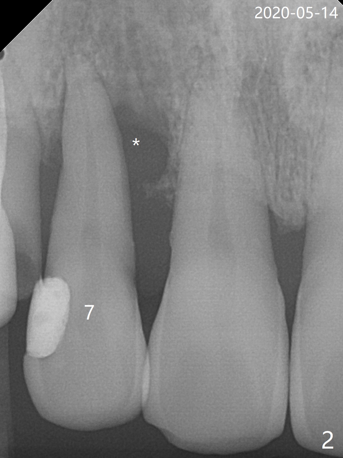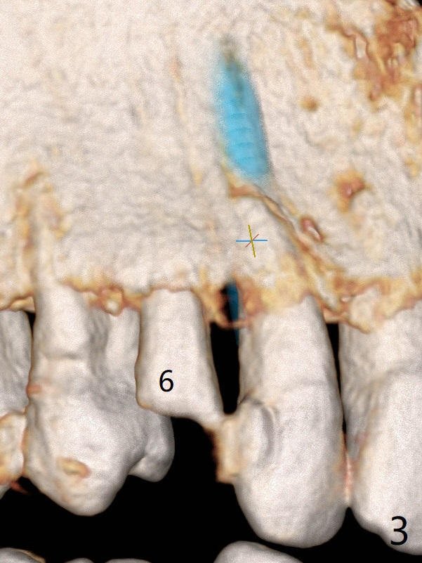 The tooth #7 (52 y/o, M, smoker) has mobility 2 months post #24/26, 30 implant placement without provisional (Fig.1,2) and seems to be necessary to be extracted for implant, while post and crown will be placed at #6 (Fig.3).
