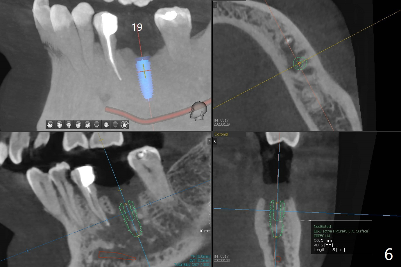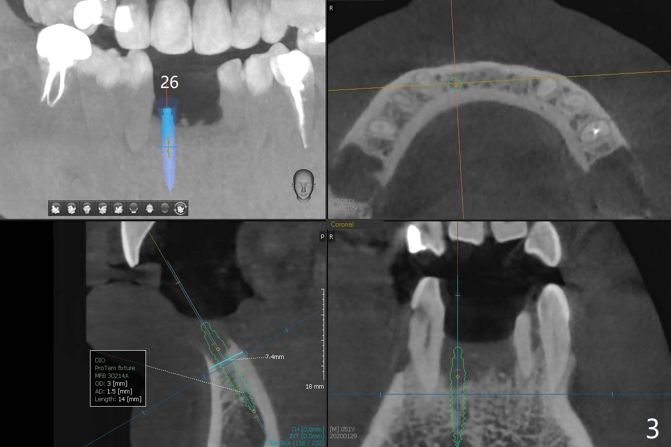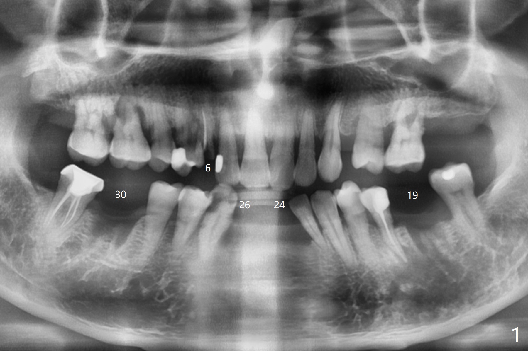 A 51-year-old man with chronic periodontitis requests implants at 19, 24-26 and 30 nearly 2 months post extraction without bone graft (Fig.1). He is willing to quit smoking by using electronic smoke. After SRP, the tooth #6 with supragingival fracture will be saved by post and crown. The mesiodistal space seems to be too narrow for implant (Fig.2). 1-piece implants will be placed at #24 and 26 for FPD (Fig.3,4). Implant placement at #19 and 30 will involve incision, socket redebridement, guide, bone graft (sticky bone), PRF membranes as a barrier and sutures (Fig.5,6).