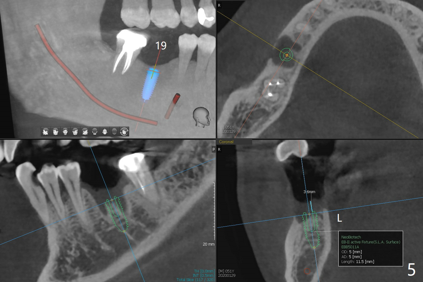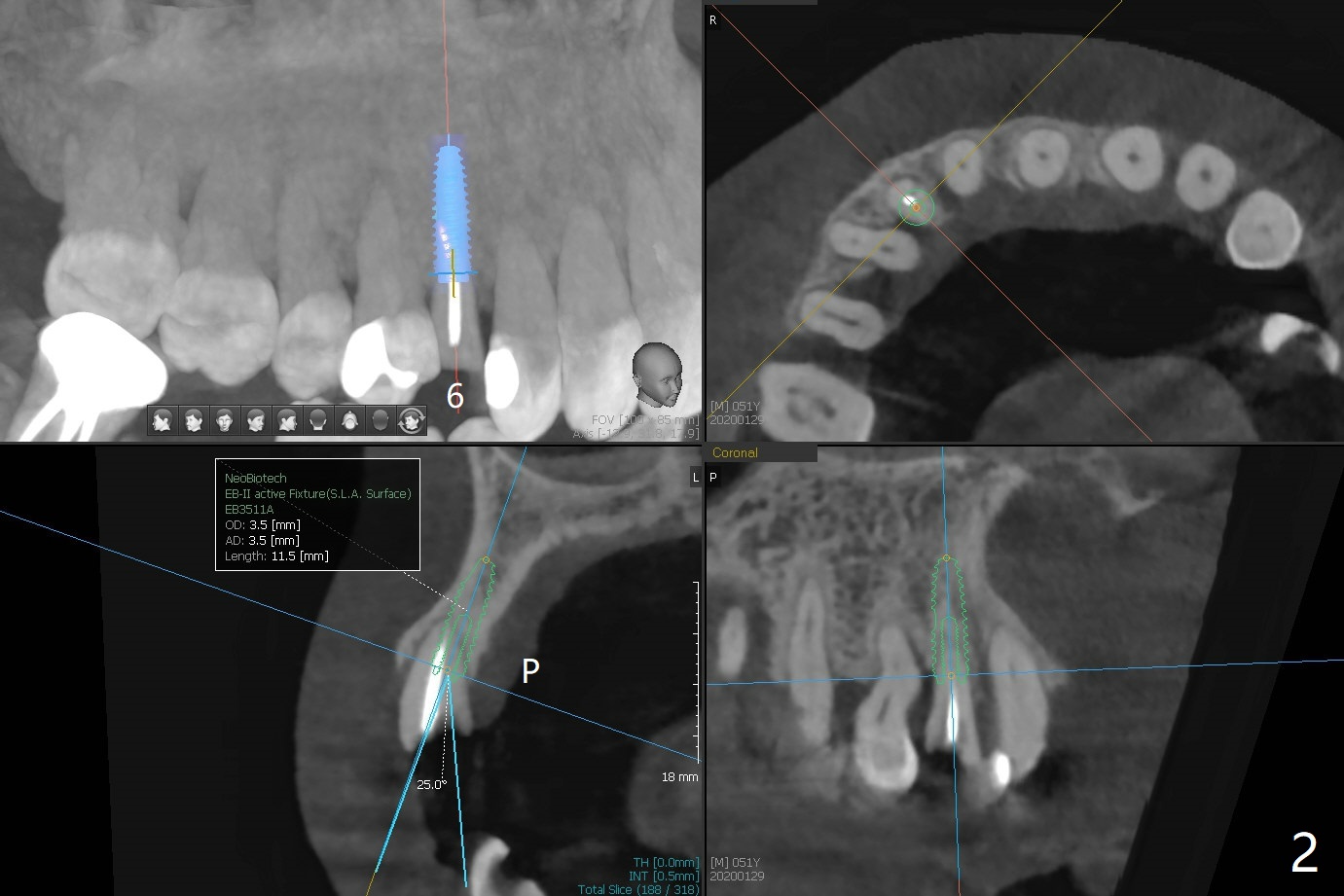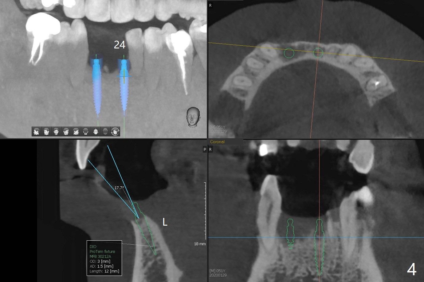 A 51-year-old man with chronic periodontitis requests implants at 19, 24-26 and 30 nearly 2 months post extraction without bone graft (Fig.1). He is willing to quit smoking by using electronic smoke. After SRP, the tooth #6 with supragingival fracture will be saved by post and crown. The mesiodistal space seems to be too narrow for implant (Fig.2). 1-piece implants will be placed at #24 and 26 for FPD (Fig.3,4). Implant placement at #19 and 30 will involve incision, socket redebridement, guide, bone graft (sticky bone), PRF membranes as a barrier and sutures (Fig.5,6).