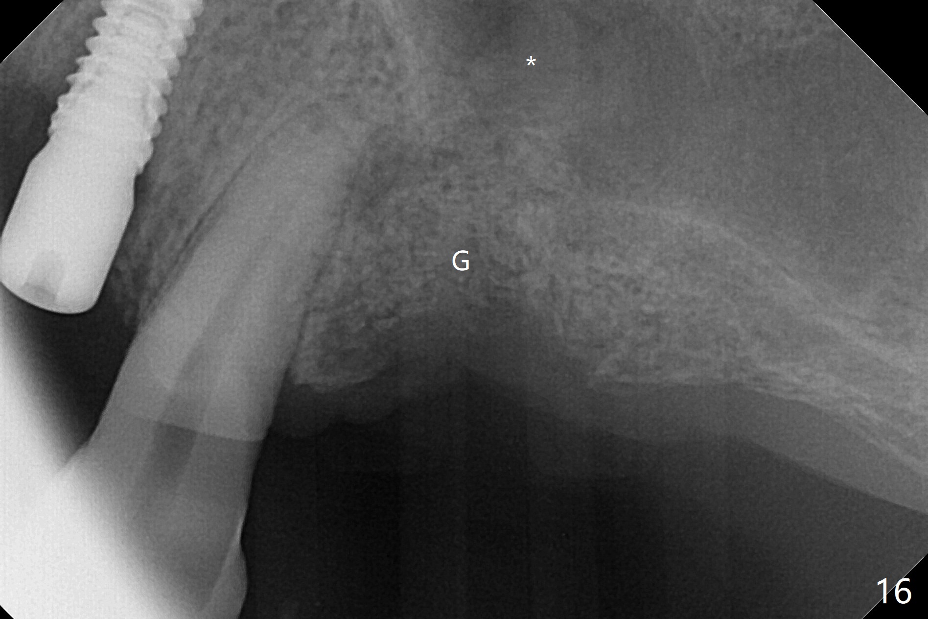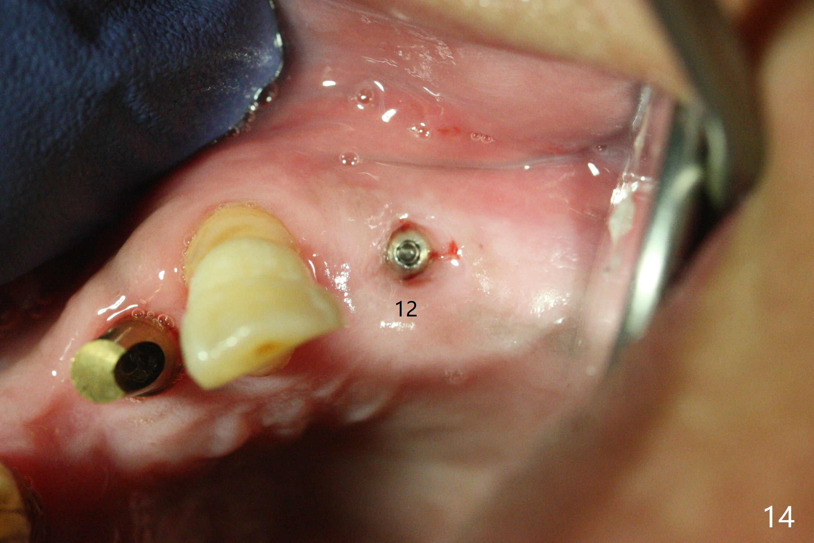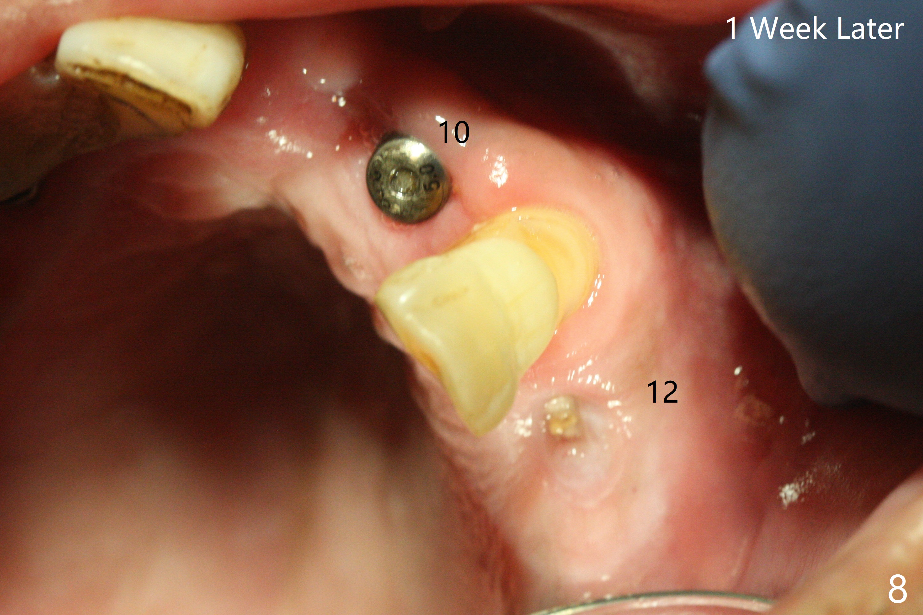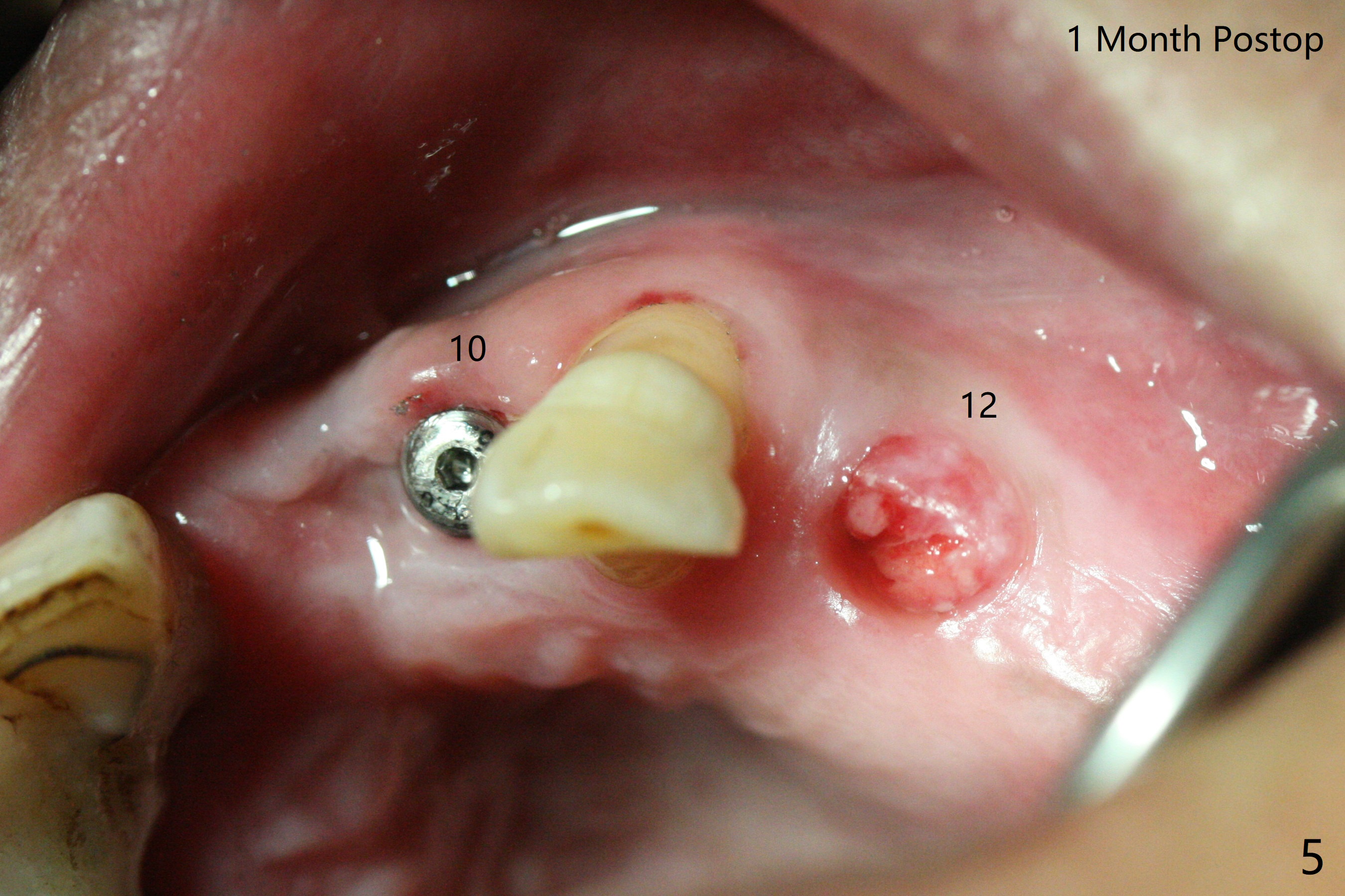 After a 4x10 mm implant is placed with fixture mounting (Fig.2 M) following sinus lift (*) at #12, osteotomy is initiated at #10 (Fig.1 (T: tube of surgical guide)). It appears that the drill (D) has good trajectory (between the Incisive Canal (red dashed line) and the canine root). The final position of the implant at #10 is acceptable (Fig.3). The implant at #12 is placed deeper (Fig.4 (arrow), as compared to Fig.2) because of clinically buccal superficial placement. The most critical challenge is anterior deep bite associated with posterior collapse. Periodontal dressing is applied. When the latter dislodges, there is minimal clearance for a provisional. Periodontal dressing is re-applied. The patient (smoker, partial edentulism with occlusal interference) returns for provisional nearly 1 month postop with chief complaint "something is lost in the back". In fact the healing abutment at #12 is lost with buccal granulation tissue (Fig.5). When a new abutment is seated, there is discomfort. When a healing screw is placed, it cannot be seated completely with two separate trials (Fig.6,7). Should we leave it as it is or open up for complete seating? It appears that the implant is loose. After preparation for clearance at #10, the abutment is retightened. It appears to turn with the underlying implant with discomfort. A 4x5 mm healing abutment is placed to reduce micro-movement. One week later, the infection at #12 dissolves with oral Amoxicillin (Fig.8). Due to limited occlusal clearance and implant tenderness when the abutment abutment is retightened, the cemented abutment is changed to a healing abutment. The implant at #10 seems to be osteointegrated, while the healing screw at #12 remains incomplete seating 3 months postop (Fig.9). The loose healing screw cannot be retightened securely, as there is bone loss around the implant 3 months postop (Fig.10 *). When a 4.5 mm x 15 degree 4 mm cuff angled abutment is placed, the mesiodistal trajectory improves (Fig.11), but there is no occlusal clearance (Fig.12). The latter would form when posterior support is established (Fig.13, either removable appliance (which the patient hates) or fixed one (finance)). Fig.14 shows the unhealed site of #12. Incision confirms the bone loss around the implant, which is removed. Although the sinus floor is absent, there is no membrane perforation. After debridement, allograft mixed with small amount of Osteogen is placed (Fig.15,16 G) and covered with Osteogen plug and 6-month membrane.