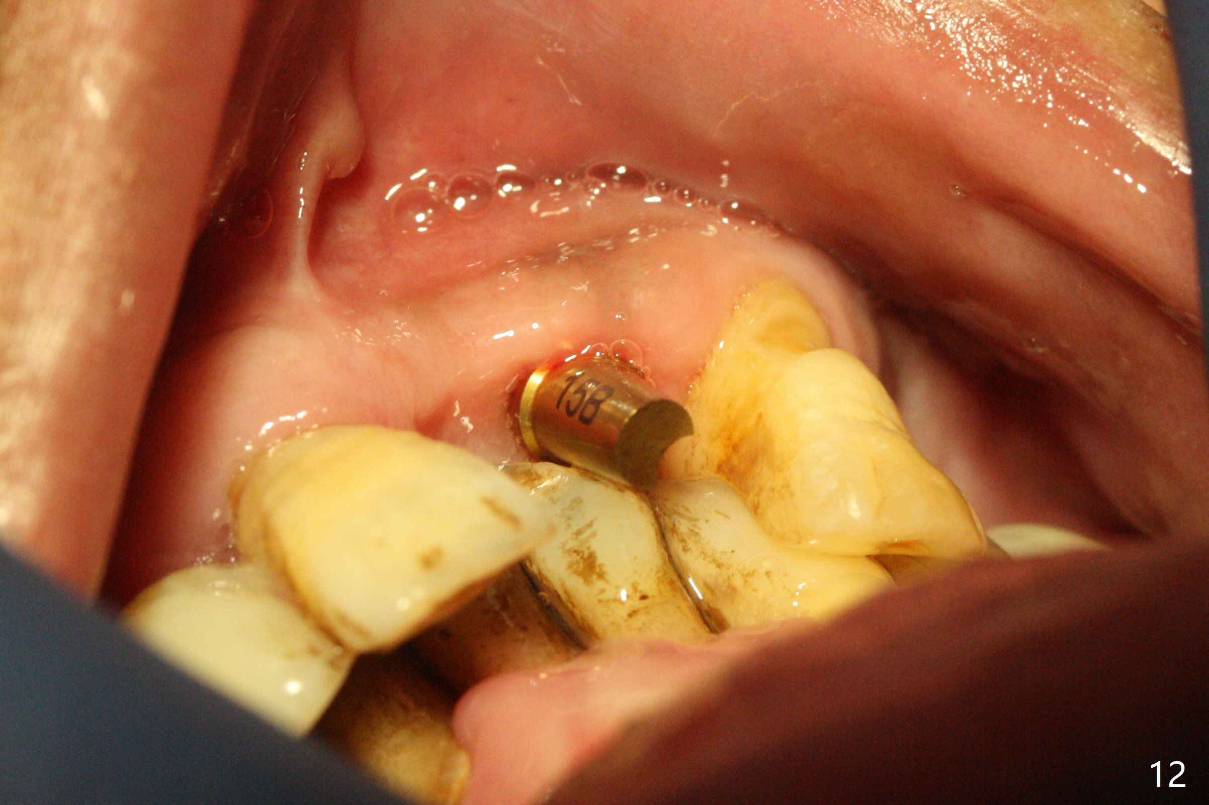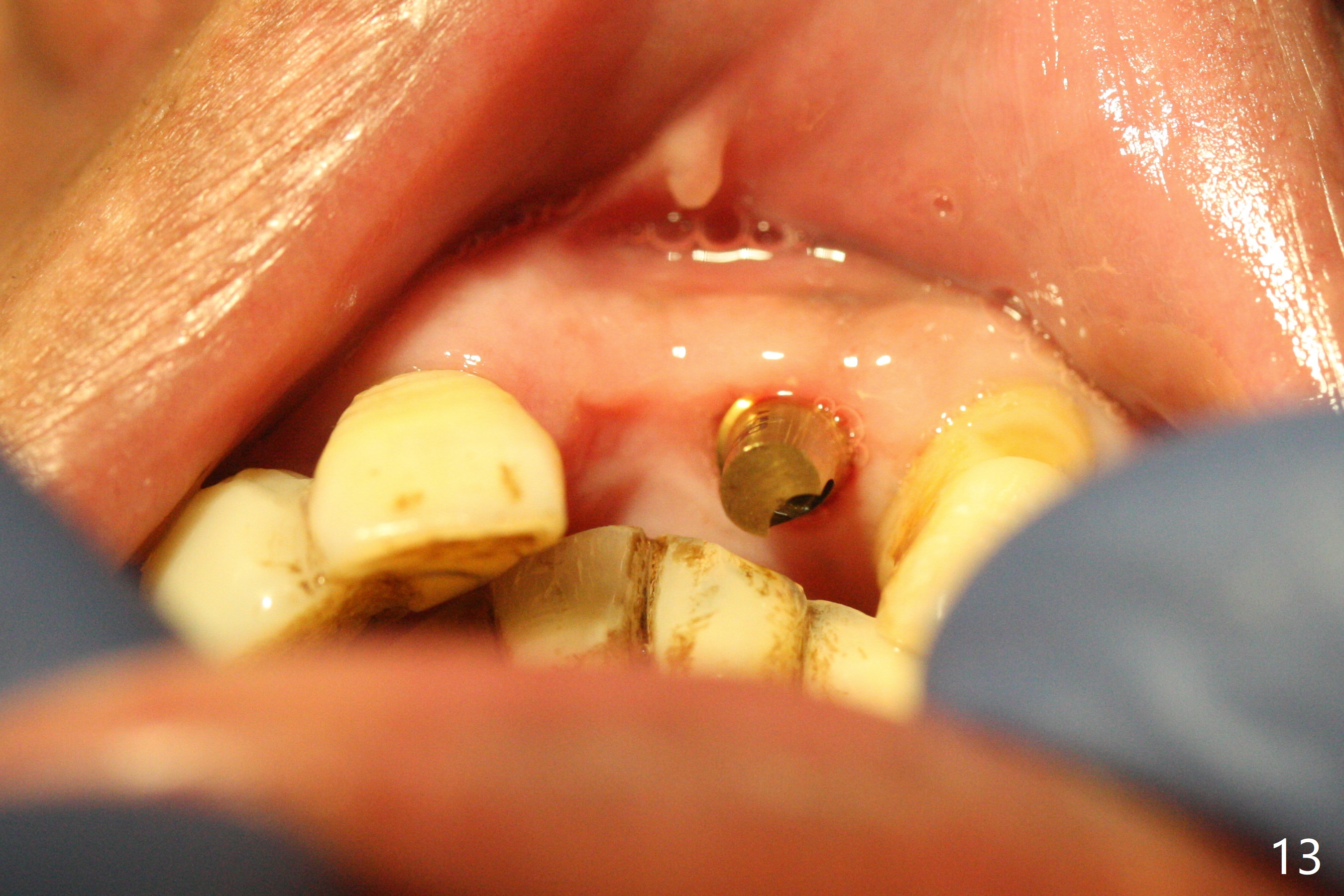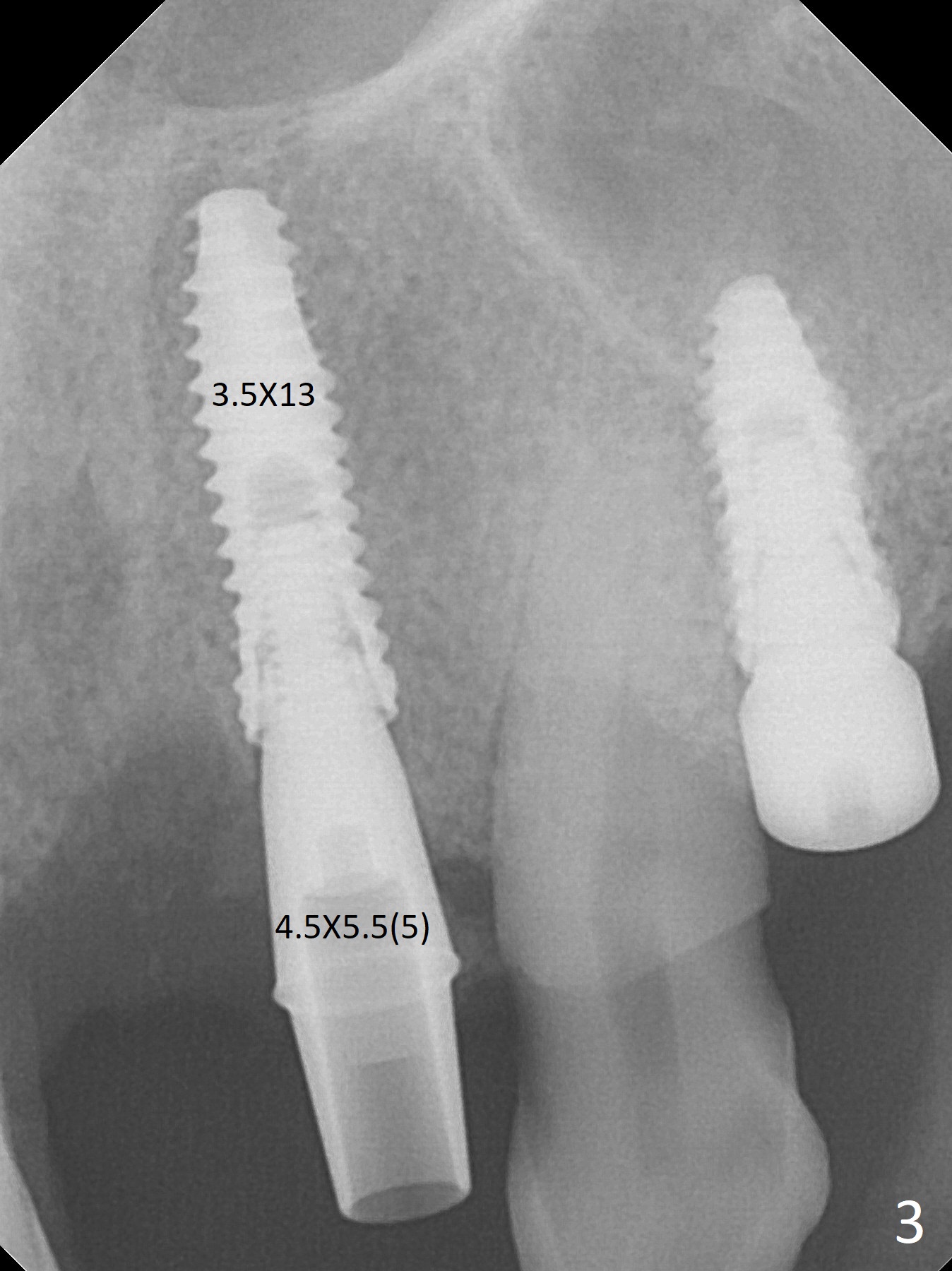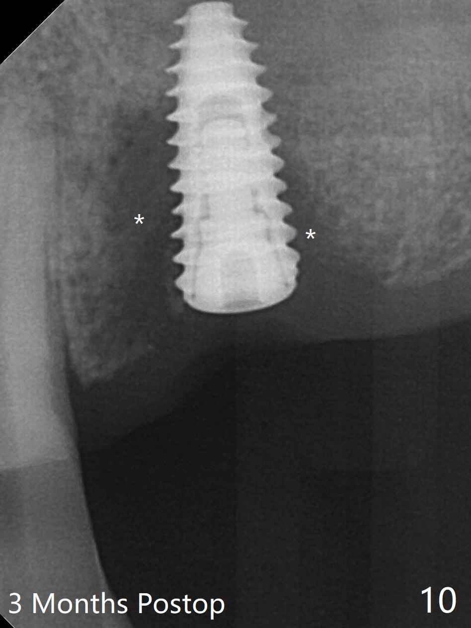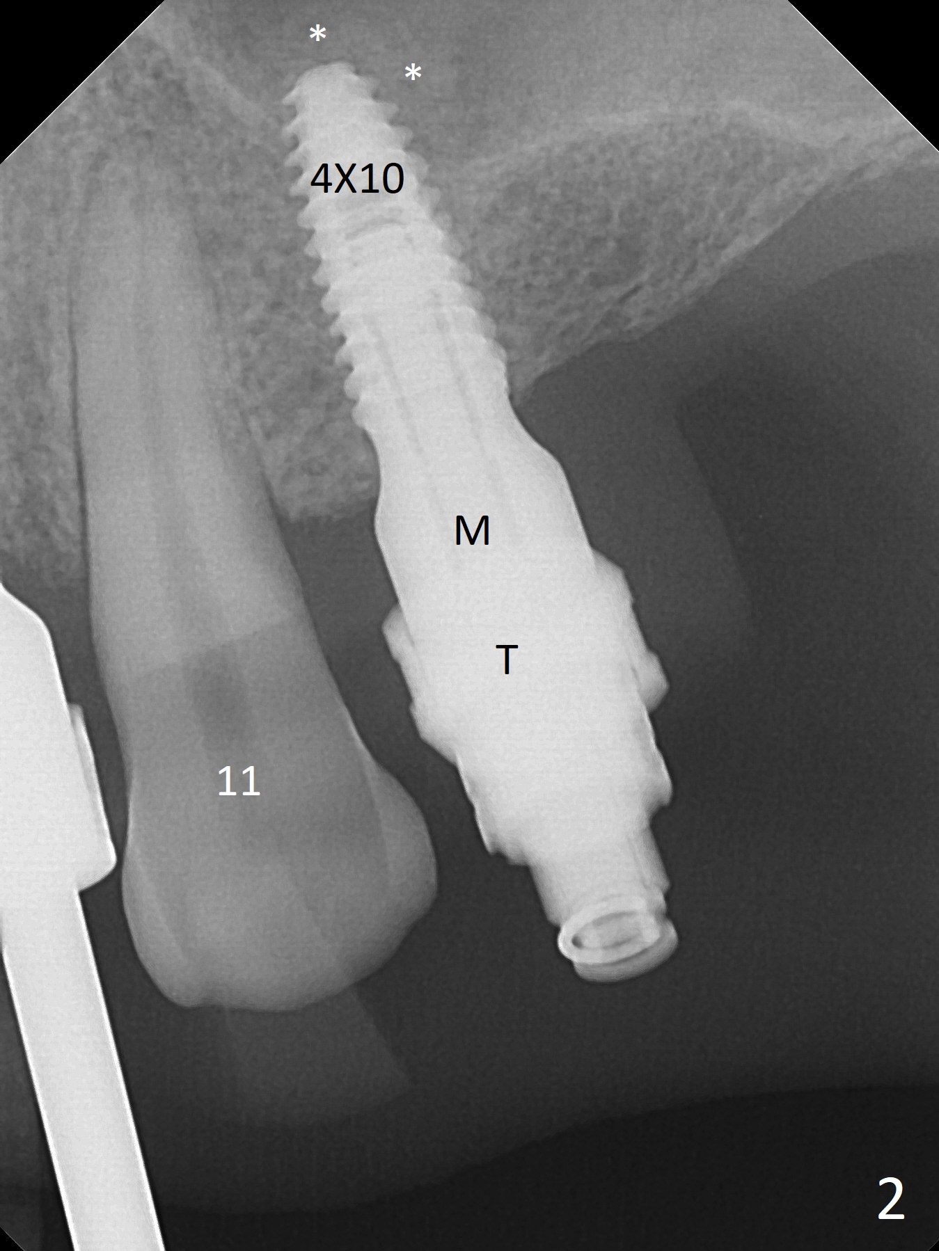 After a 4x10 mm implant is placed with fixture mounting (Fig.2 M) following sinus lift (*) at #12, osteotomy is initiated at #10 (Fig.1 (T: tube of surgical guide)). It appears that the drill (D) has good trajectory (between the Incisive Canal (red dashed line) and the canine root). The final position of the implant at #10 is acceptable (Fig.3). The implant at #12 is placed deeper (Fig.4 (arrow), as compared to Fig.2) because of clinically buccal superficial placement. The most critical challenge is anterior deep bite associated with posterior collapse. Periodontal dressing is applied. When the latter dislodges, there is minimal clearance for a provisional. Periodontal dressing is re-applied. The patient (smoker, partial edentulism with occlusal interference) returns for provisional nearly 1 month postop with chief complaint "something is lost in the back". In fact the healing abutment at #12 is lost with buccal granulation tissue (Fig.5). When a new abutment is seated, there is discomfort. When a healing screw is placed, it cannot be seated completely with two separate trials (Fig.6,7). Should we leave it as it is or open up for complete seating? It appears that the implant is loose. After preparation for clearance at #10, the abutment is retightened. It appears to turn with the underlying implant with discomfort. A 4x5 mm healing abutment is placed to reduce micro-movement. One week later, the infection at #12 dissolves with oral Amoxicillin (Fig.8). Due to limited occlusal clearance and implant tenderness when the abutment abutment is retightened, the cemented abutment is changed to a healing abutment. The implant at #10 seems to be osteointegrated, while the healing screw at #12 remains incomplete seating 3 months postop (Fig.9). The loose healing screw cannot be retightened securely, as there is bone loss around the implant 3 months postop (Fig.10 *). When a 4.5 mm x 15 degree 4 mm cuff angled abutment is placed, the mesiodistal trajectory improves (Fig.11), but there is no occlusal clearance (Fig.12). The latter would form when posterior support is established (Fig.13, either removable appliance (which the patient hates) or fixed one (finance)). Fig.14 shows the unhealed site of #12. Incision confirms the bone loss around the implant, which is removed. Although the sinus floor is absent, there is no membrane perforation. After debridement, allograft mixed with small amount of Osteogen is placed (Fig.15,16 G) and covered with Osteogen plug and 6-month membrane.