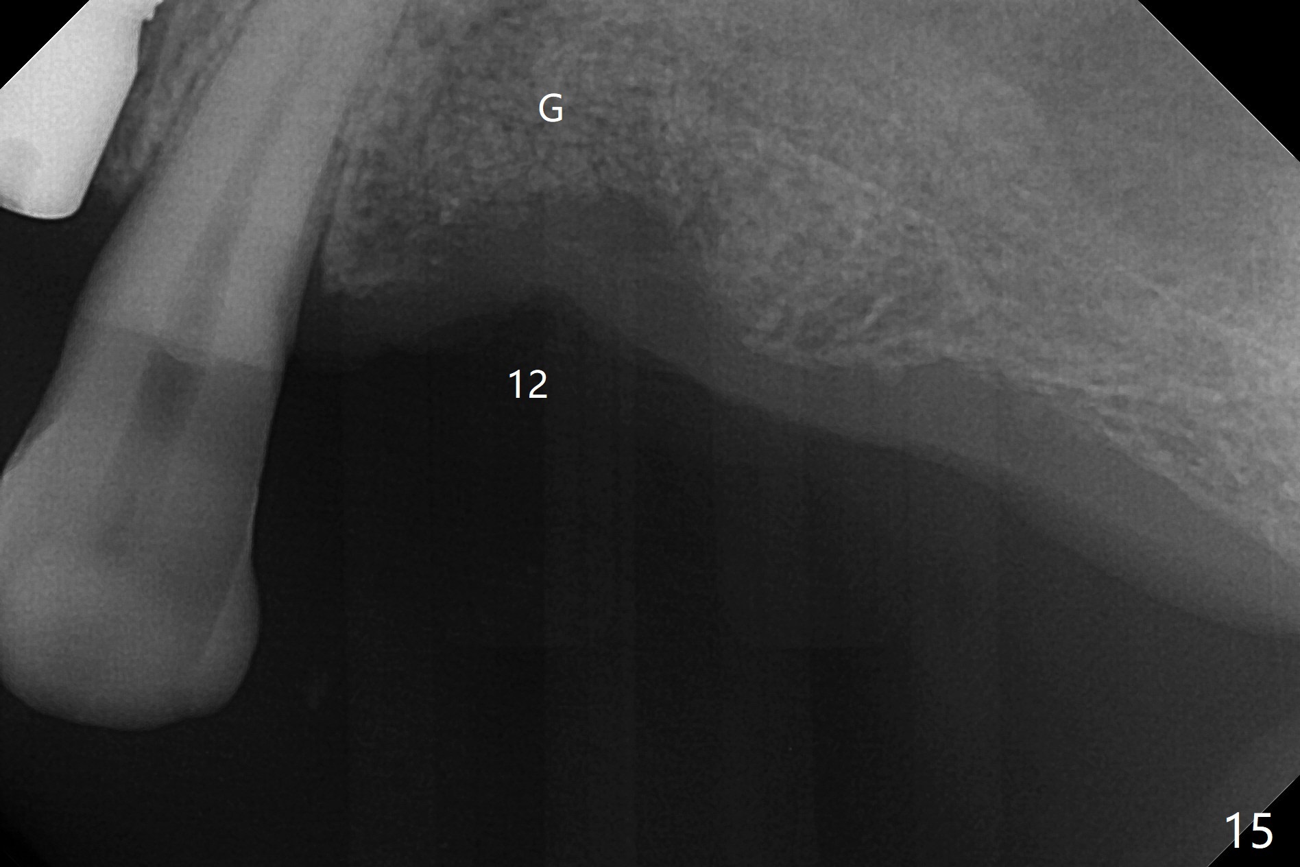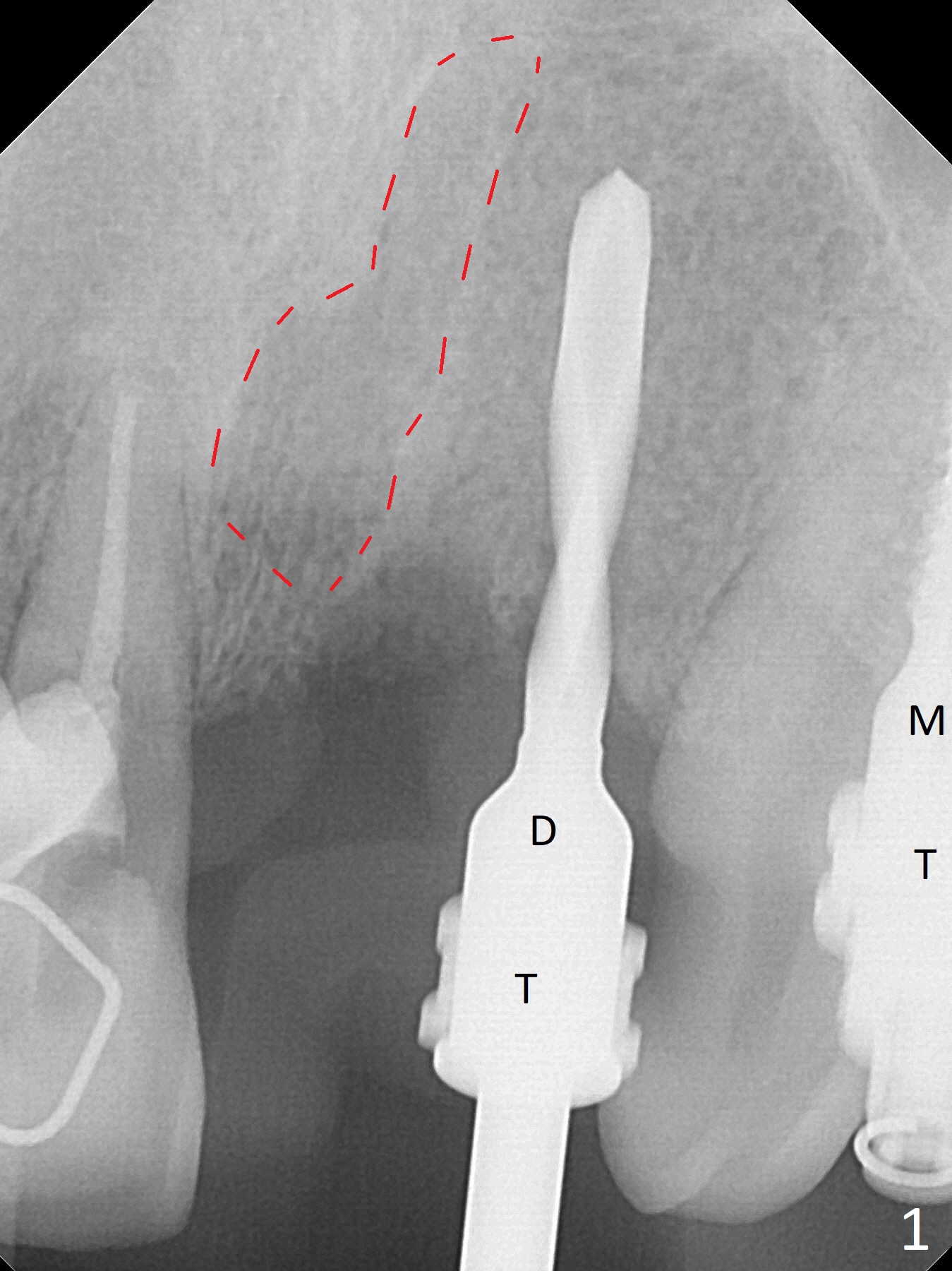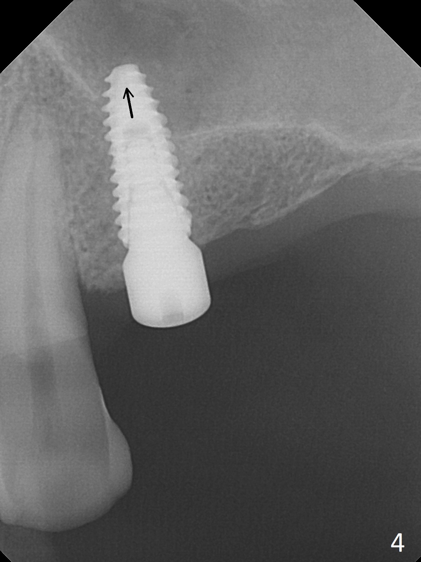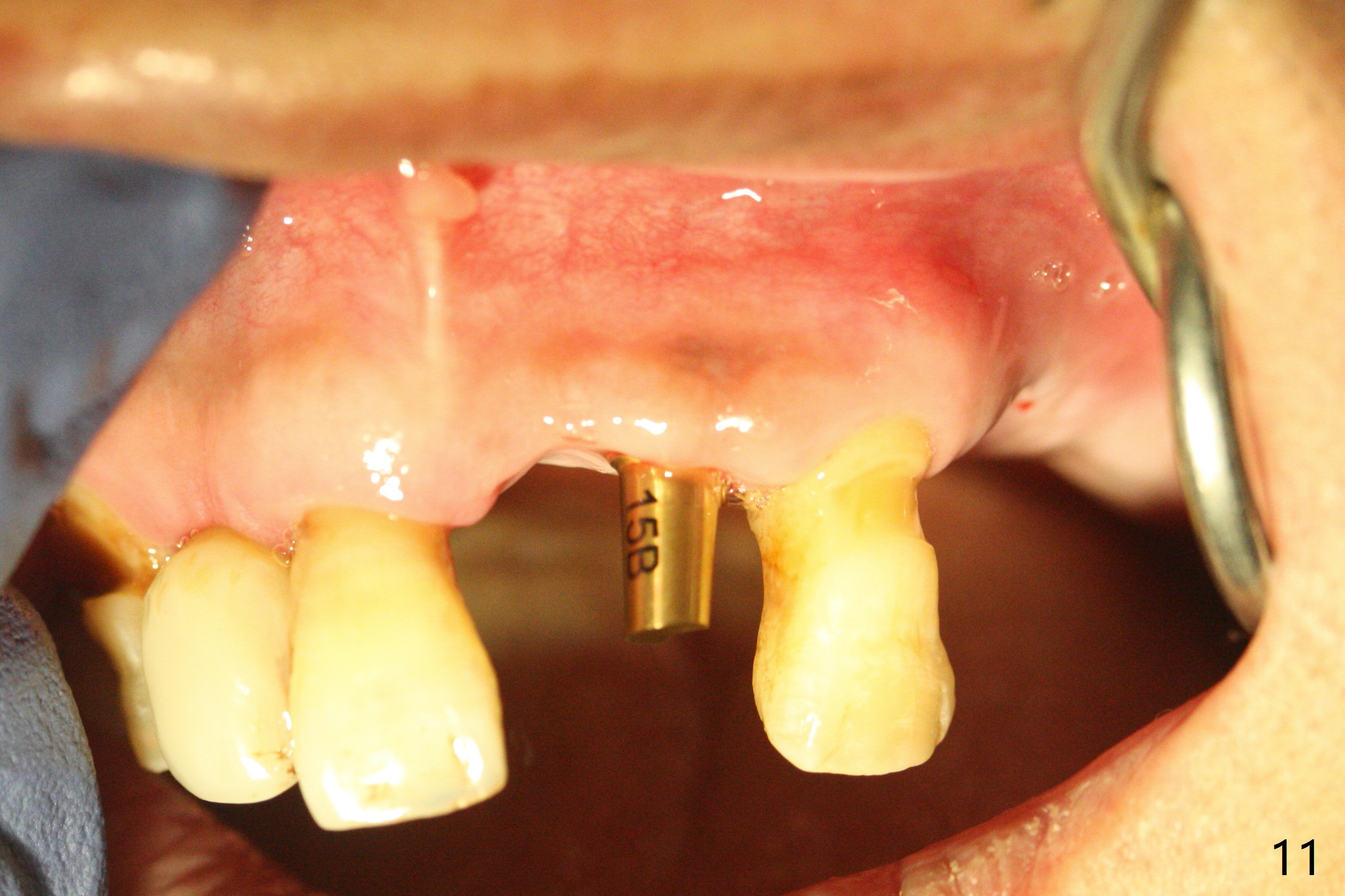 After a 4x10 mm implant is placed with fixture mounting (Fig.2 M) following sinus lift (*) at #12, osteotomy is initiated at #10 (Fig.1 (T: tube of surgical guide)). It appears that the drill (D) has good trajectory (between the Incisive Canal (red dashed line) and the canine root). The final position of the implant at #10 is acceptable (Fig.3). The implant at #12 is placed deeper (Fig.4 (arrow), as compared to Fig.2) because of clinically buccal superficial placement. The most critical challenge is anterior deep bite associated with posterior collapse. Periodontal dressing is applied. When the latter dislodges, there is minimal clearance for a provisional. Periodontal dressing is re-applied. The patient (smoker, partial edentulism with occlusal interference) returns for provisional nearly 1 month postop with chief complaint "something is lost in the back". In fact the healing abutment at #12 is lost with buccal granulation tissue (Fig.5). When a new abutment is seated, there is discomfort. When a healing screw is placed, it cannot be seated completely with two separate trials (Fig.6,7). Should we leave it as it is or open up for complete seating? It appears that the implant is loose. After preparation for clearance at #10, the abutment is retightened. It appears to turn with the underlying implant with discomfort. A 4x5 mm healing abutment is placed to reduce micro-movement. One week later, the infection at #12 dissolves with oral Amoxicillin (Fig.8). Due to limited occlusal clearance and implant tenderness when the abutment abutment is retightened, the cemented abutment is changed to a healing abutment. The implant at #10 seems to be osteointegrated, while the healing screw at #12 remains incomplete seating 3 months postop (Fig.9). The loose healing screw cannot be retightened securely, as there is bone loss around the implant 3 months postop (Fig.10 *). When a 4.5 mm x 15 degree 4 mm cuff angled abutment is placed, the mesiodistal trajectory improves (Fig.11), but there is no occlusal clearance (Fig.12). The latter would form when posterior support is established (Fig.13, either removable appliance (which the patient hates) or fixed one (finance)). Fig.14 shows the unhealed site of #12. Incision confirms the bone loss around the implant, which is removed. Although the sinus floor is absent, there is no membrane perforation. After debridement, allograft mixed with small amount of Osteogen is placed (Fig.15,16 G) and covered with Osteogen plug and 6-month membrane.