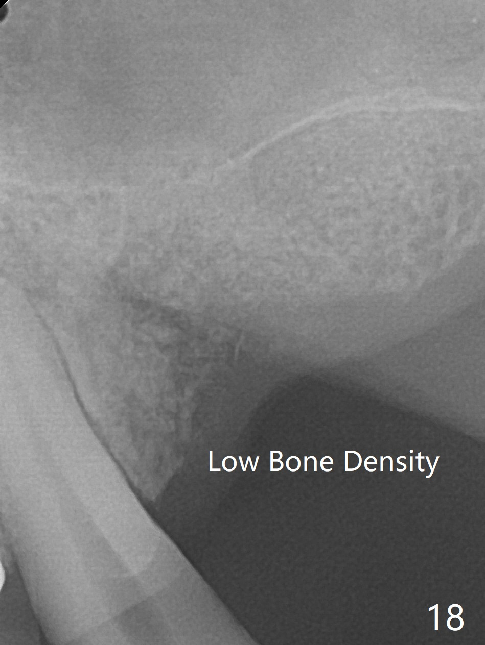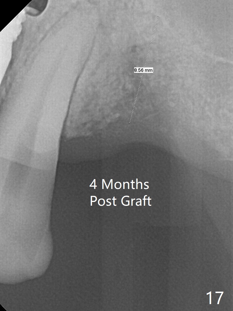 The bone density of the site is low 4 months post bone graft (Fig.17,18). Use the existing guide, but incision will be made. The osteotomy will be underprep. Take 5x5 cm CT for bone width and height after use of 2.2x7.3 drill with 1 or 2 O-rings. Prepare sinus lift, including water pump and bone graft, especially distal. Place healing screw and suture. Prepare PRFx2.
