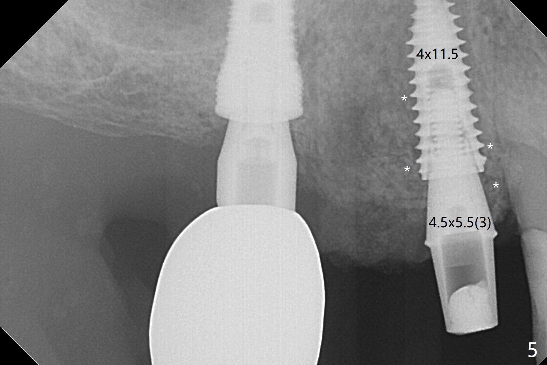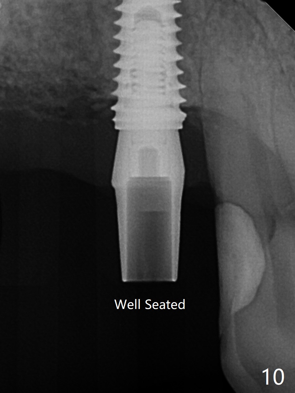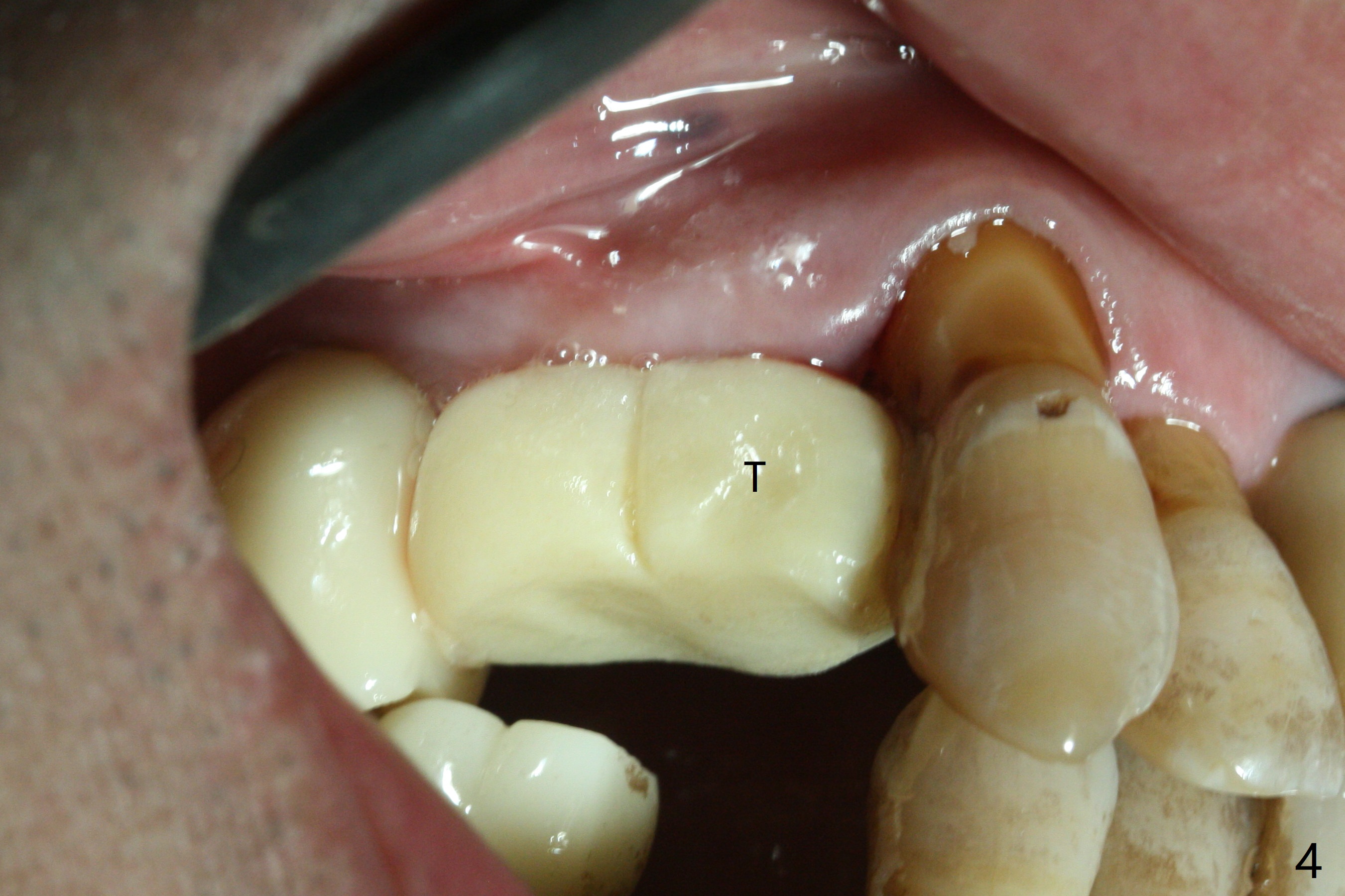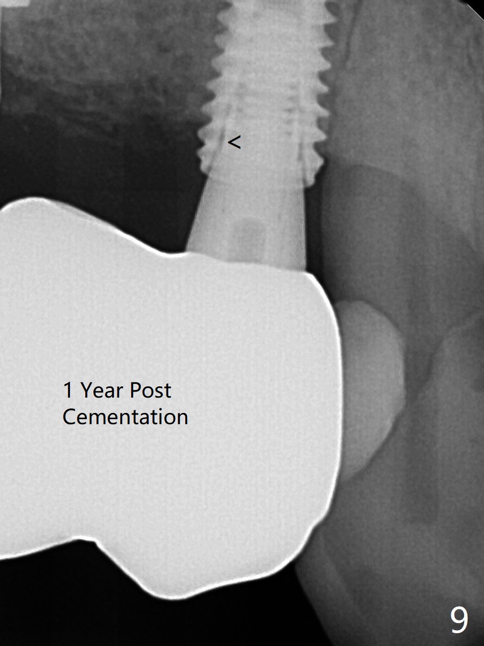Today schedule is to extract the teeth #4 and 5 and place an implant at #5. When the latter is done, it appears that the implant at #15 should be placed at the same appointment (Fig.1). Once an abutment is placed at #5 (Fig.2 A, 5) for temporary crown (Fig.4 T) , the guide may be not seated again unless the crown is removed. Luckily the implant placement at #15 is quick and smooth with the guide (Fig.3,6). The implants seem to be covered by the bone 4 months postop (Fig.7,8). #15 abutment screw needs retightening because of long crown 1.5 months post cementation. Access hole is palatal. There is premature contact in lateral movement. The buccolingual occlusal table is large at #14 and 15. In fact there is more occlusal contact at #14 than #15 in centric occlusion. Tissue level implants should have been placed to reduce implant/abutment loosening. The incomplete abutment seating (Fig.5,7) is noted after retightening the loose cantilever FPD 1 year post cementation (Fig.9 <). After removal of the FPD, the abutment is reseated completely without interference of the proximal contacts (Fig.10).