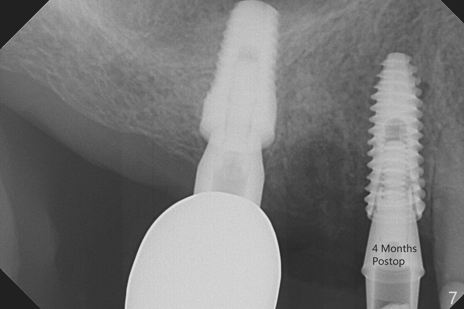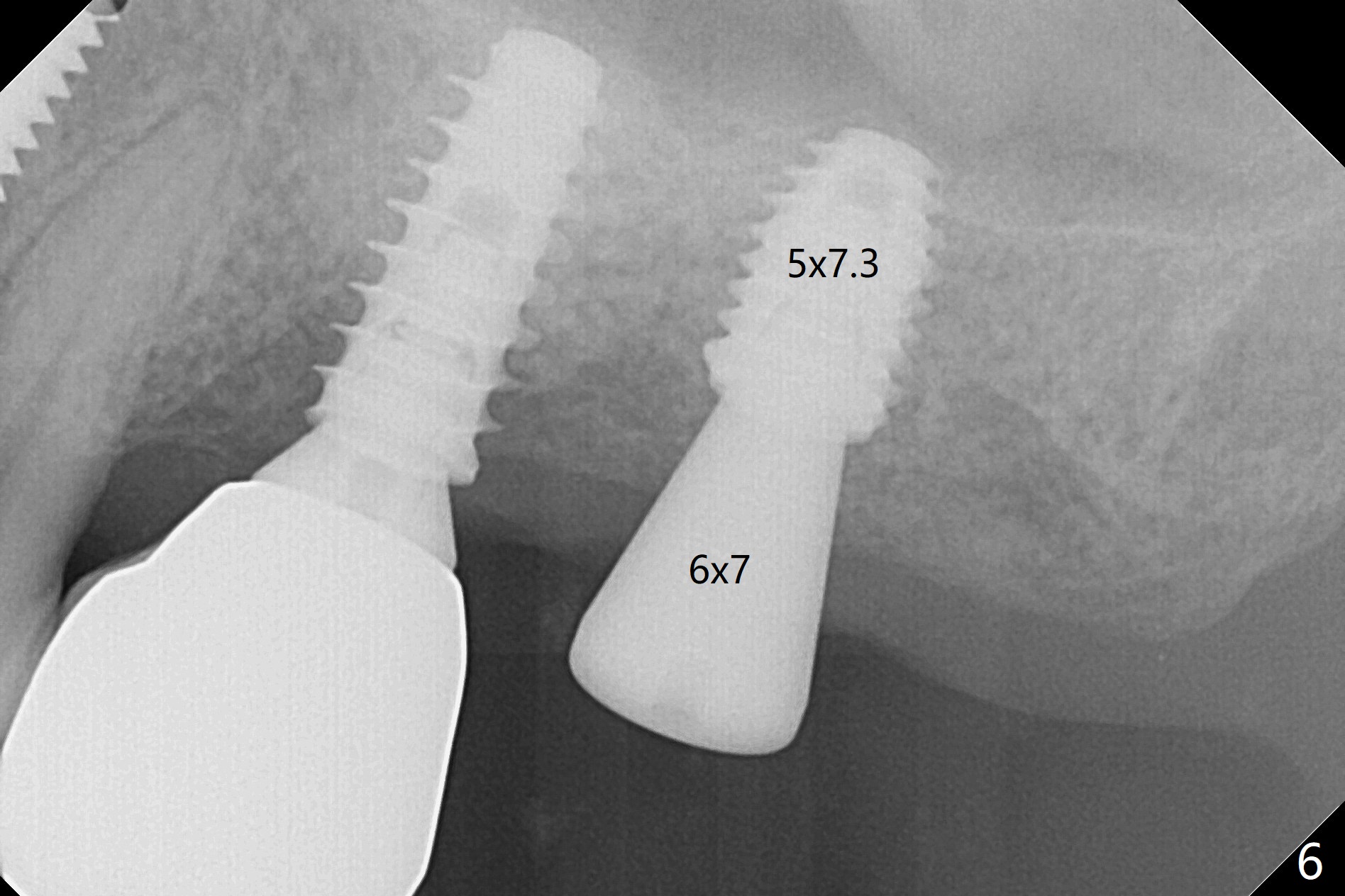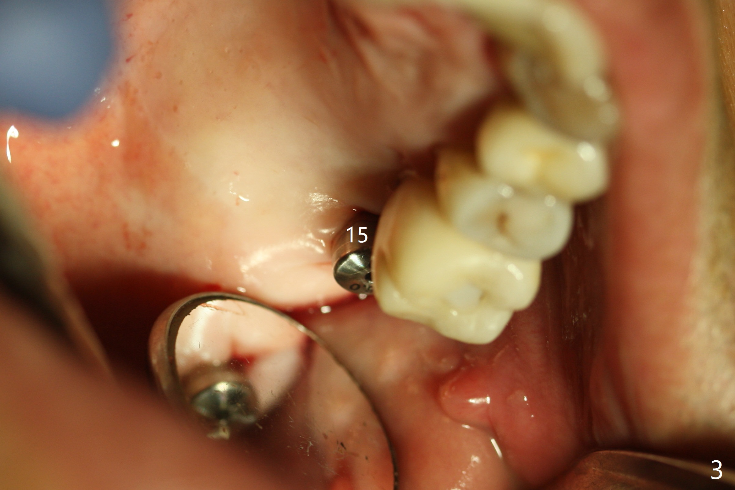 Today schedule is to extract the teeth #4 and 5 and place an implant at #5. When the latter is done, it appears that the implant at #15 should be placed at the same appointment (Fig.1). Once an abutment is placed at #5 (Fig.2 A, 5) for temporary crown (Fig.4 T) , the guide may be not seated again unless the crown is removed. Luckily the implant placement at #15 is quick and smooth with the guide (Fig.3,6). The implants seem to be covered by the bone 4 months postop (Fig.7,8). #15 abutment screw needs retightening because of long crown 1.5 months post cementation. Access hole is palatal. There is premature contact in lateral movement. The buccolingual occlusal table is large at #14 and 15. In fact there is more occlusal contact at #14 than #15 in centric occlusion. Tissue level implants should have been placed to reduce implant/abutment loosening. The incomplete abutment seating (Fig.5,7) is noted after retightening the loose cantilever FPD 1 year post cementation (Fig.9 <). After removal of the FPD, the abutment is reseated completely without interference of the proximal contacts (Fig.10).