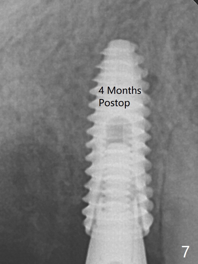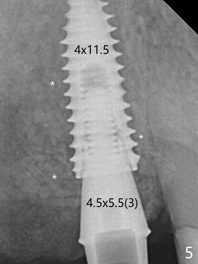 Once an abutment is placed at #5 (Fig.2 A, 5) for temporary crown (Fig.4 T) , the guide may be not seated again unless the crown is removed. Allograft (*) not only covers the exposed implant threads, but also the denuded root surface of the canine. The implant seems to be covered by the bone 4 months postop (Fig.7). In fact the abutment has not been seated completely.