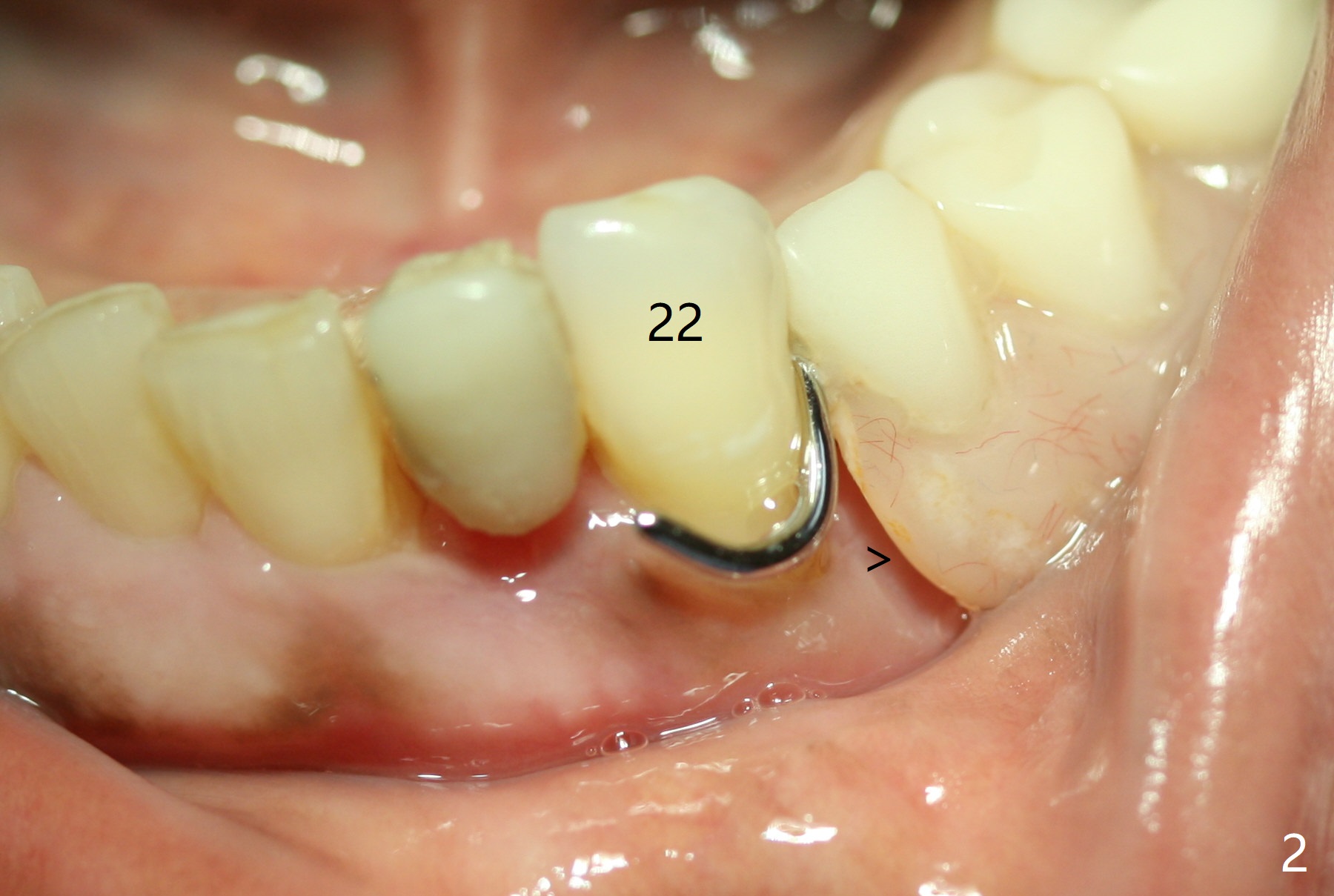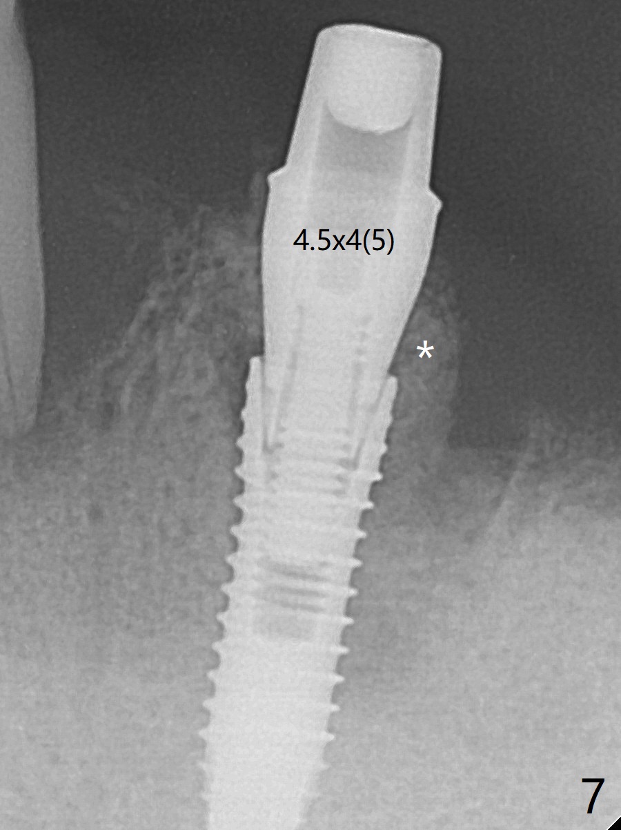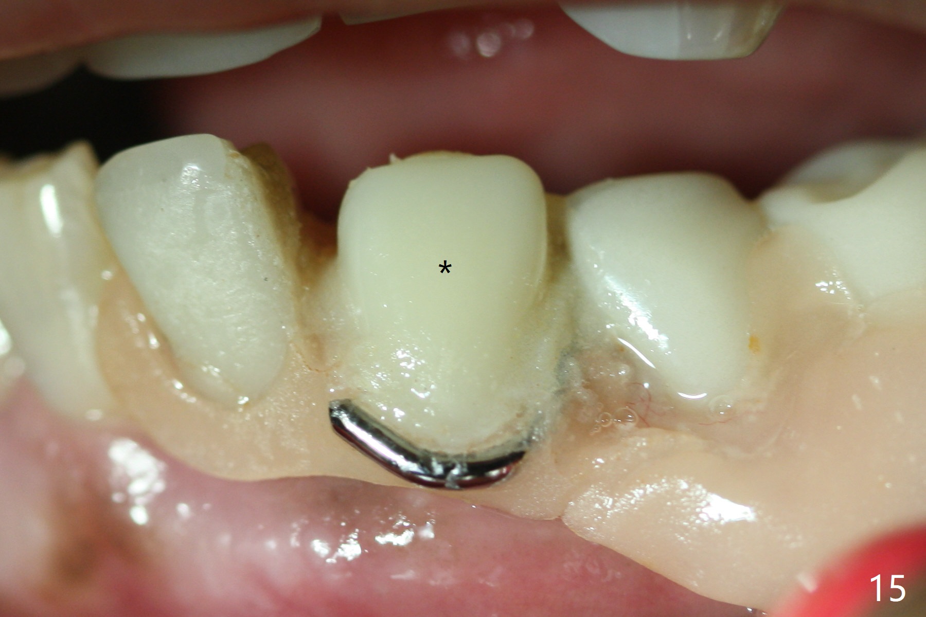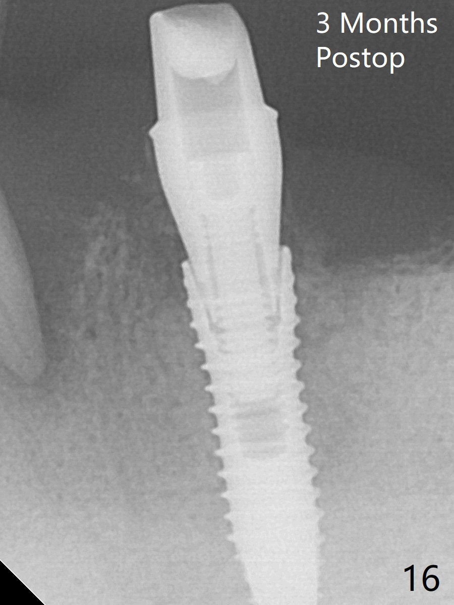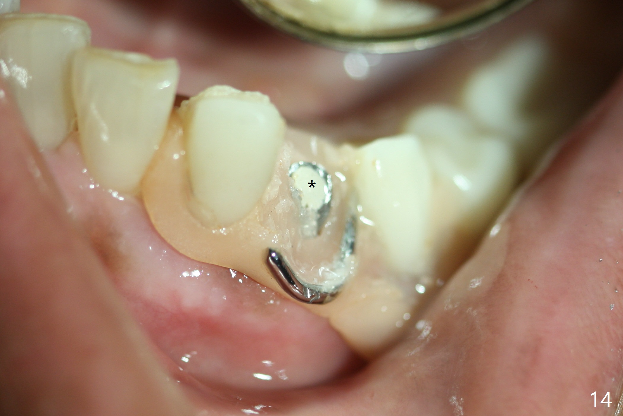 The inflammation around the tooth #22 (Fig.1 *) and mobility may be related to trauma from the only clasp of the lower flipper (Fig.2). The latter is loose with space underneath (>) and laterally (Fig.3 *). The distobuccal plate is defective upon extraction; the osteotomy is initiated in the mesiolingual slope of the socket (Fig.4) with ~ 6 mm native bone. When a 3.8x15 mm dummy implant achieves insertion torque of 50 Ncm, the insertion is incomplete with apical space (Fig.5 *). The definitive implant (3.8x13 mm) closes the apical space and obtains insertion torque >55 Ncm; a ball abutment with 2 mm cuff seems to be short for retention (Fig.6). A 4.5x4(5) mm cemented abutment (Fig.7,8) seems appropriate for retention after soft reline of the lower flipper (Fig.9-11). The socket heals without bone graft exposure 8 days postop (Fig.12,13). To satisfy the patient's desire to have a white tooth, the buccal portion of the soft reline and the abutment is removed (Fig.14) and a crown form is added (Fig.15 *). The socket obliterates 3 months postop (Fig.16).