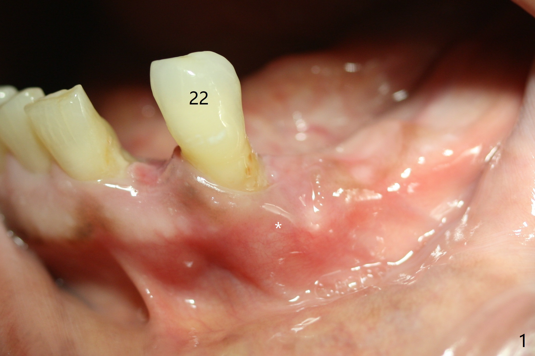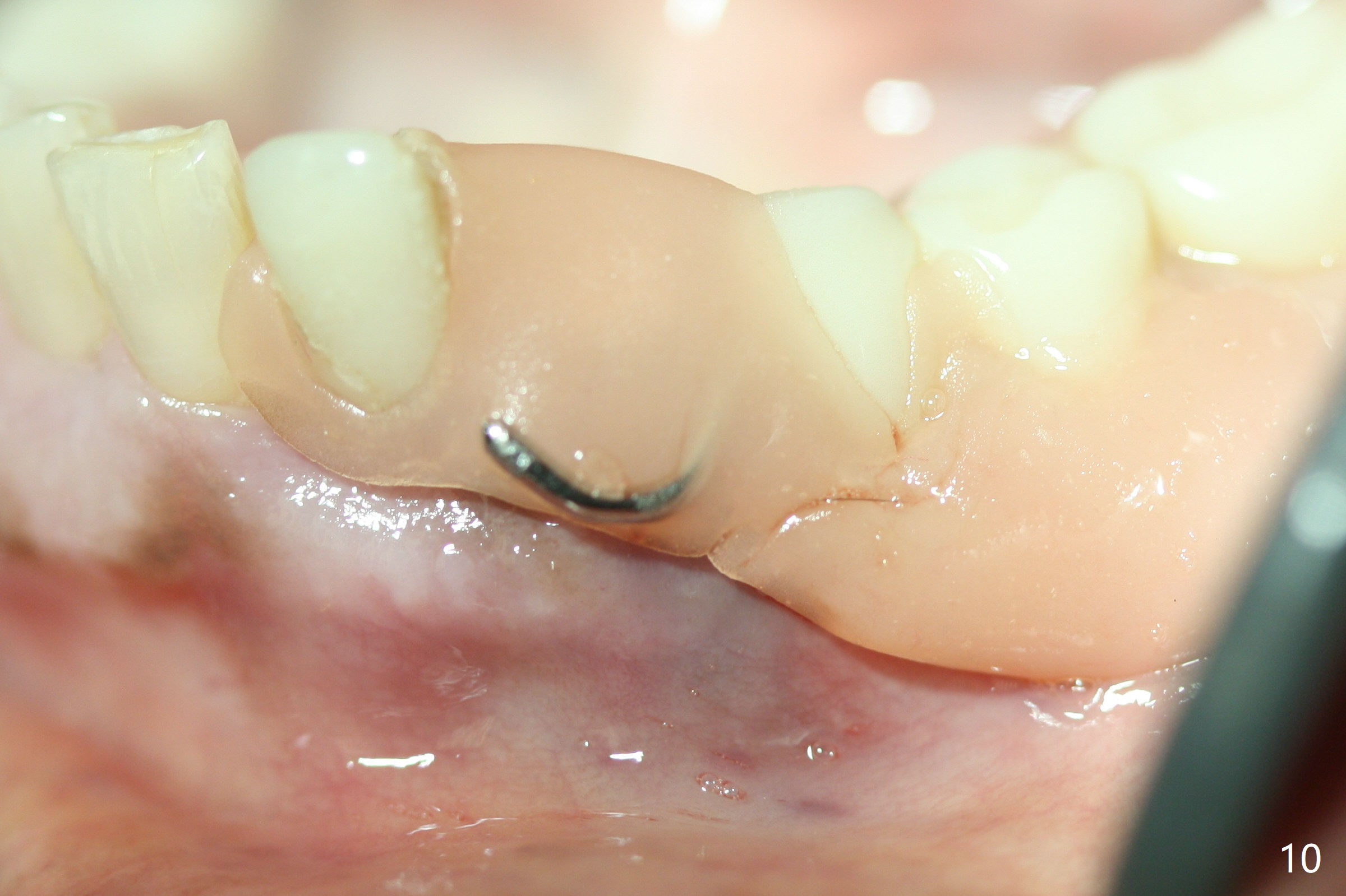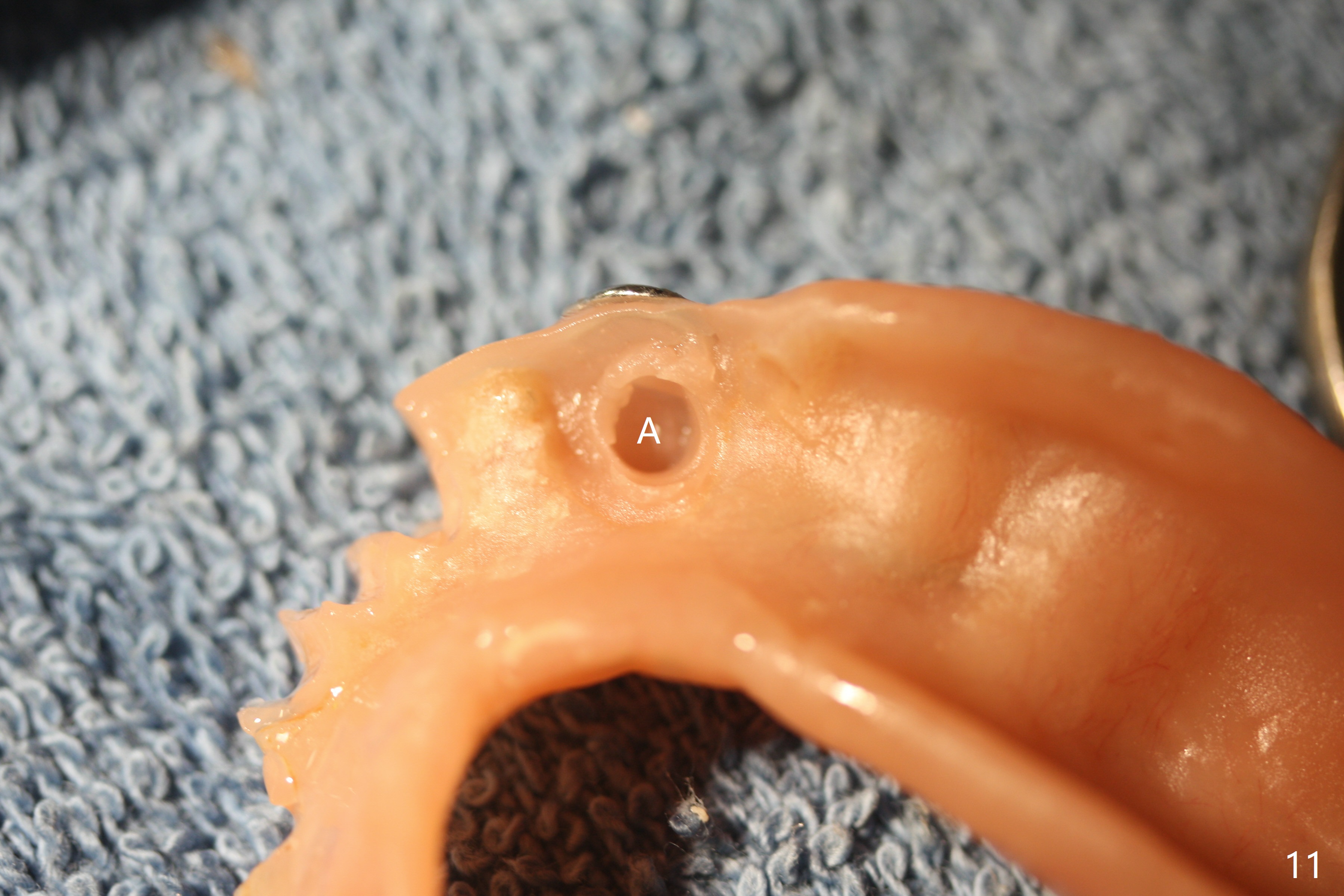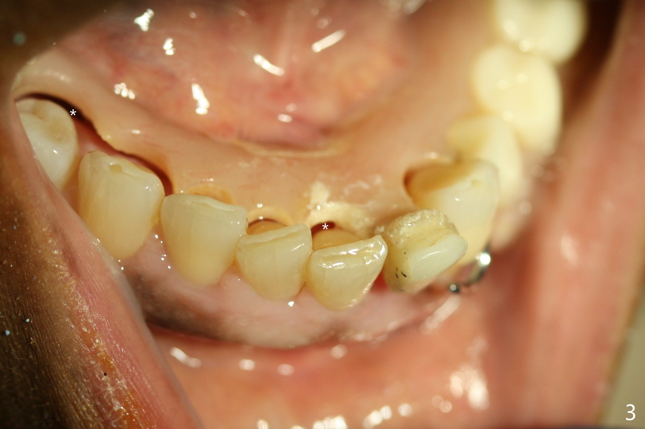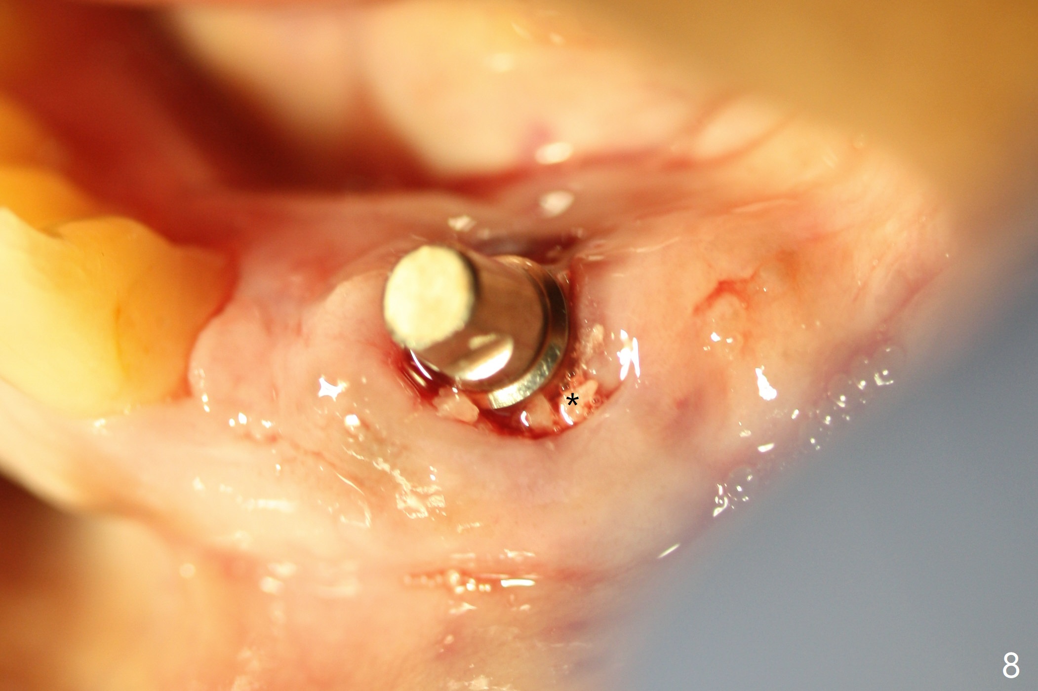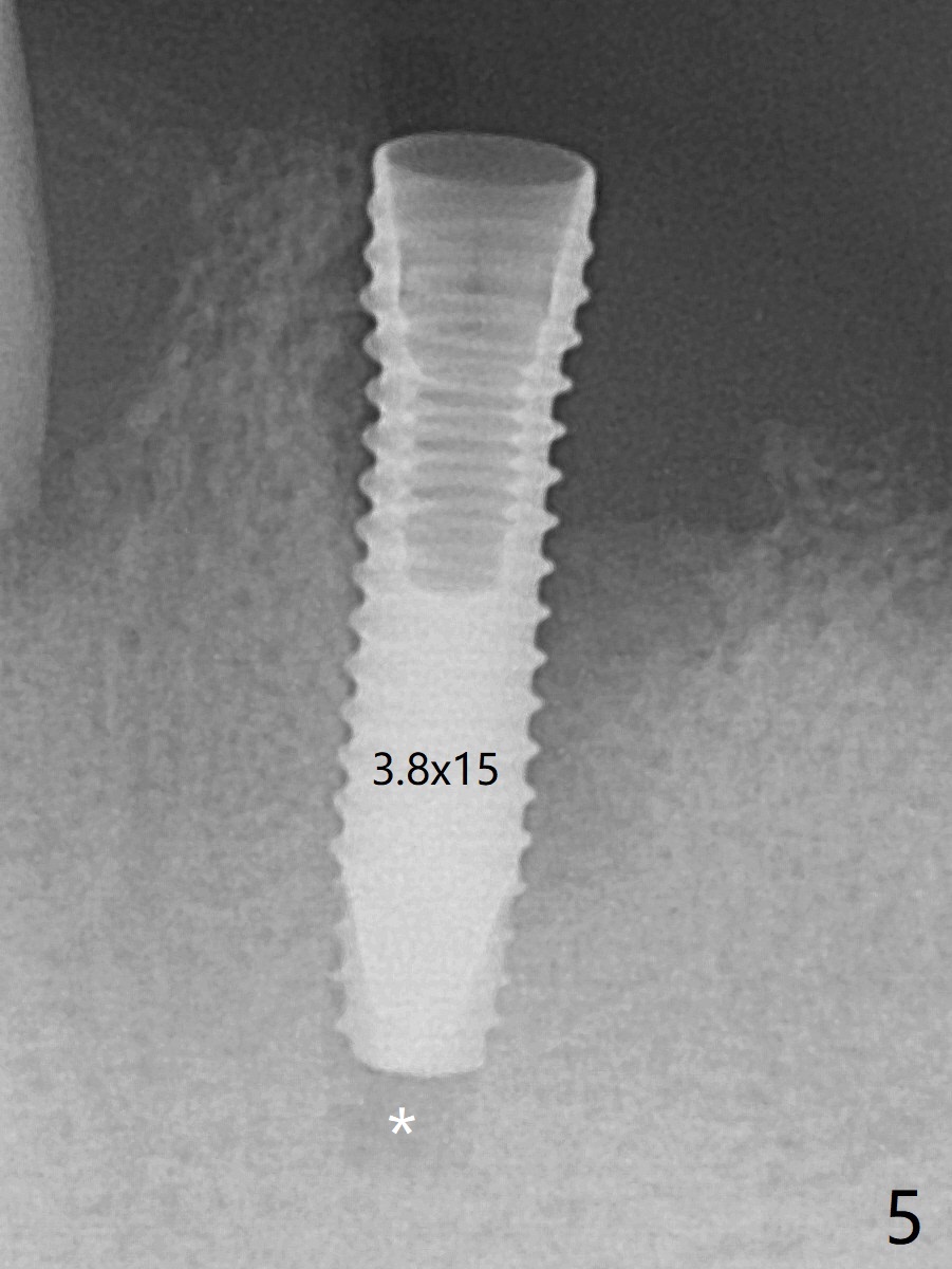 The inflammation around the tooth #22 (Fig.1 *) and mobility may be related to trauma from the only clasp of the lower flipper (Fig.2). The latter is loose with space underneath (>) and laterally (Fig.3 *). The distobuccal plate is defective upon extraction; the osteotomy is initiated in the mesiolingual slope of the socket (Fig.4) with ~ 6 mm native bone. When a 3.8x15 mm dummy implant achieves insertion torque of 50 Ncm, the insertion is incomplete with apical space (Fig.5 *). The definitive implant (3.8x13 mm) closes the apical space and obtains insertion torque >55 Ncm; a ball abutment with 2 mm cuff seems to be short for retention (Fig.6). A 4.5x4(5) mm cemented abutment (Fig.7,8) seems appropriate for retention after soft reline of the lower flipper (Fig.9-11). The socket heals without bone graft exposure 8 days postop (Fig.12,13). To satisfy the patient's desire to have a white tooth, the buccal portion of the soft reline and the abutment is removed (Fig.14) and a crown form is added (Fig.15 *). The socket obliterates 3 months postop (Fig.16).
