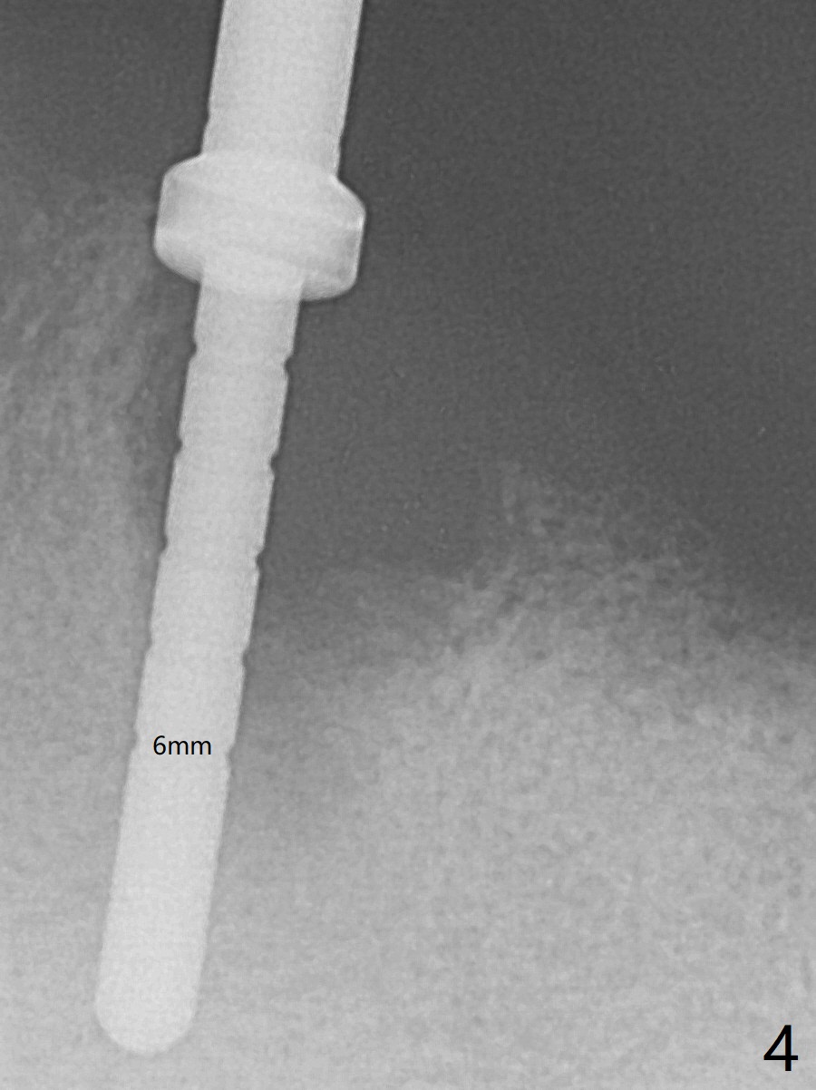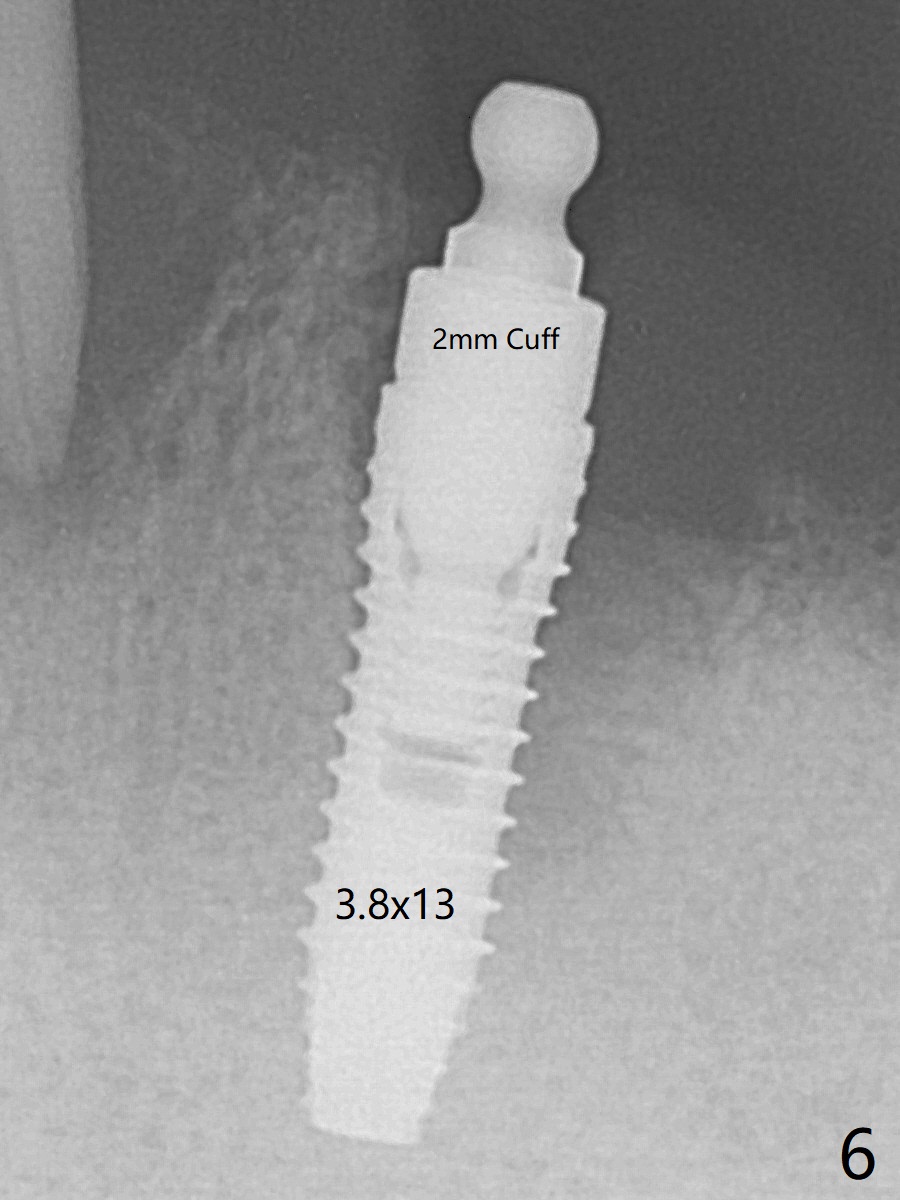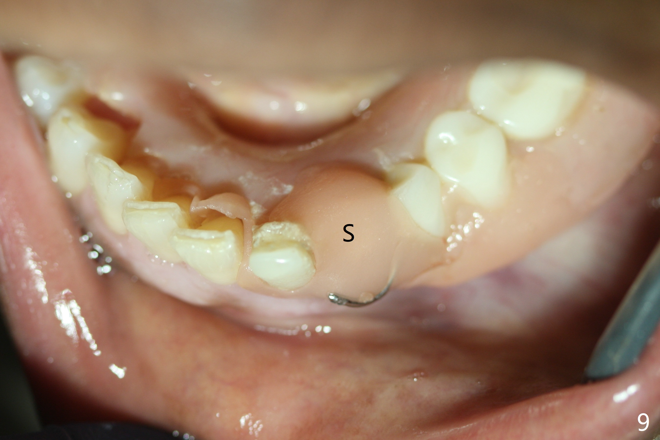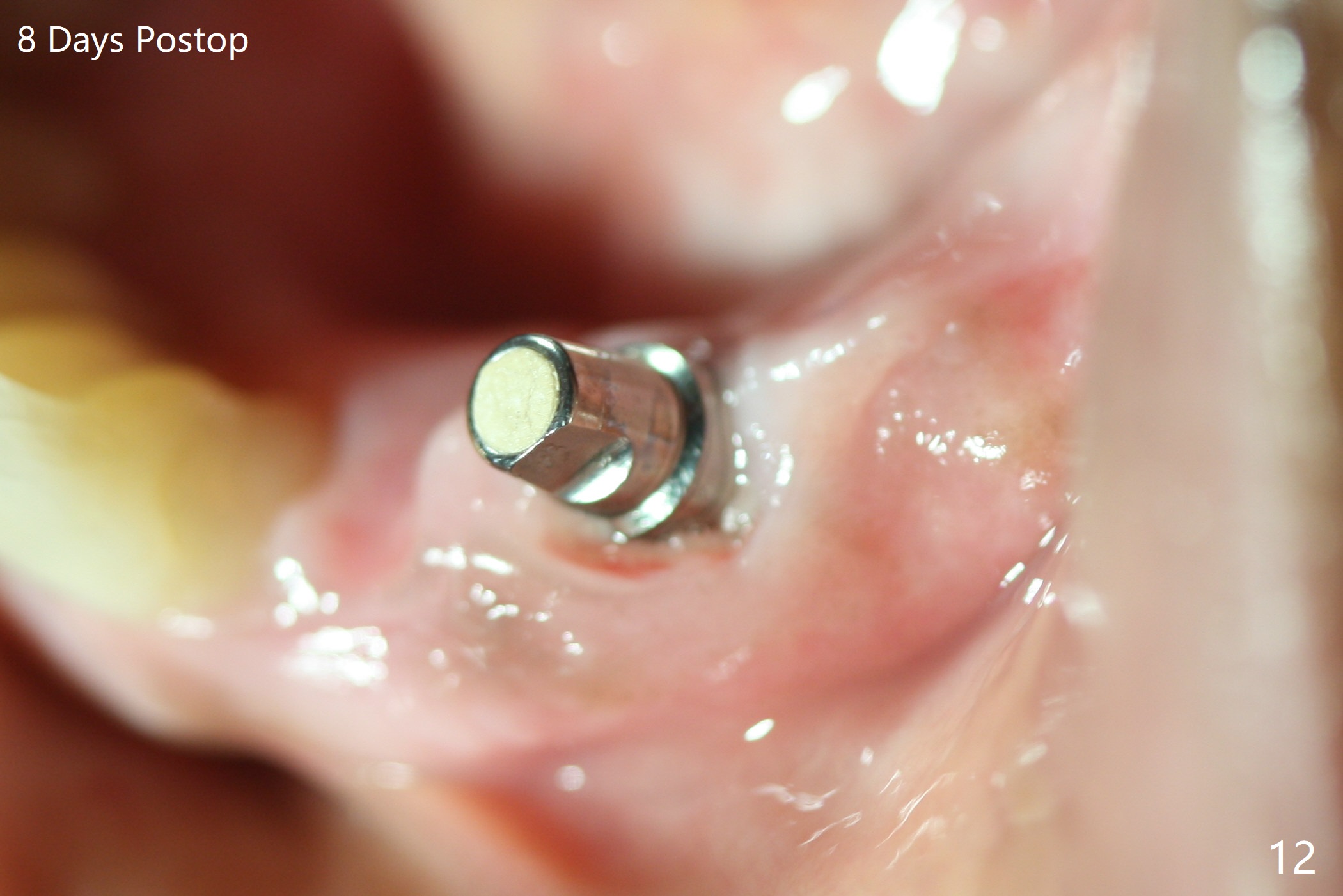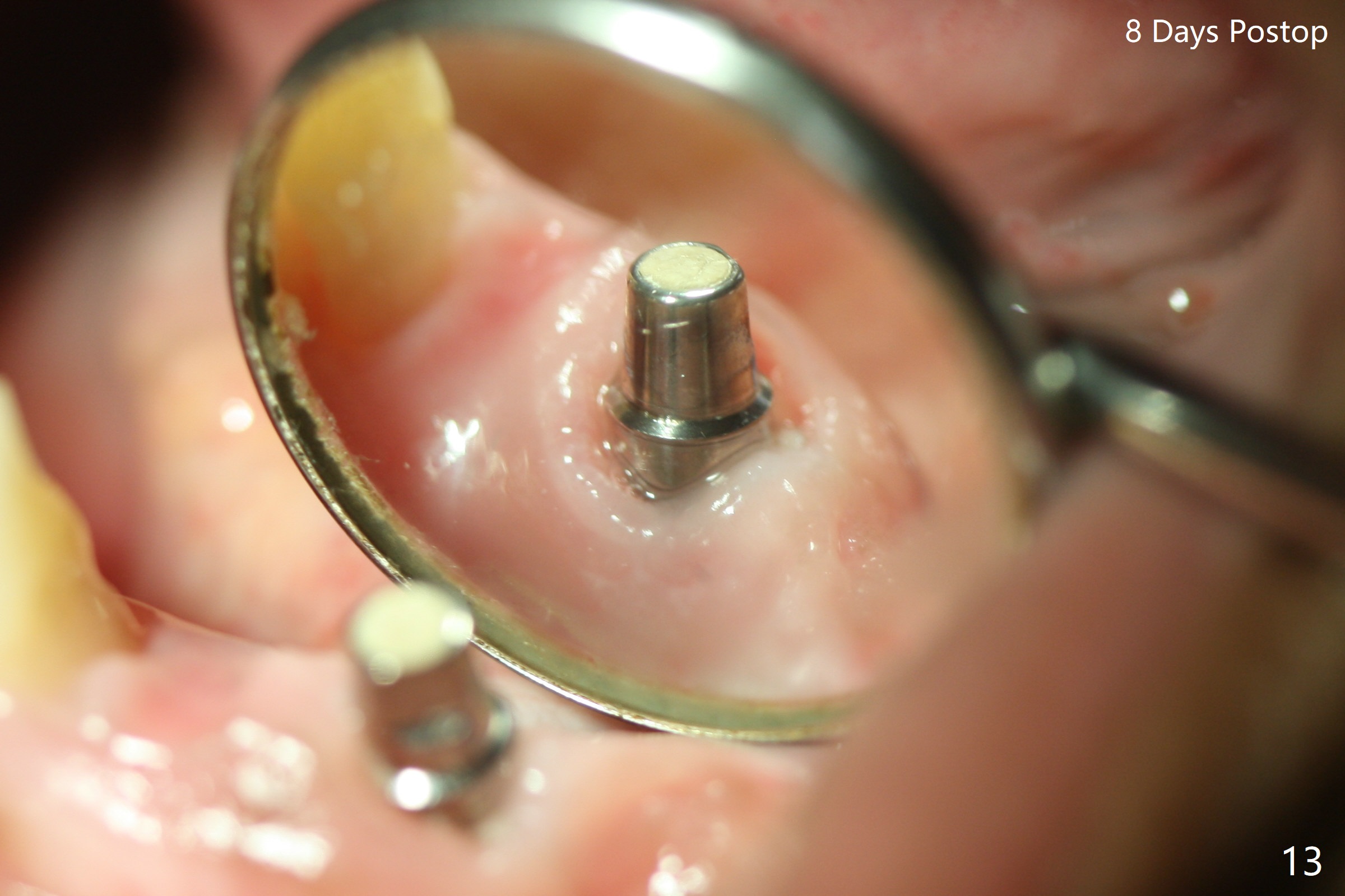 The inflammation around the tooth #22 (Fig.1 *) and mobility may be related to trauma from the only clasp of the lower flipper (Fig.2). The latter is loose with space underneath (>) and laterally (Fig.3 *). The distobuccal plate is defective upon extraction; the osteotomy is initiated in the mesiolingual slope of the socket (Fig.4) with ~ 6 mm native bone. When a 3.8x15 mm dummy implant achieves insertion torque of 50 Ncm, the insertion is incomplete with apical space (Fig.5 *). The definitive implant (3.8x13 mm) closes the apical space and obtains insertion torque >55 Ncm; a ball abutment with 2 mm cuff seems to be short for retention (Fig.6). A 4.5x4(5) mm cemented abutment (Fig.7,8) seems appropriate for retention after soft reline of the lower flipper (Fig.9-11). The socket heals without bone graft exposure 8 days postop (Fig.12,13). To satisfy the patient's desire to have a white tooth, the buccal portion of the soft reline and the abutment is removed (Fig.14) and a crown form is added (Fig.15 *). The socket obliterates 3 months postop (Fig.16).