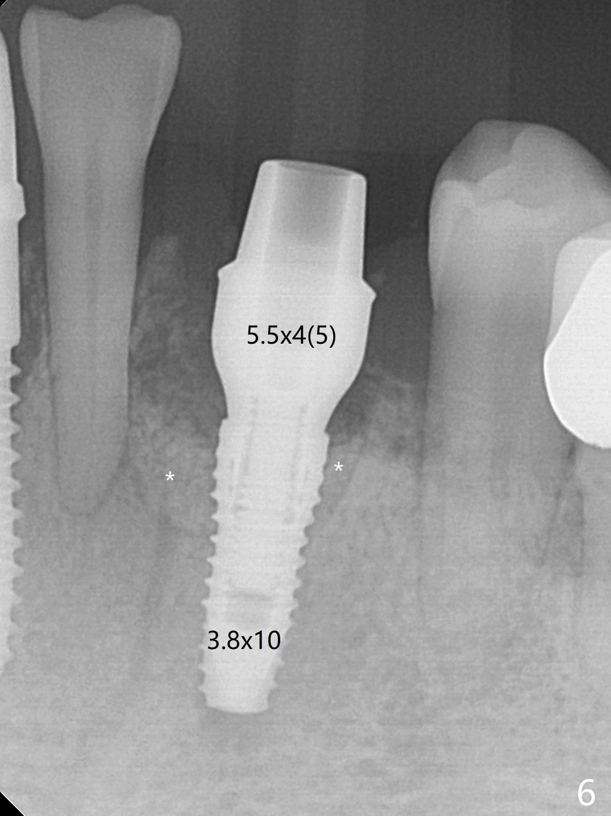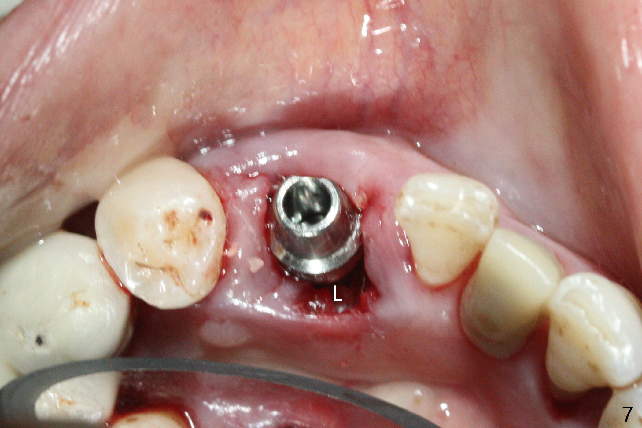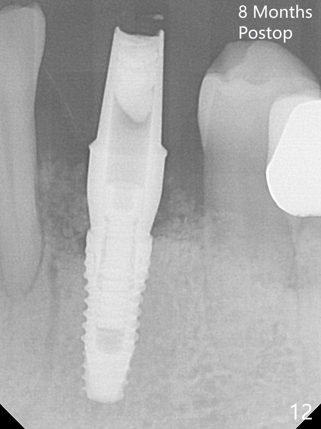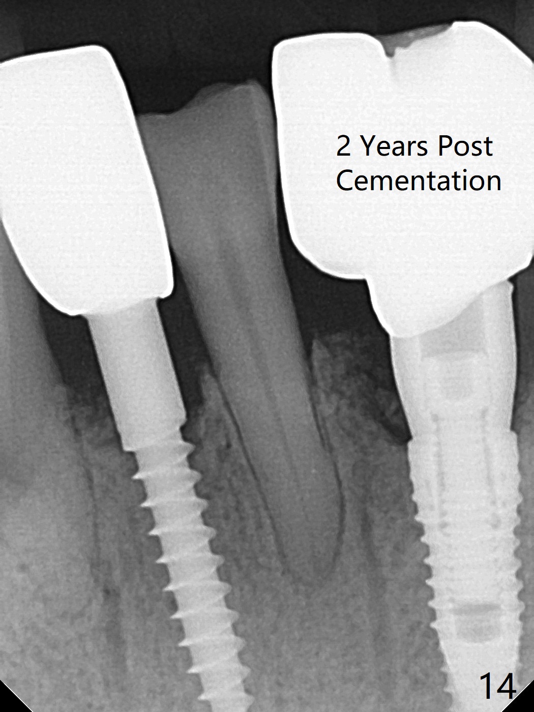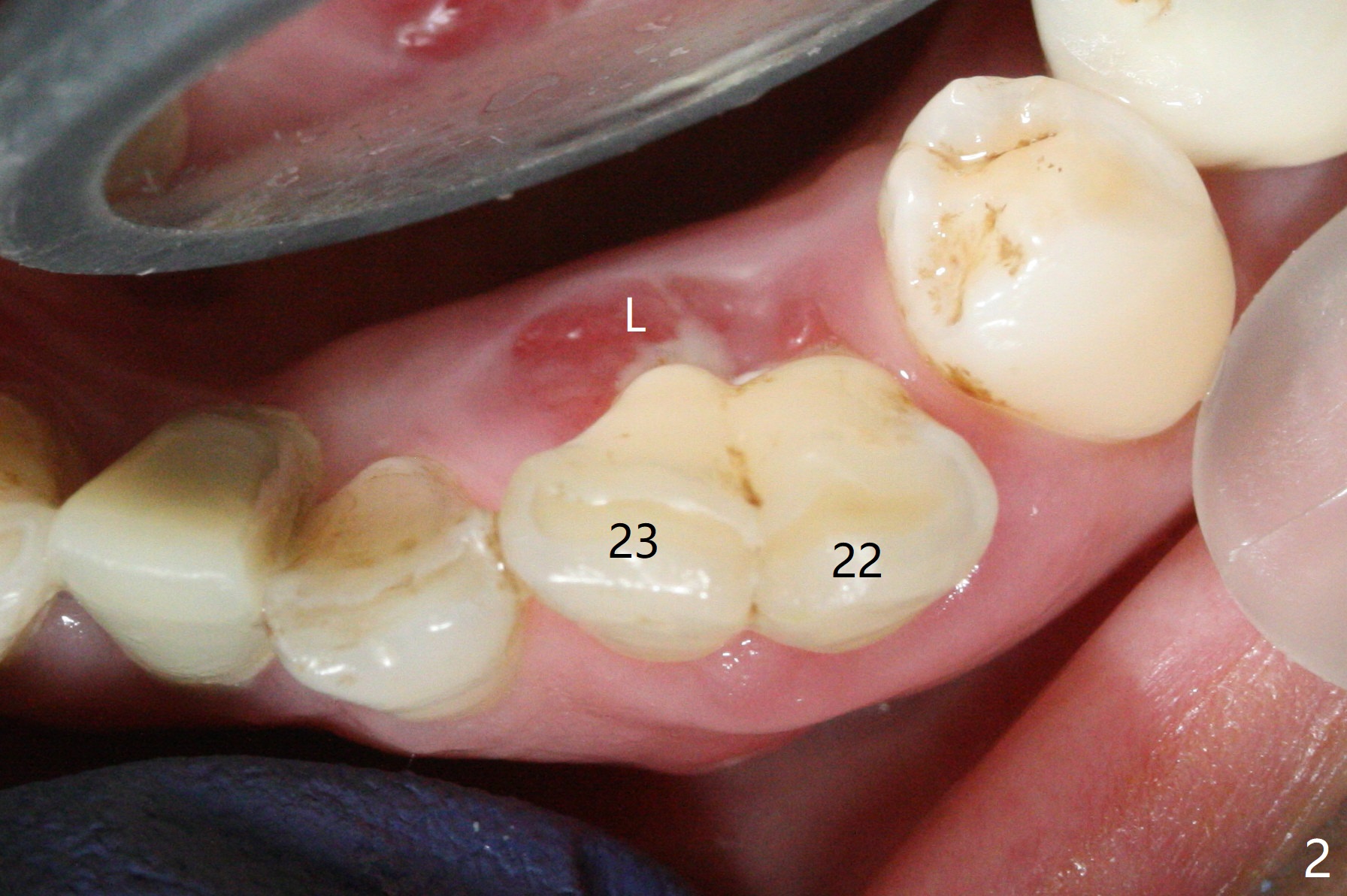 There is a fistula buccal to the apex of the tooth #23 preoperatively (Fig.1), which is related to loss of the buccal plate of the socket of #23. Therefore an implant is placed mainly in the socket of #22 (Fig.3). The lingual (Fig.2 L) gingiva appears to have more extensive inflammation. After extraction, the lingual (Fig.3 L) gingival margin is significantly lower than the buccal one. The lingual crest is ~ 4 mm lower than the buccal one. A 3.8x10 mm dummy implant is placed tentatively with an apical space (Fig.4). When a same dimension definitive implant is placed with 40 Ncm, it is 2 mm below the lingual gingival margin, whereas 6-7 mm below the buccal one (Fig.5). Vanilla graft is placed before placement of a 5.5x4(5) mm abutment (Fig.6,7). There is a 2-3 mm lingual (L) gap to be filled with the allograft secondarily to prevent periimplantitis (Fig.7). Later the abutment is changed to a longer and smaller one (Fig.8) with more of the allograft (*). After trimming of the abutment (Fig.9 (*: papilla between the fused teeth)), an immediate provisional is fabricated to close the socket (Fig.10, similar to Fig.1). The majority of the bone graft seems to be in place 8 months postop (Fig.12). The implant appears to have been placed buccal, consistent with the thin and slightly erythematous buccal gingiva (Fig.13). The ridge completely regenerates 2 years post cementation (Fig.14).